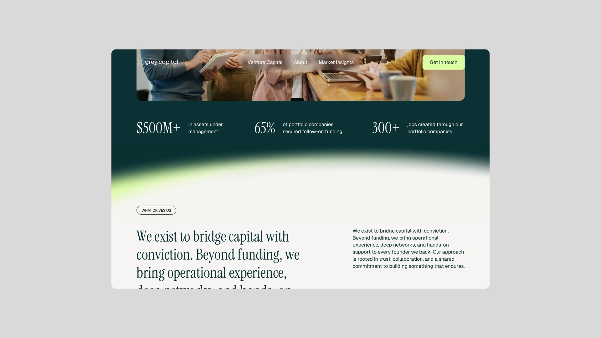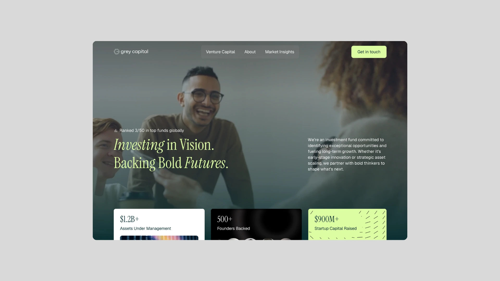 Grey Capital needed a digital presence that matched its ambition: a $1.2B investment firm that has backed over 500 founders, helped raise $900M+ in startup capital, and operates across venture, private equity, and asset management — all with a distinctly bold, founder-obsessed philosophy.