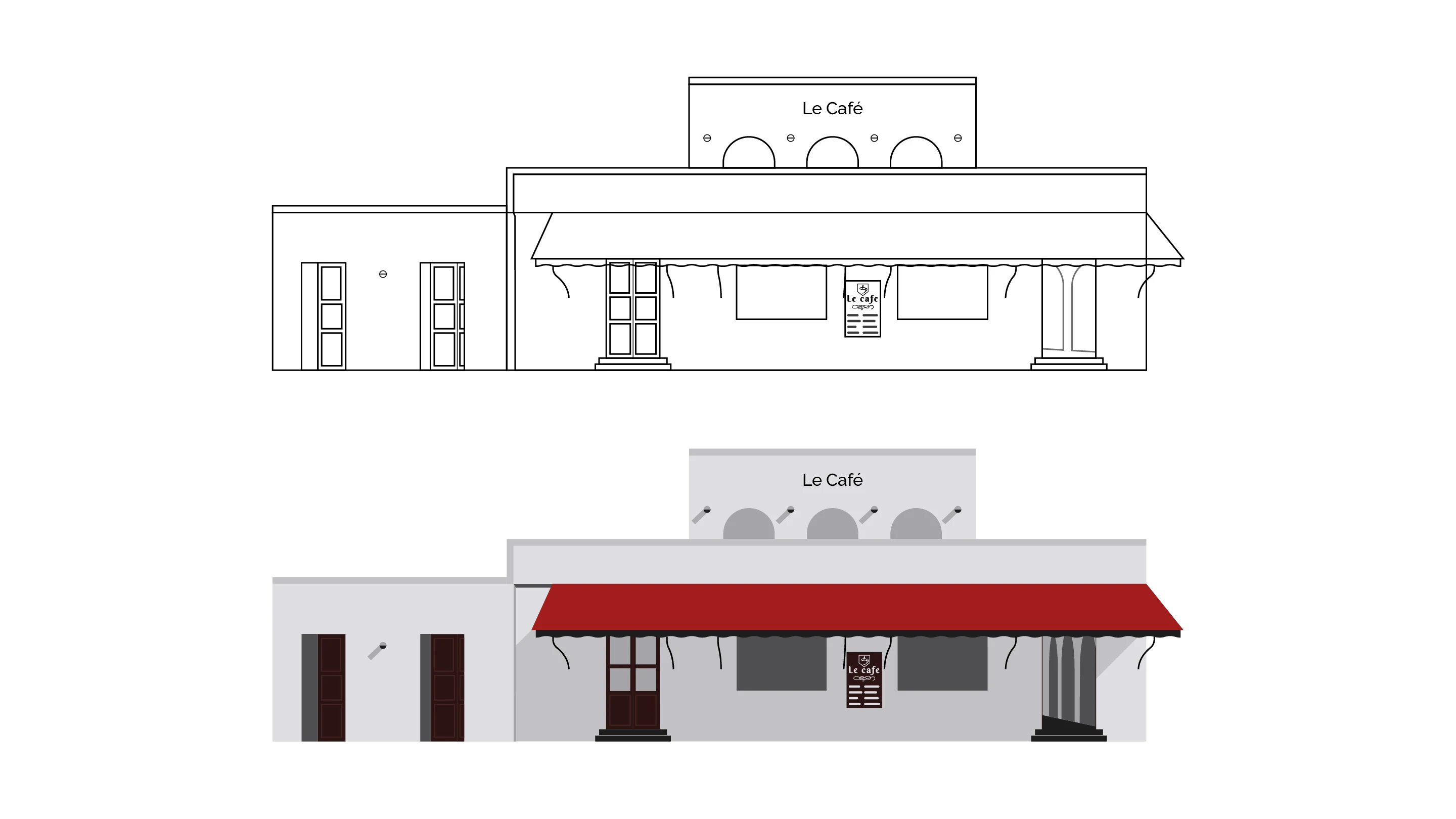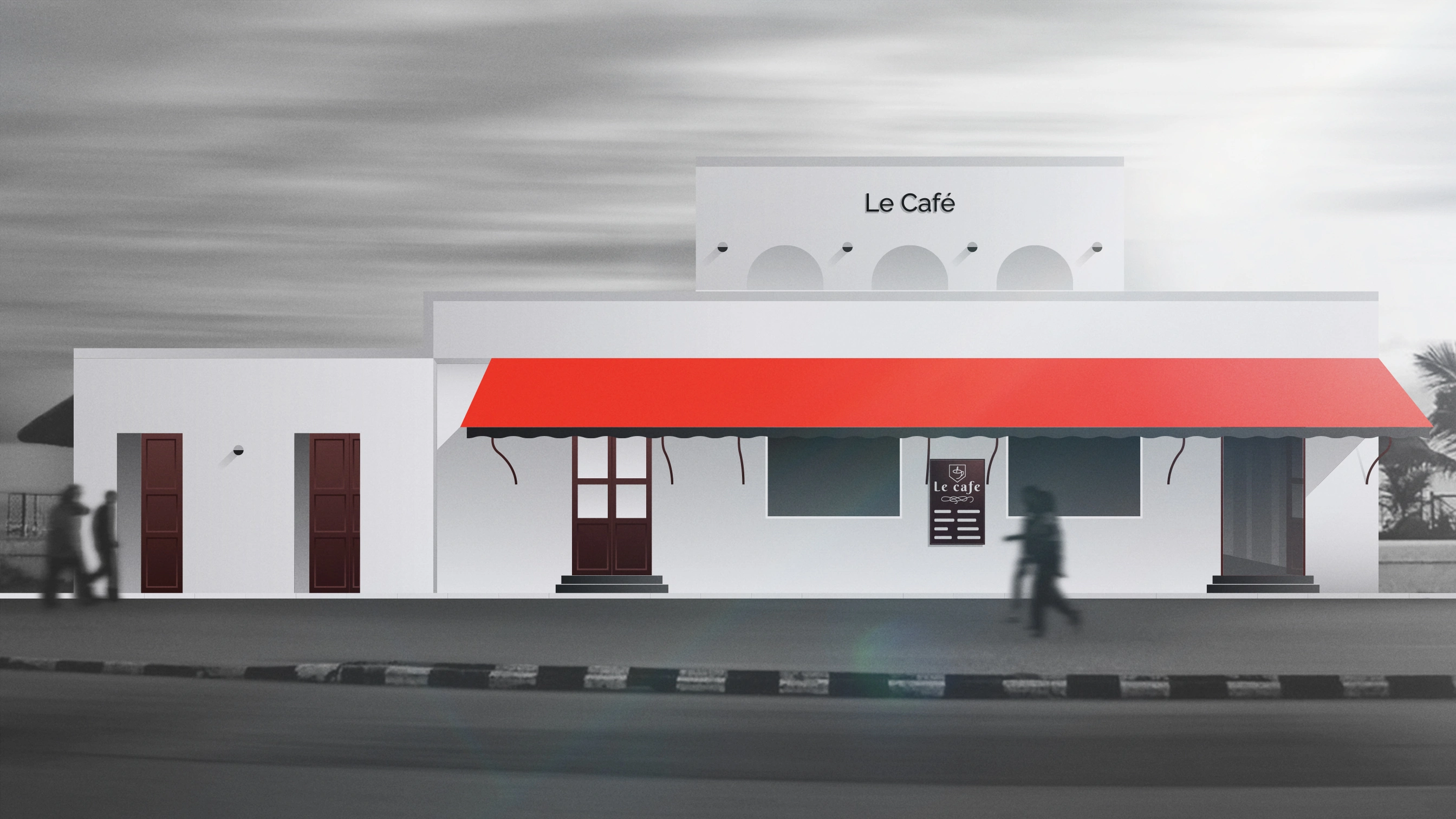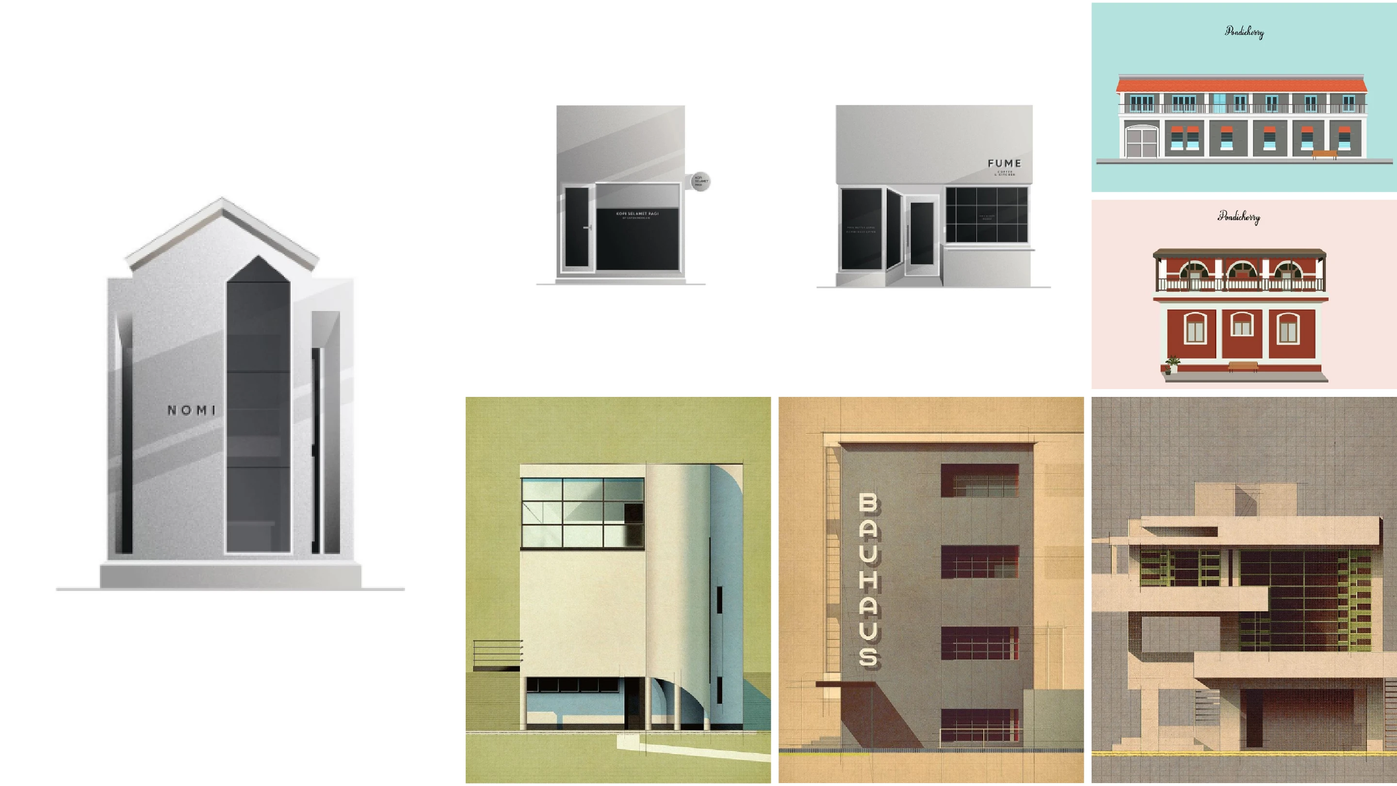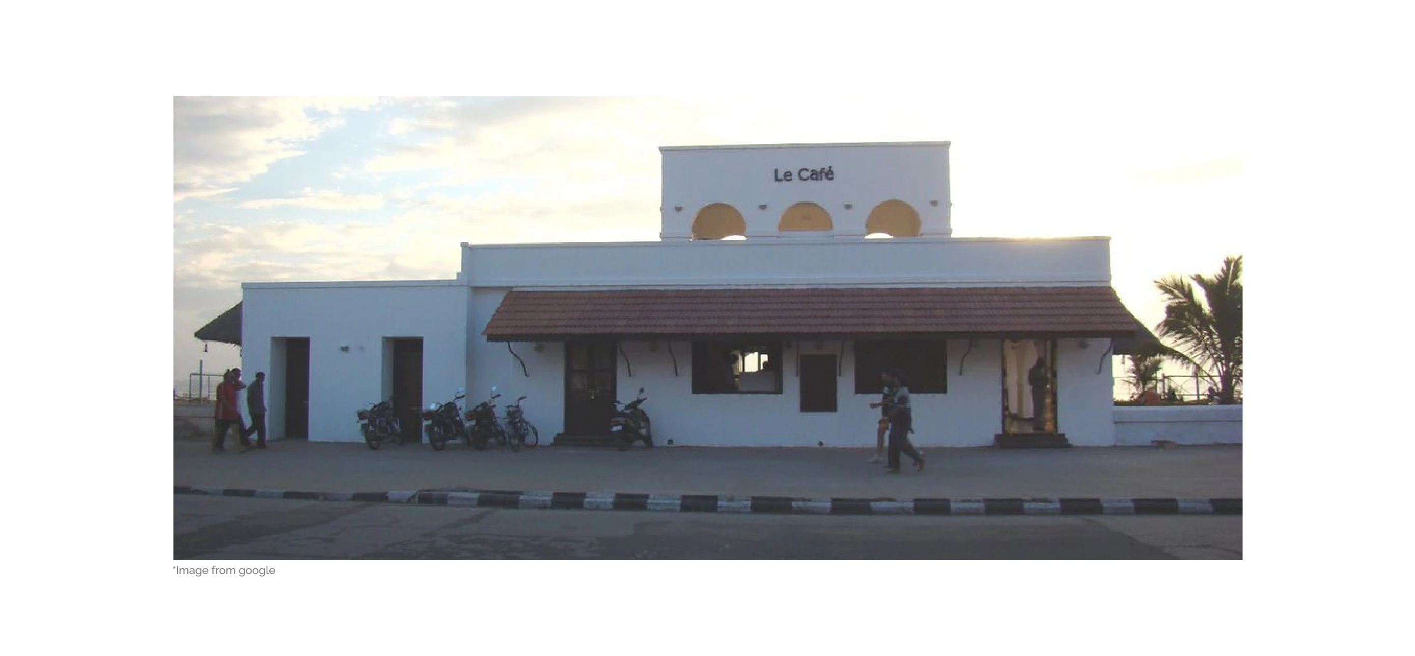 A minimalist architectural illustration of the Le Café building in Pondicherry.