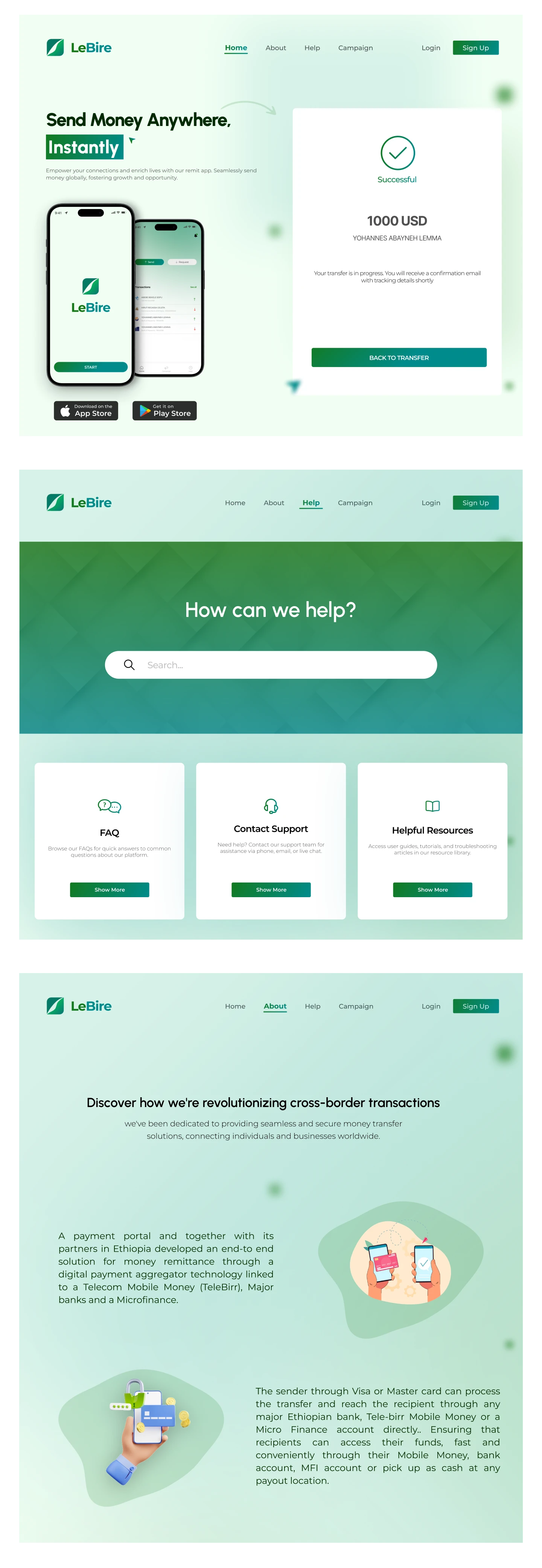 LeBire is a remittance service designed to help users send and receive money quickly, securely, and affordably across borders. My task was to design a conversion-focused landing page that communicates trust, highlights key benefits, and drives sign-ups/downloads.