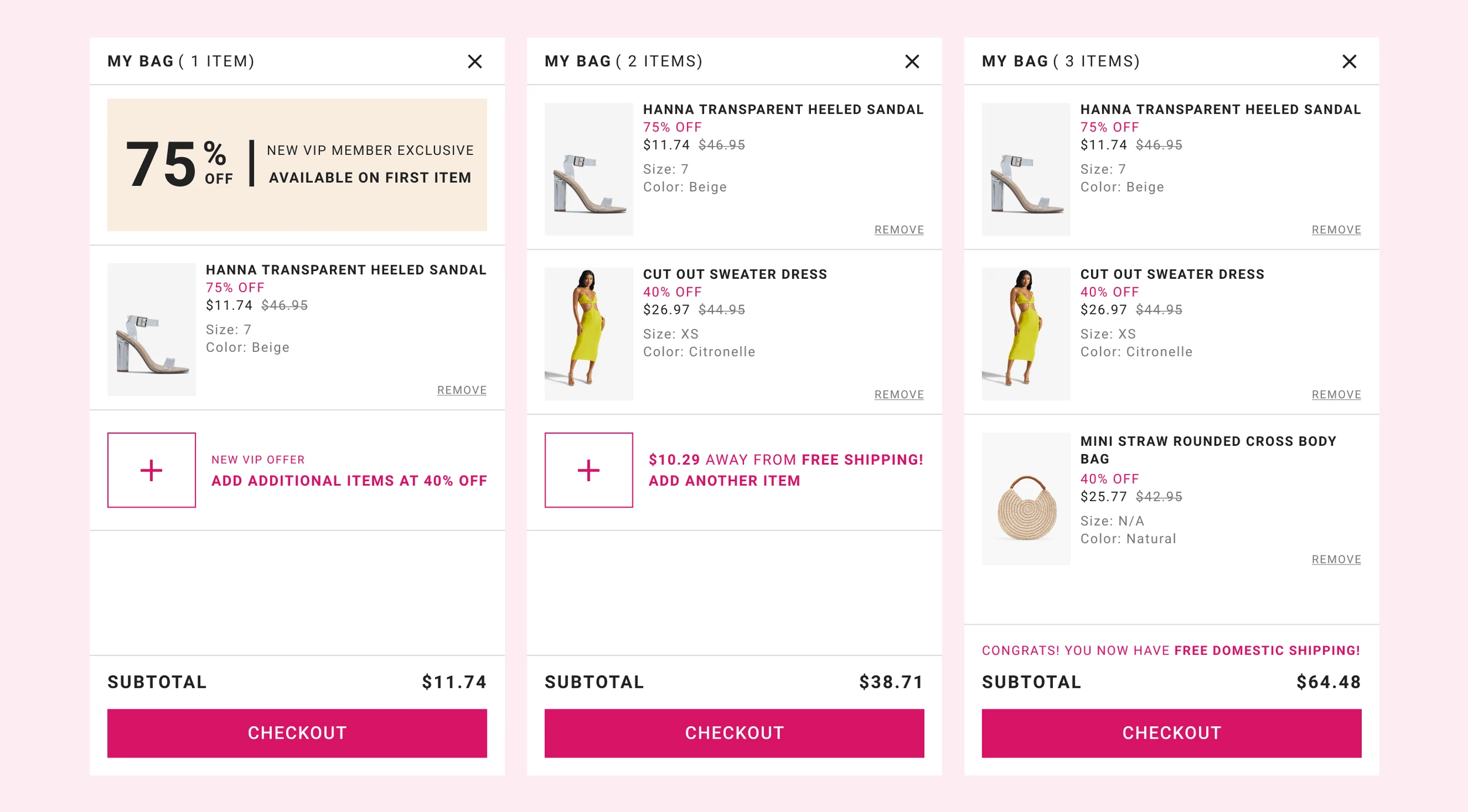 Our current acquisition team struggled to improve the current lead to VIP conversion rate. The business was looking for solutions to replace the current add-to-bag and upsell interstitial we had for Shoedazzle. They requested a mini-cart as a replacement since this concept worked for other brands such as Savage x Fenty & Fabkids.