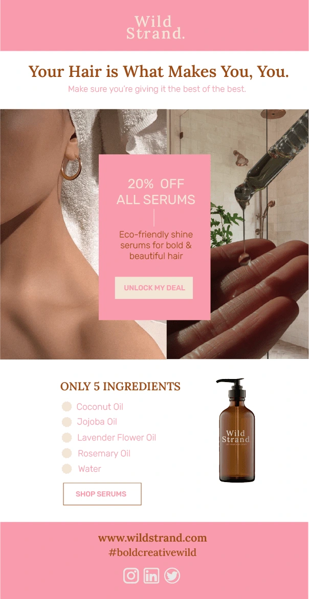 Created brand identity, packaging, and email design for a conceptual hair care brand focused on sustainability.