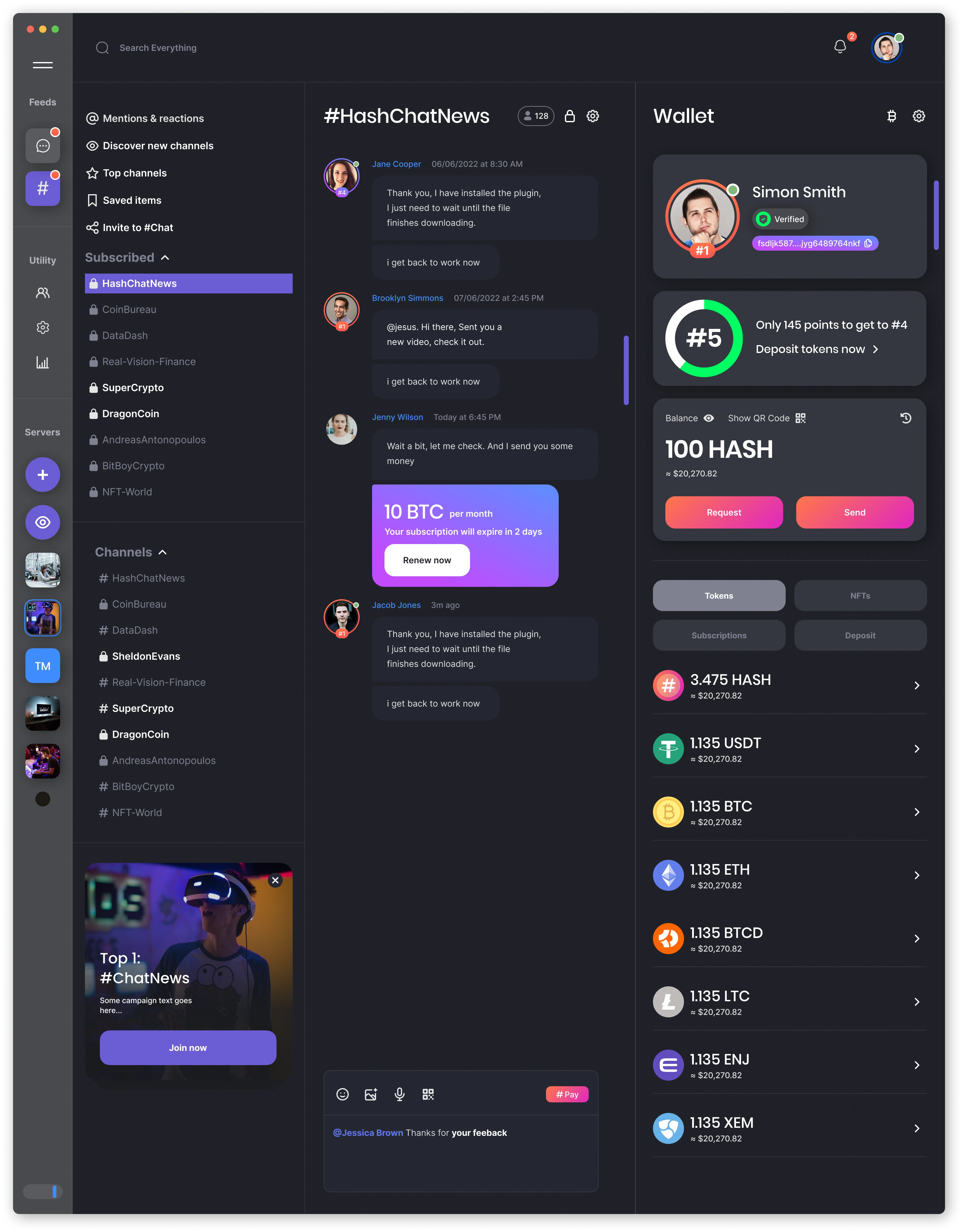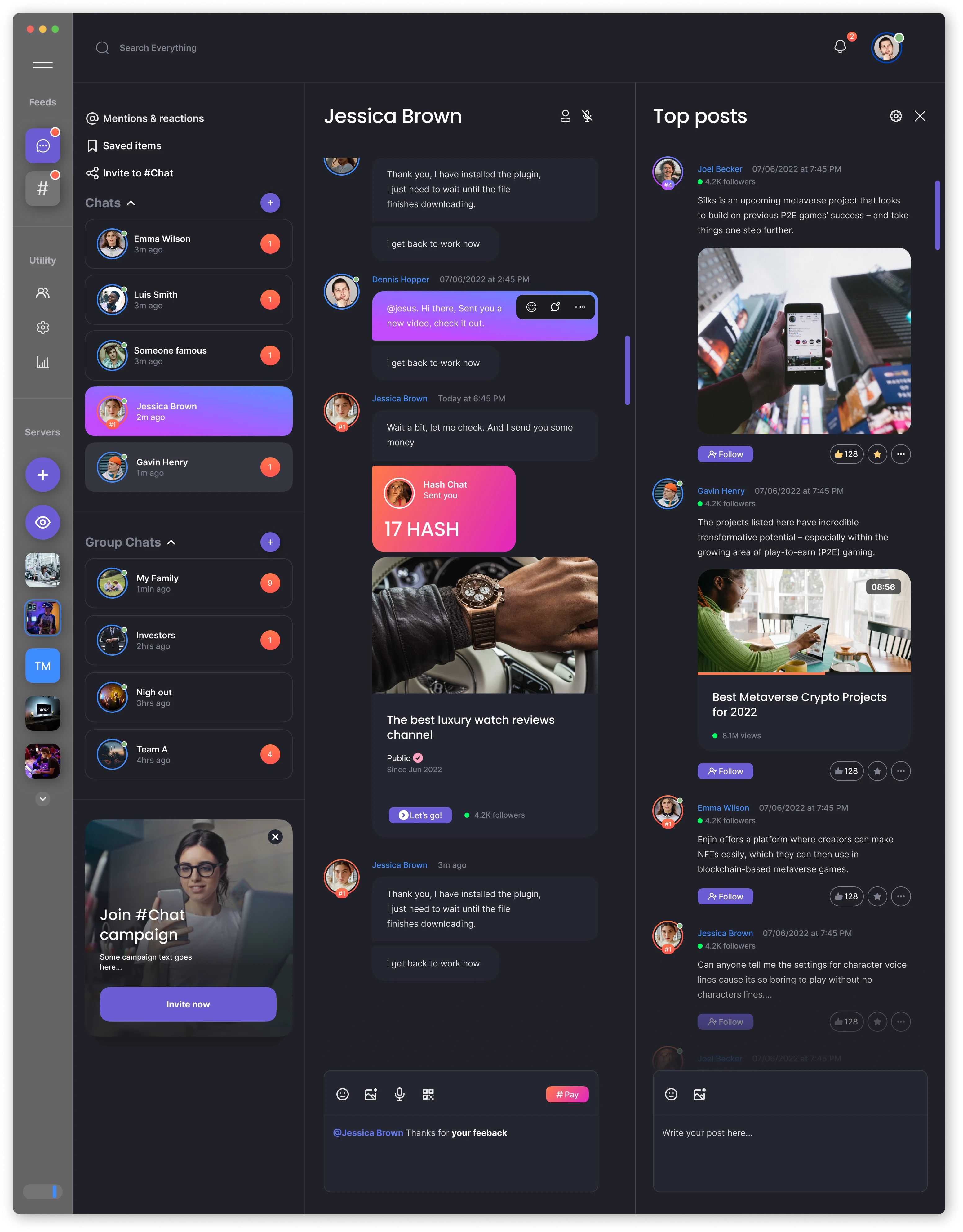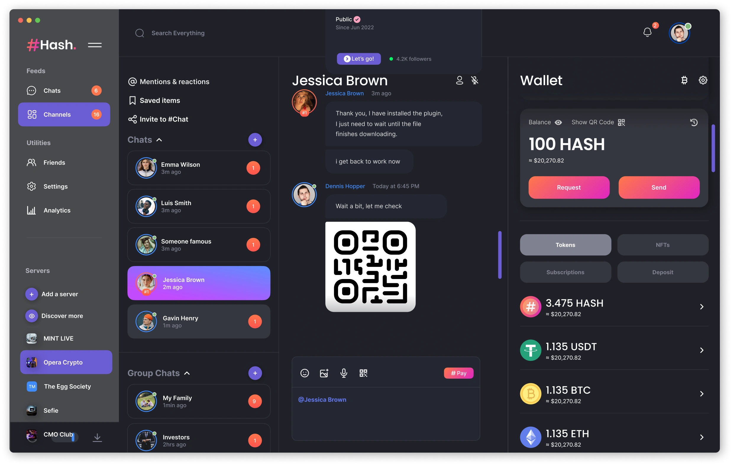 Deliver a fast, familiar chat experience across desktop and mobile, integrating wallet and P2P transfers without breaking the conversation flow. Ship a time‑boxed MVP from scratch, covering the core flows—messages, channels, social feed, and wallet send/request/confirm—with production‑ready UI. Establish a lean component library that covers only missing and high‑leverage patterns to accelerate delivery and ensure visual and behavioral consistency, rather than building a full‑scale design system. Align design decisions to business outcomes by reducing time‑to‑first transfer and increasing wallet activation while upholding accessibility and a robust dark theme. Desktop‑first delivery with mobile parity for key wallet and P2P actions.