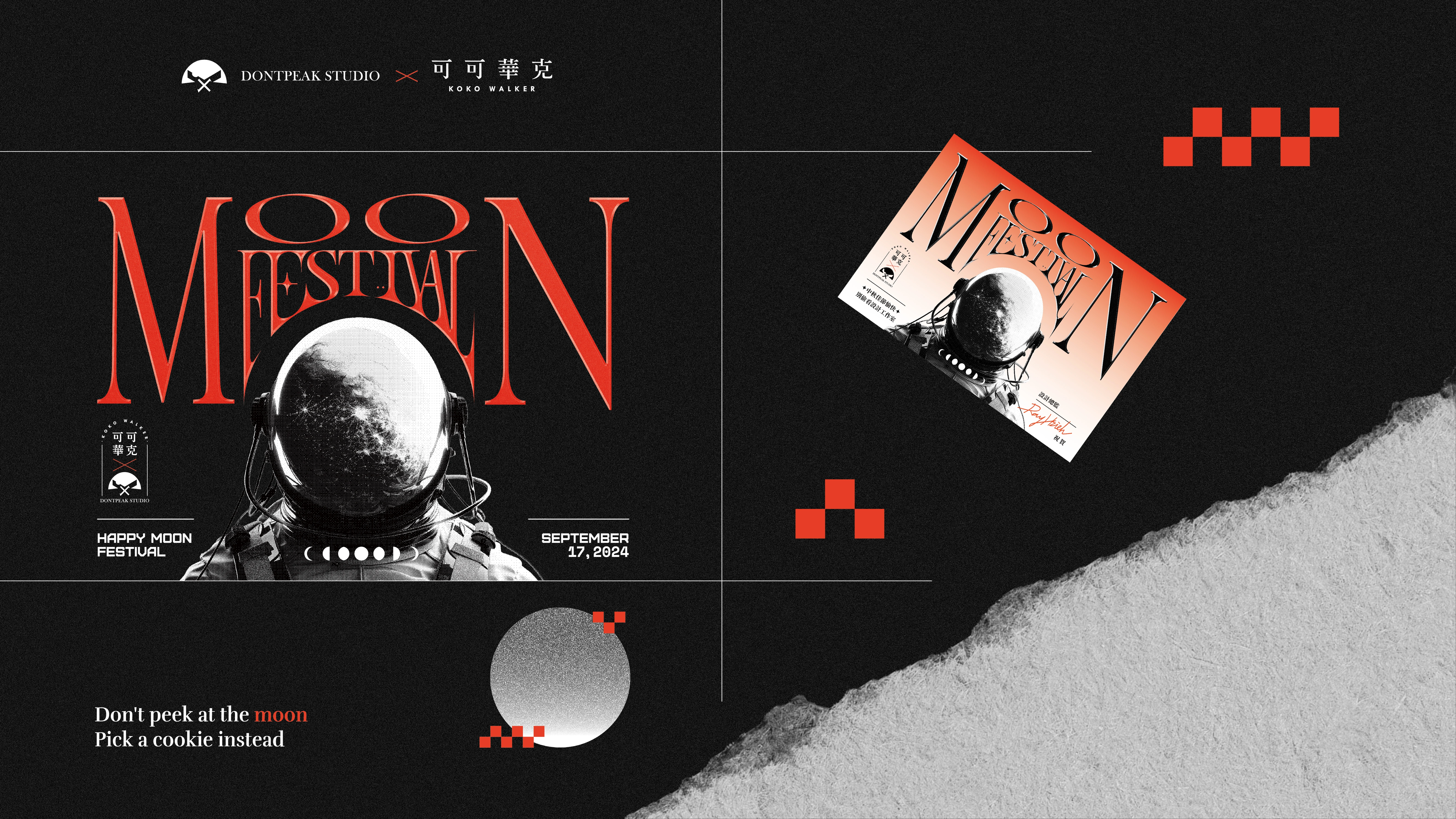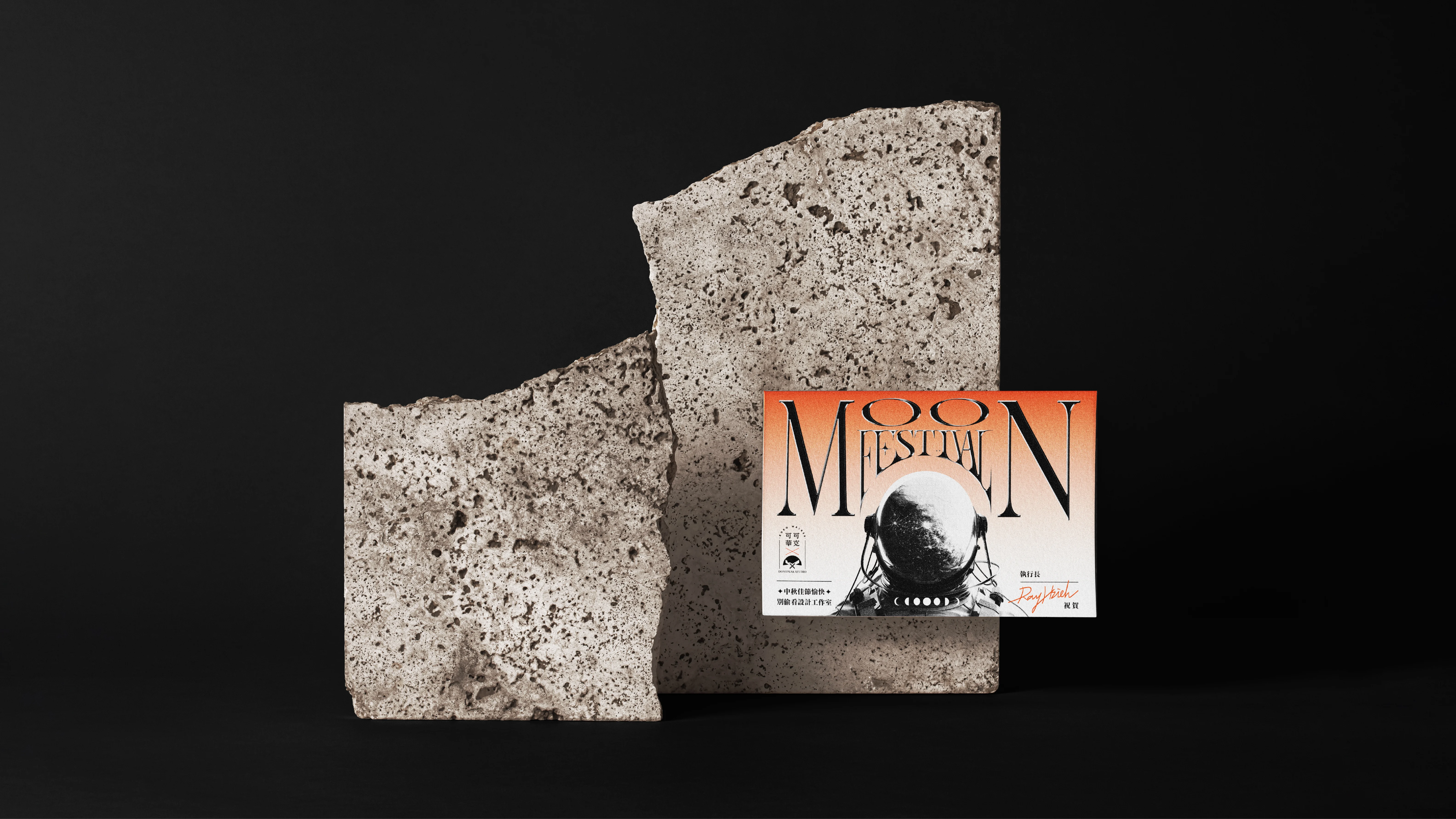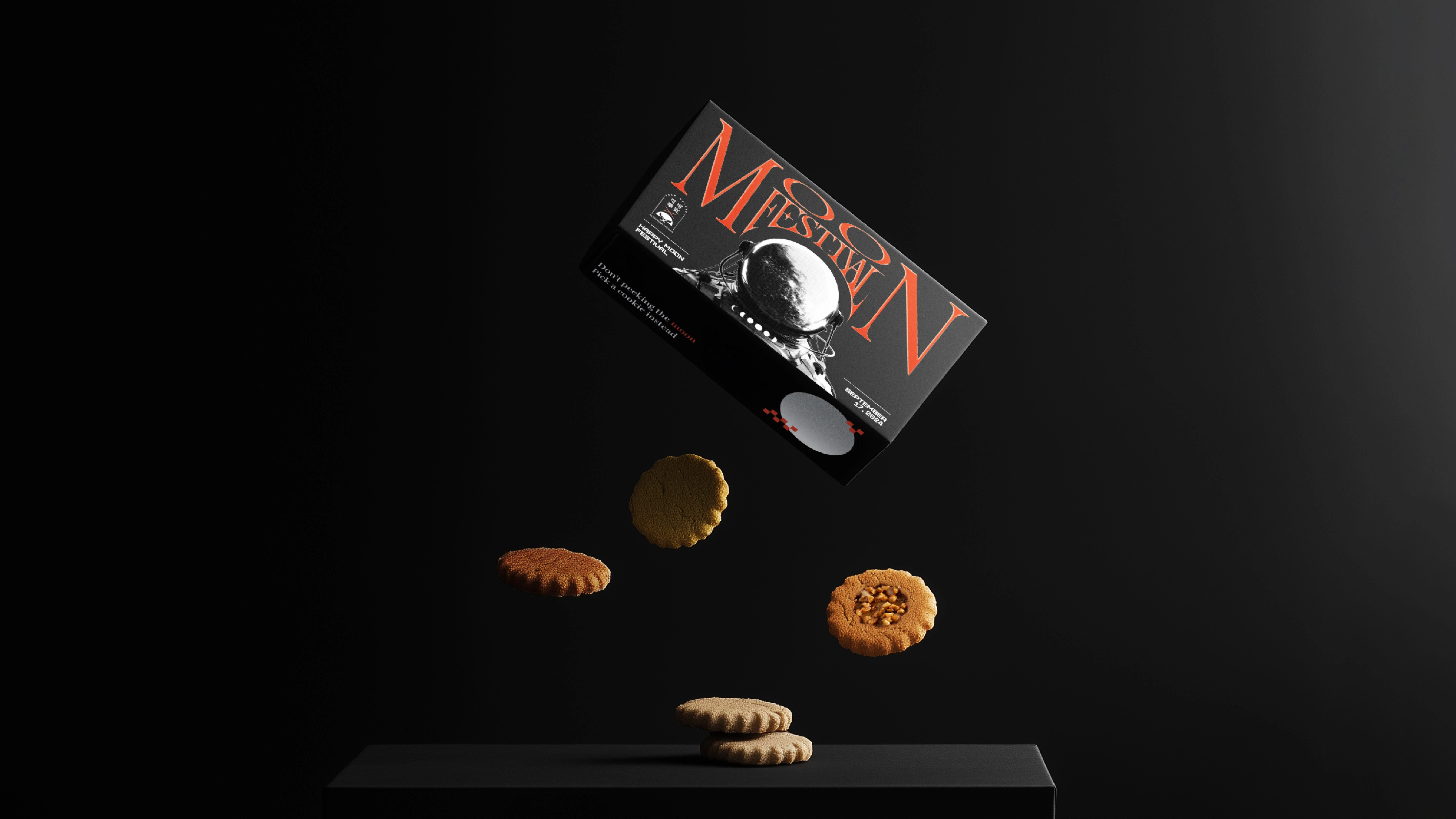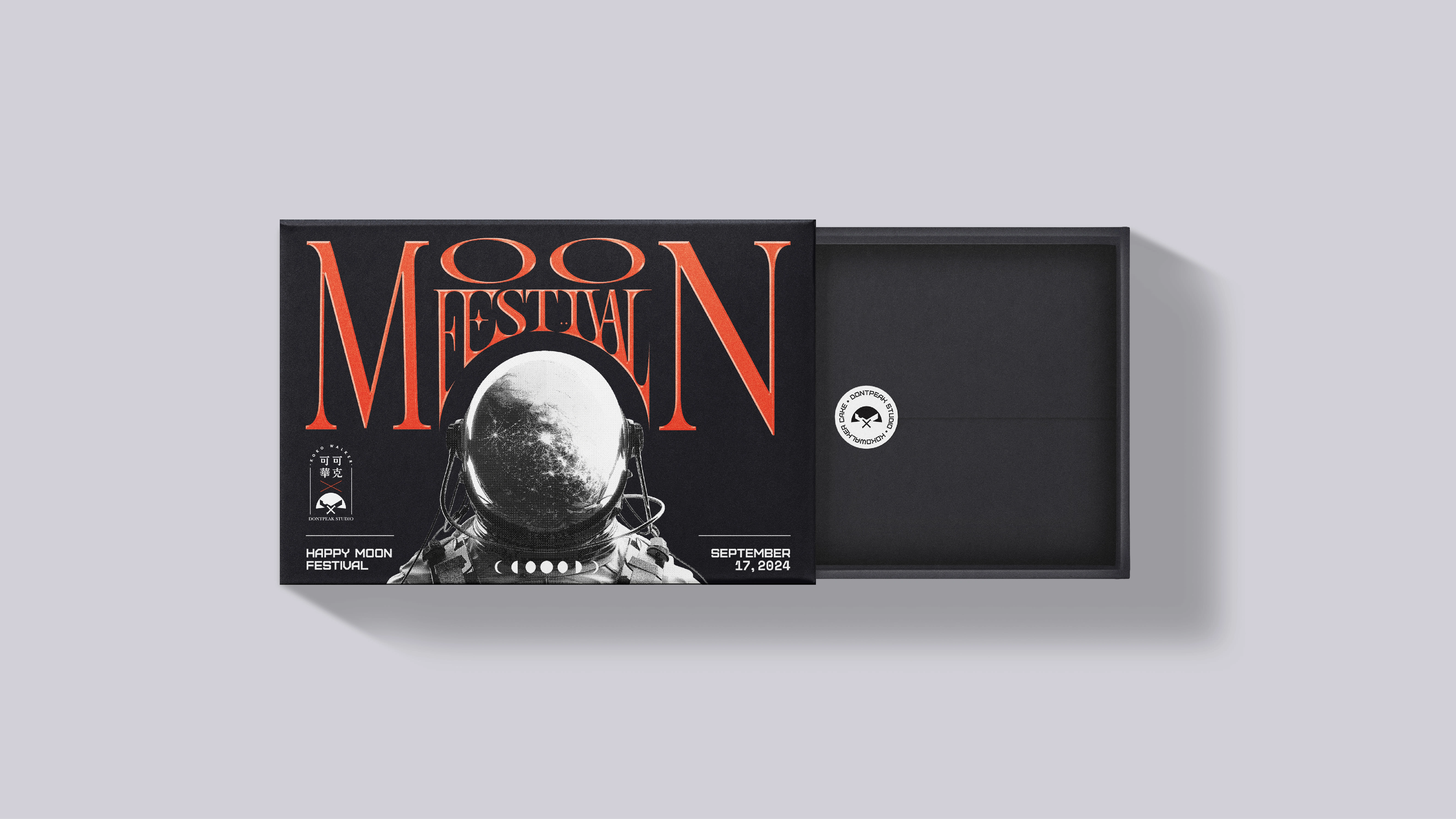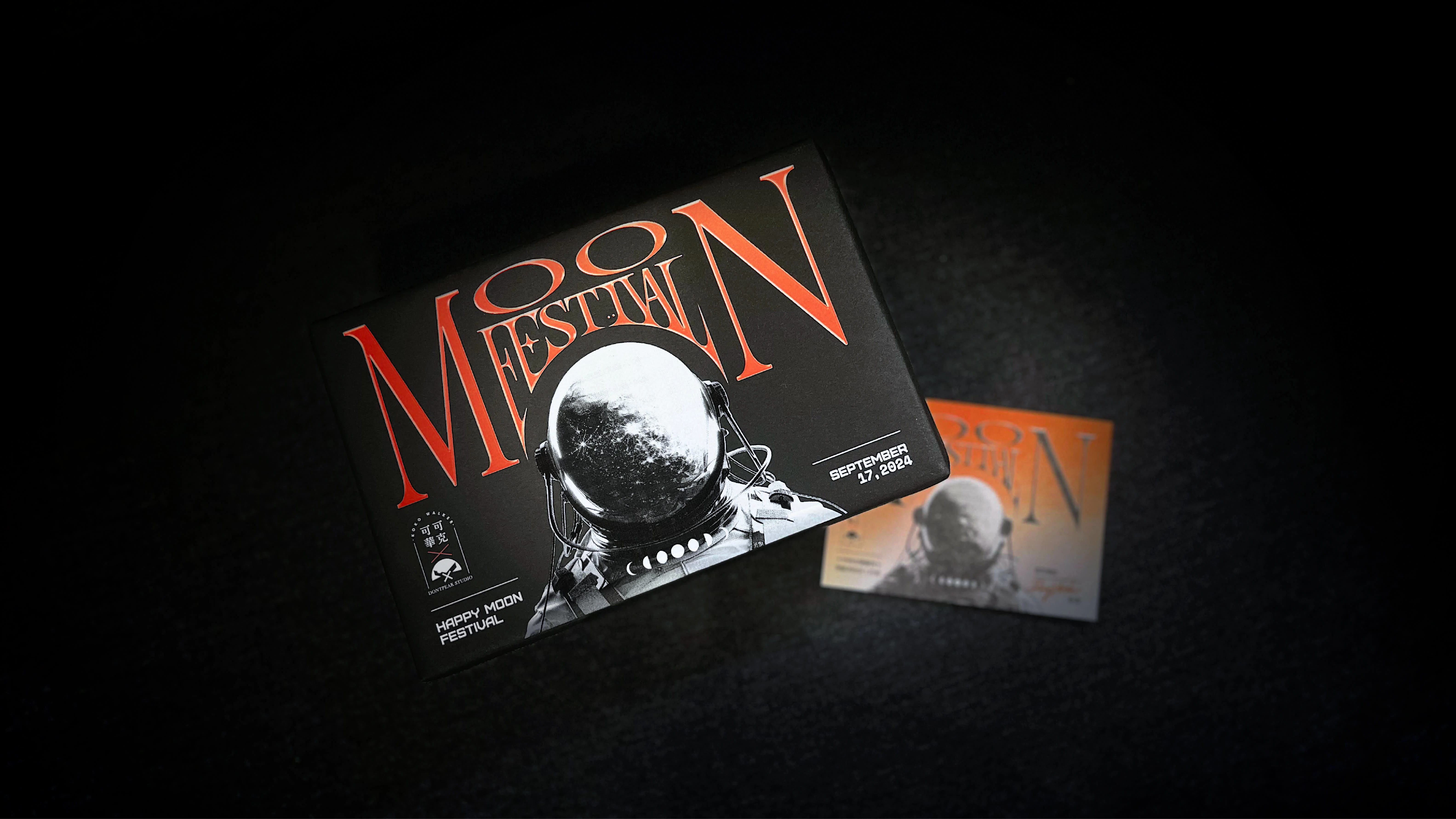 The Dontpeak Mid-Autumn gift box, in collaboration with kokowalker Cookies, features a futuristic neon orange design printed in white ink on black Rossa paper.