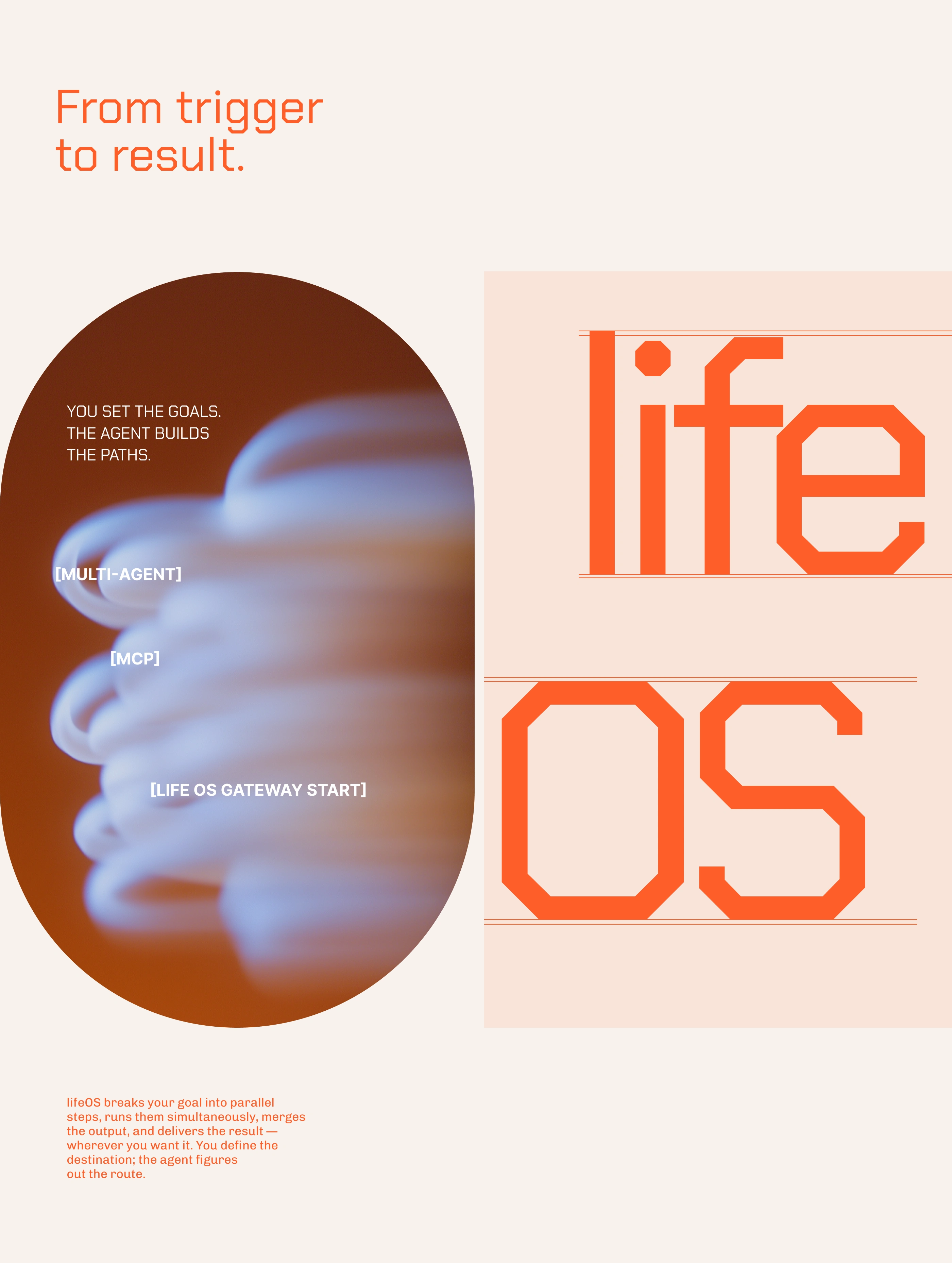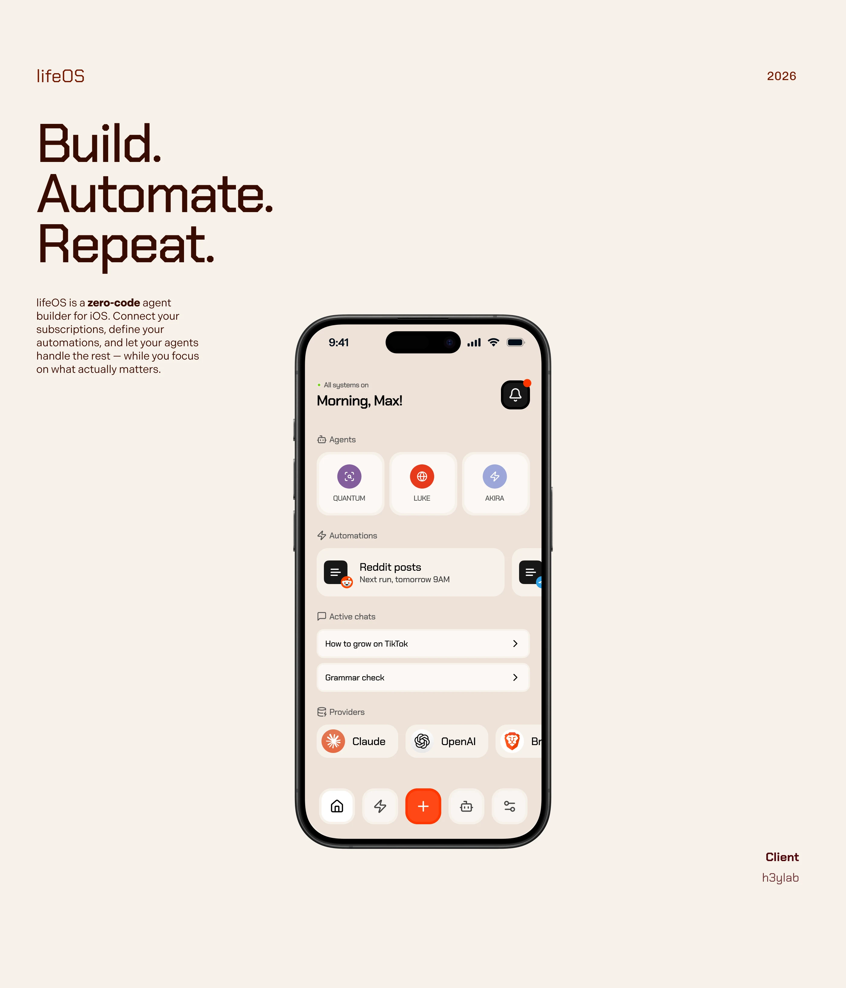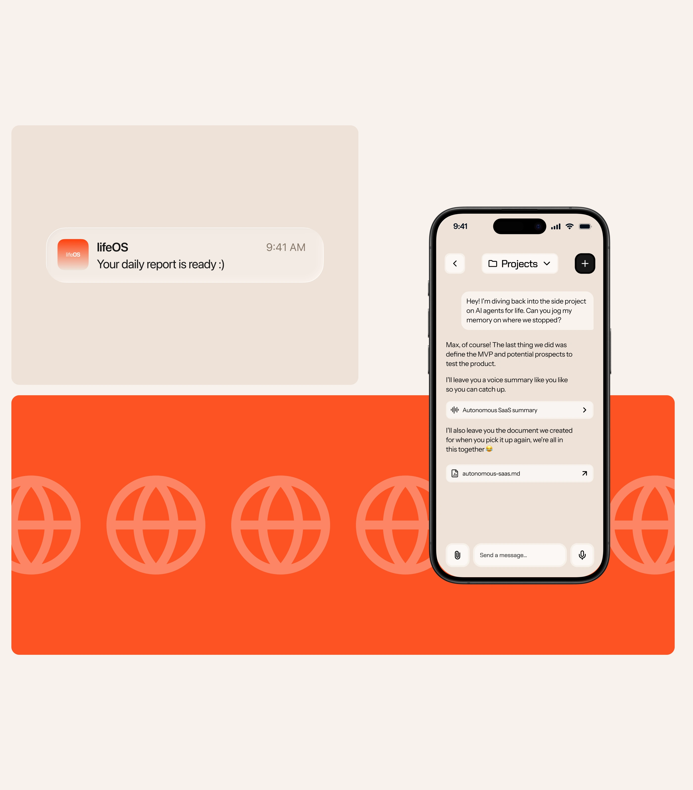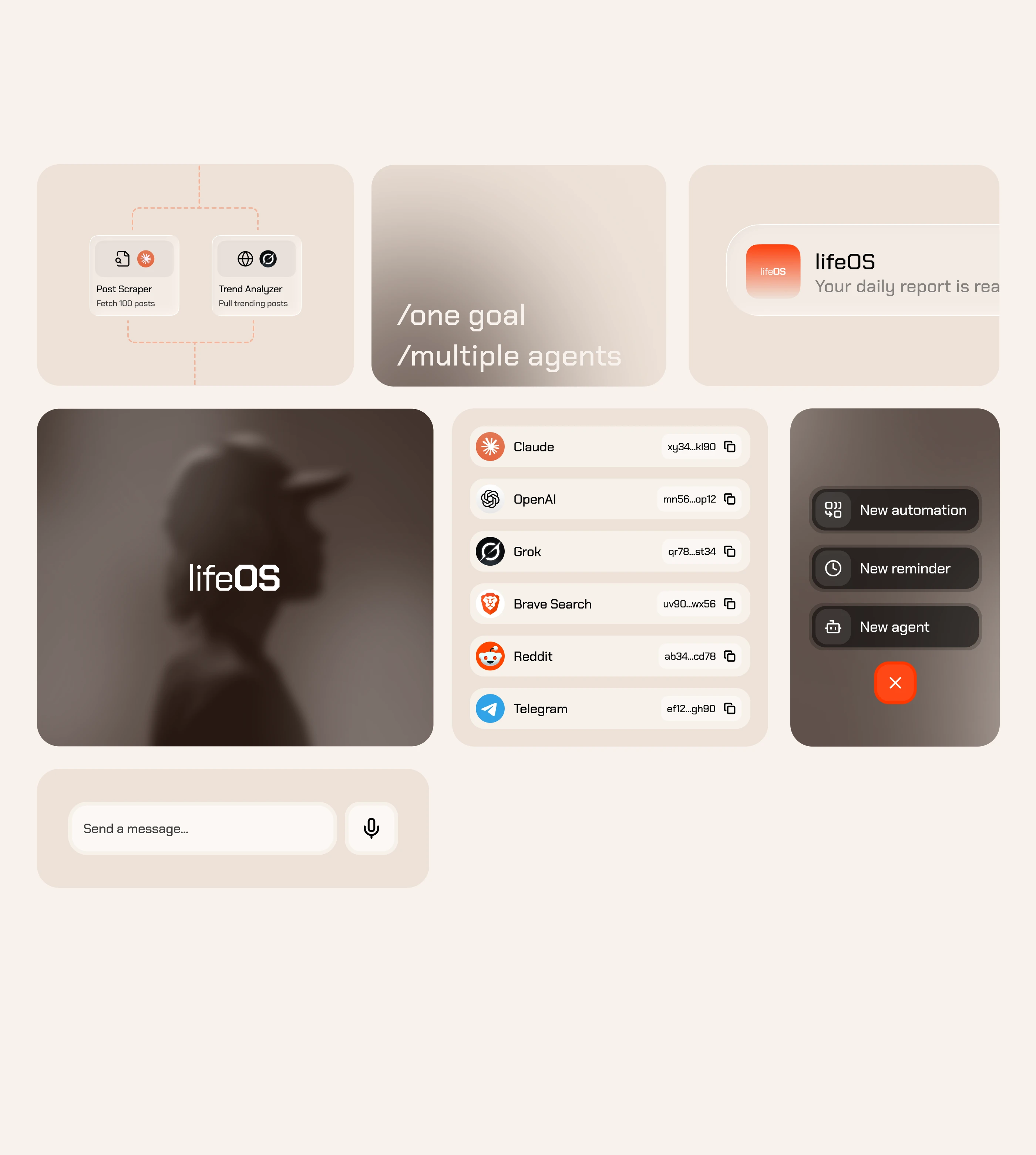 lifeOS is an AI-powered agent platform designed to help users automate tasks, manage workflows, and extend their capabilities through intelligent systems. The core idea is to enable anyone - even without technical knowledge - to set up and manage a network of AI agents through a simple, central chat interface, making automation accessible and secure. The goal was to create a minimal and intuitive interface that makes complex automation feel simple, combining multi-agent orchestration, voice interaction, and real-time summaries into a cohesive mobile experience.