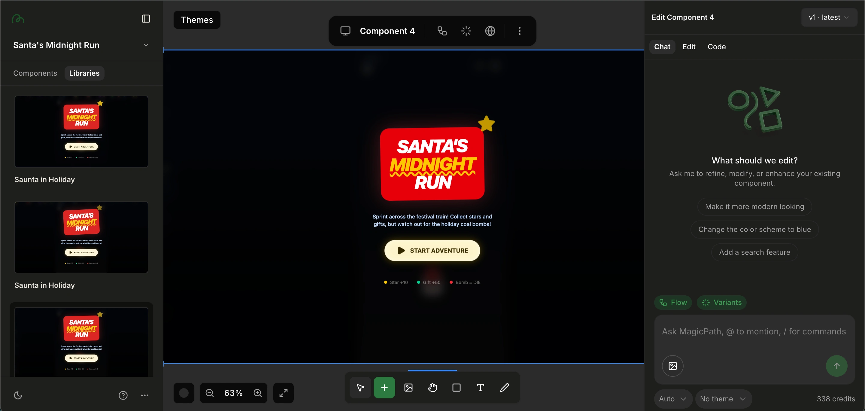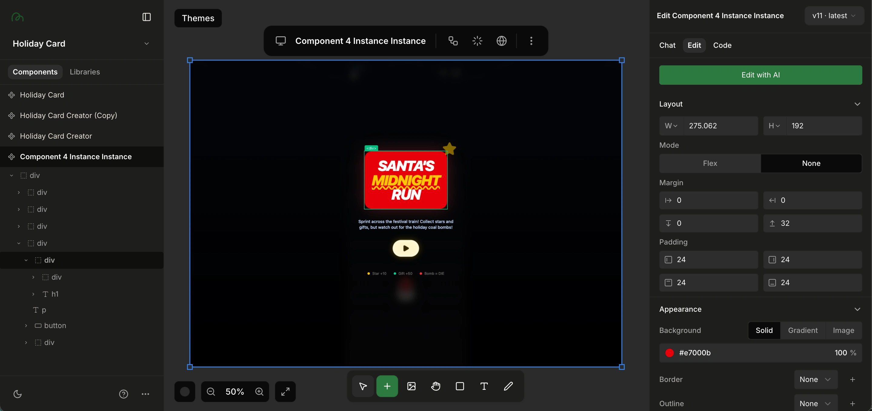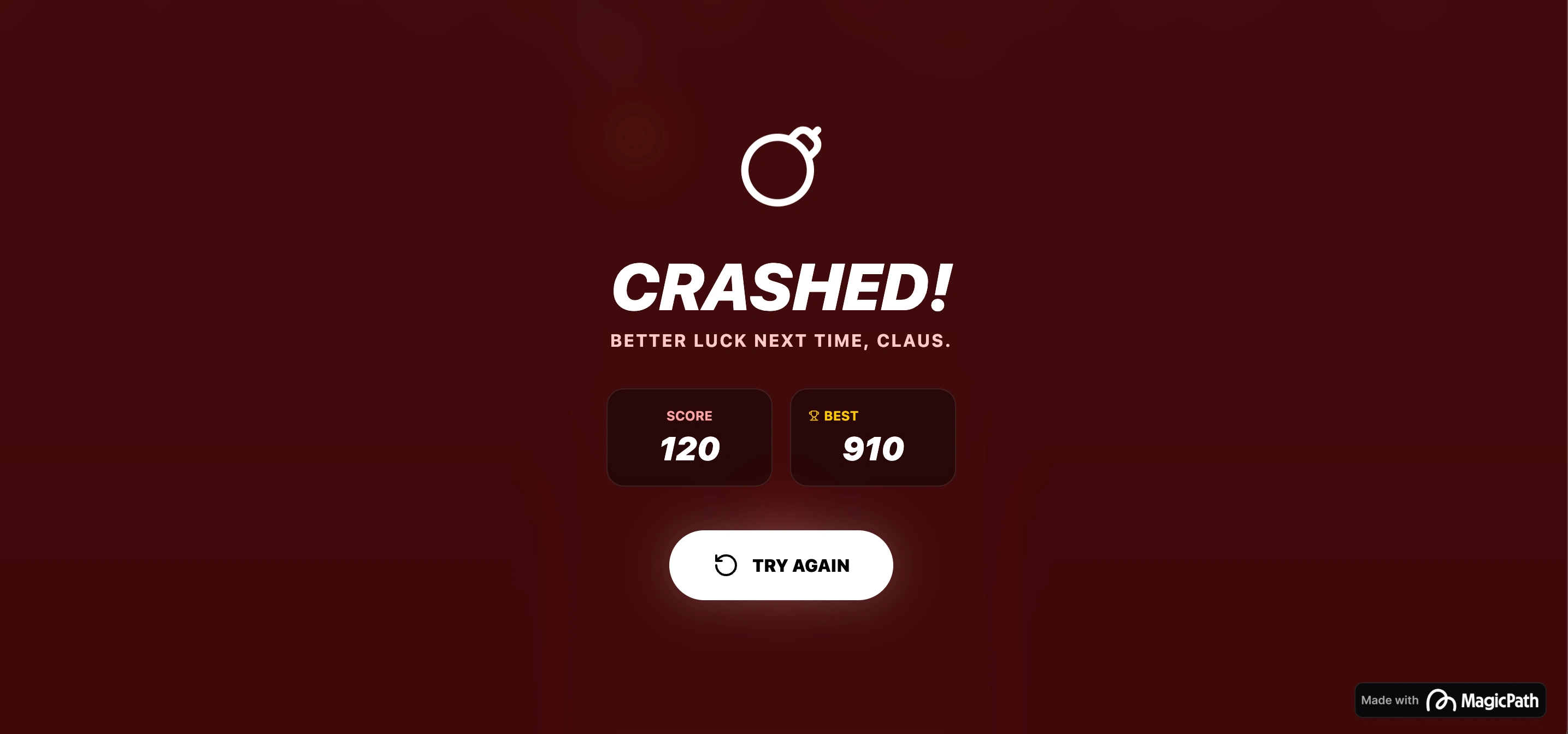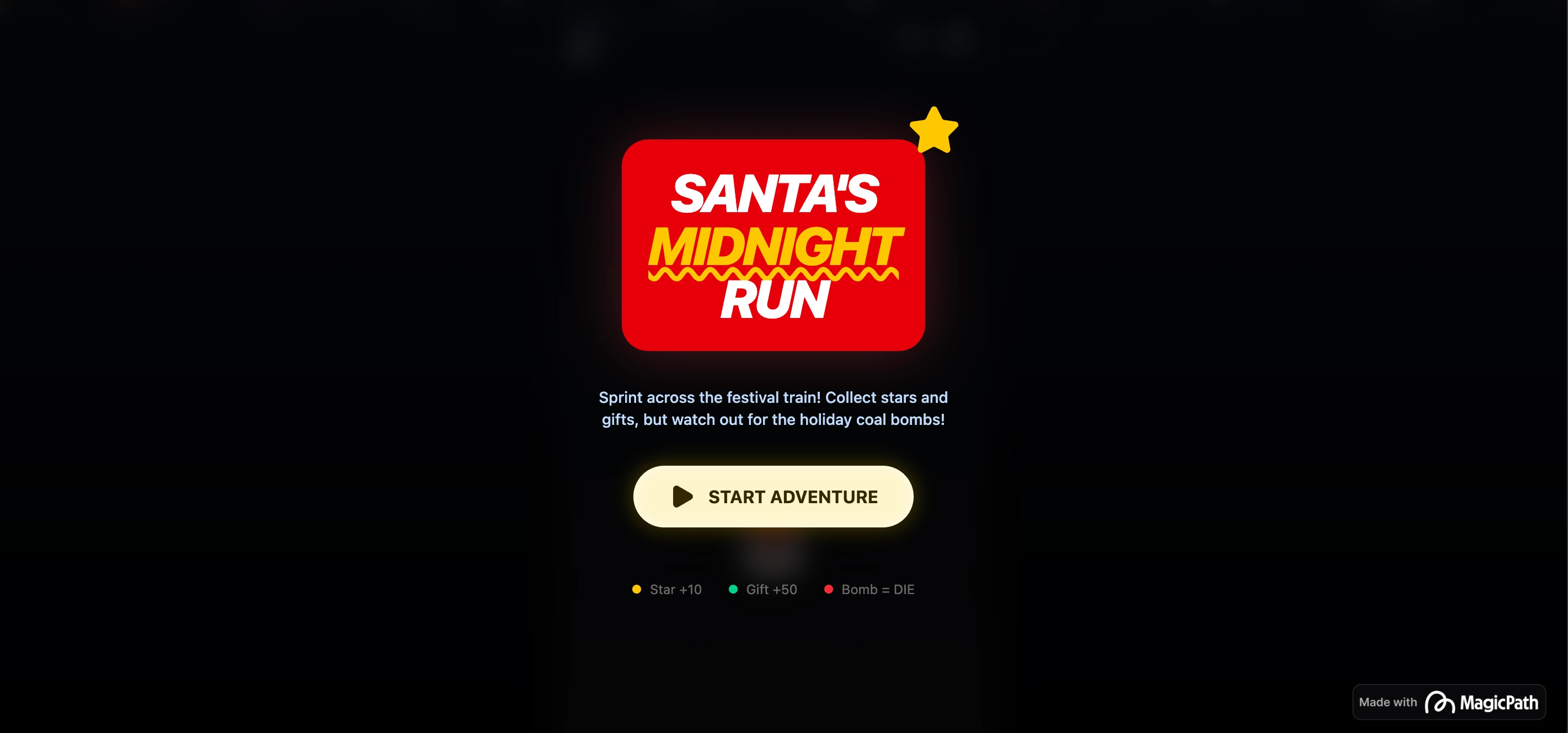 Santa’s Midnight Run is a fast-paced holiday mini-game created for a Contra holiday challenge. The goal was to design and ship a fully functional, app-store-ready game in under 24 hours, including gameplay logic, visuals, sound design, and mobile responsiveness and all built entirely in MagicPath.