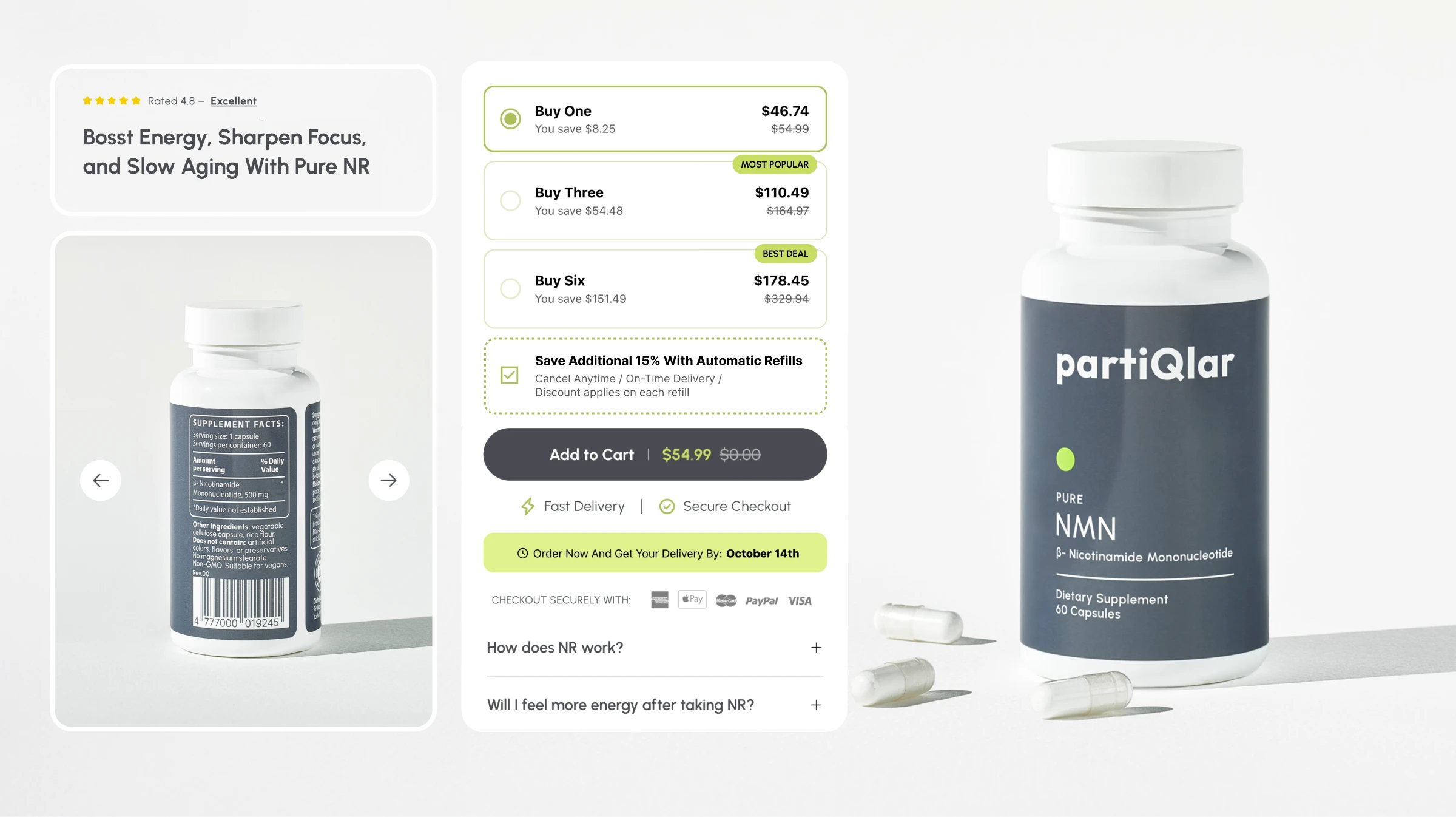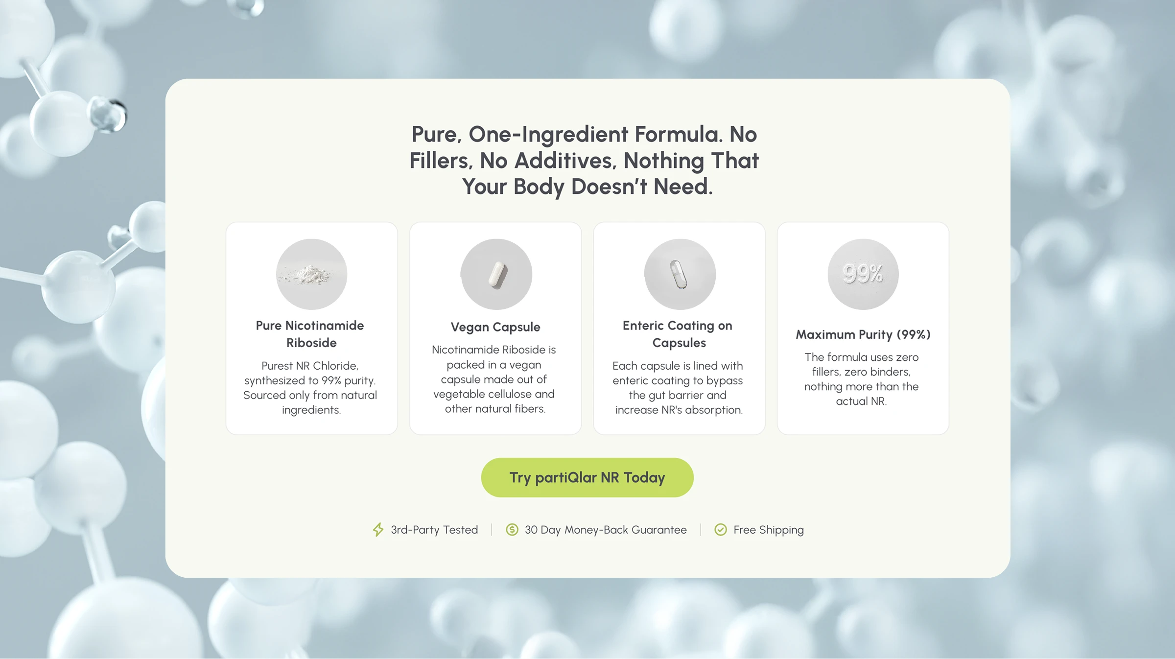 Development and design support on a landing page built for PartiQlar, a longevity supplement brand focused on cellular health and NAD+ optimization.