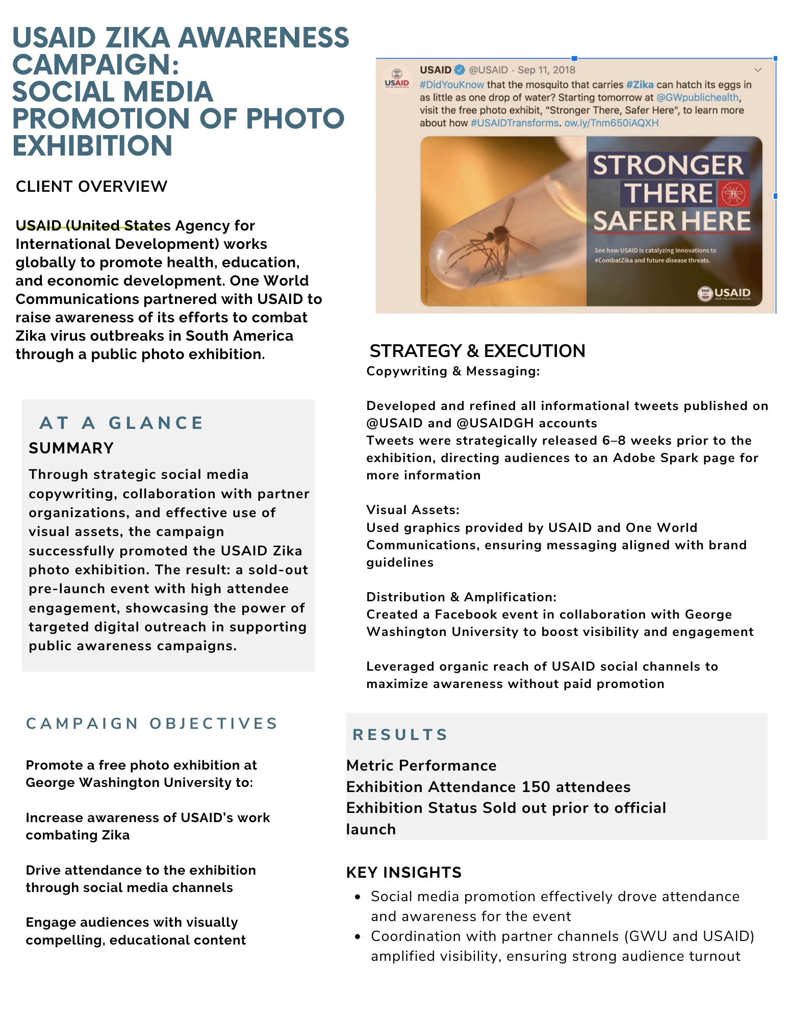 Used organic tweets, visuals, and partner promotion to boost visibility, resulting in a sold-out Zika photo exhibition at GWU.
