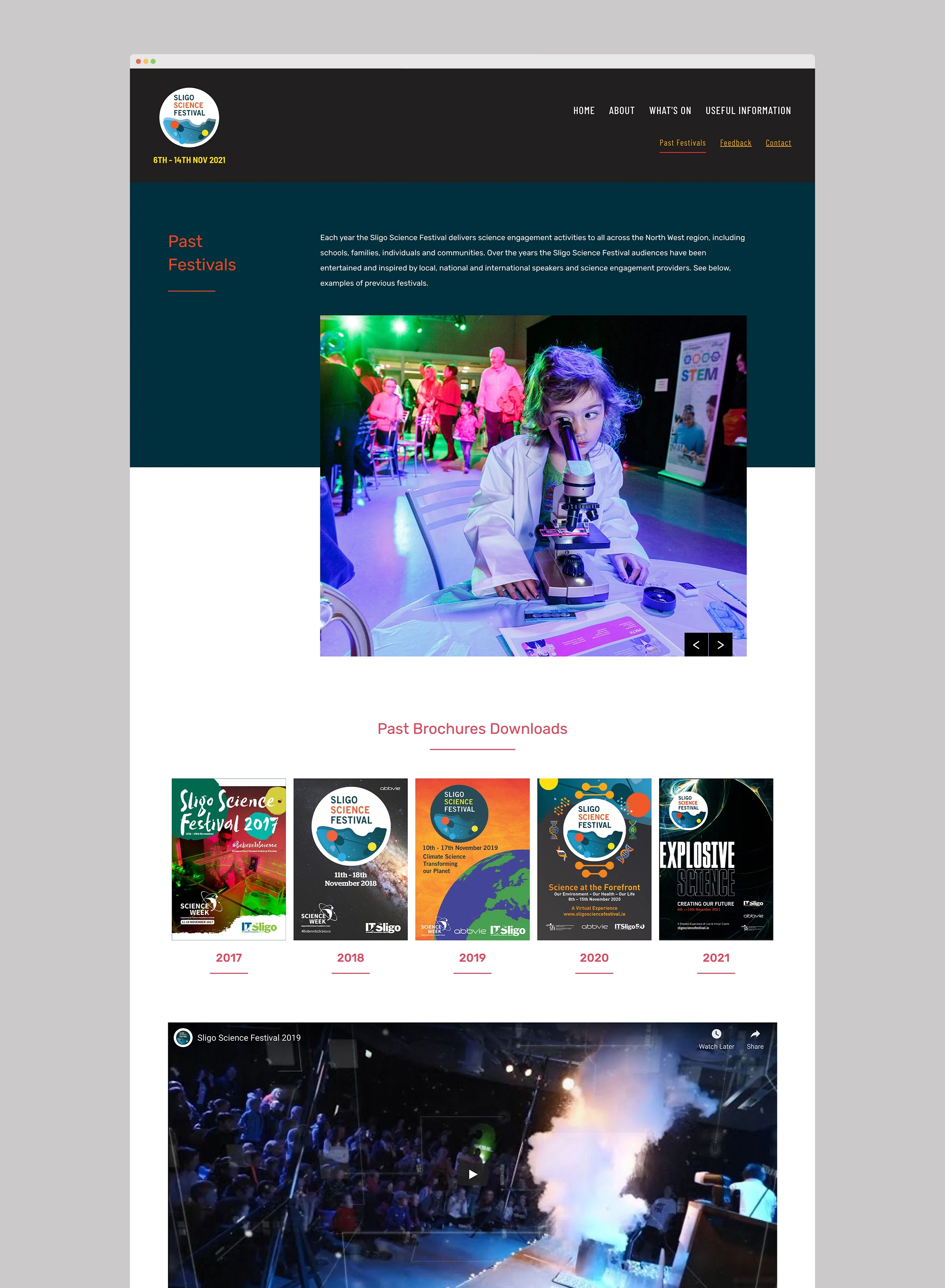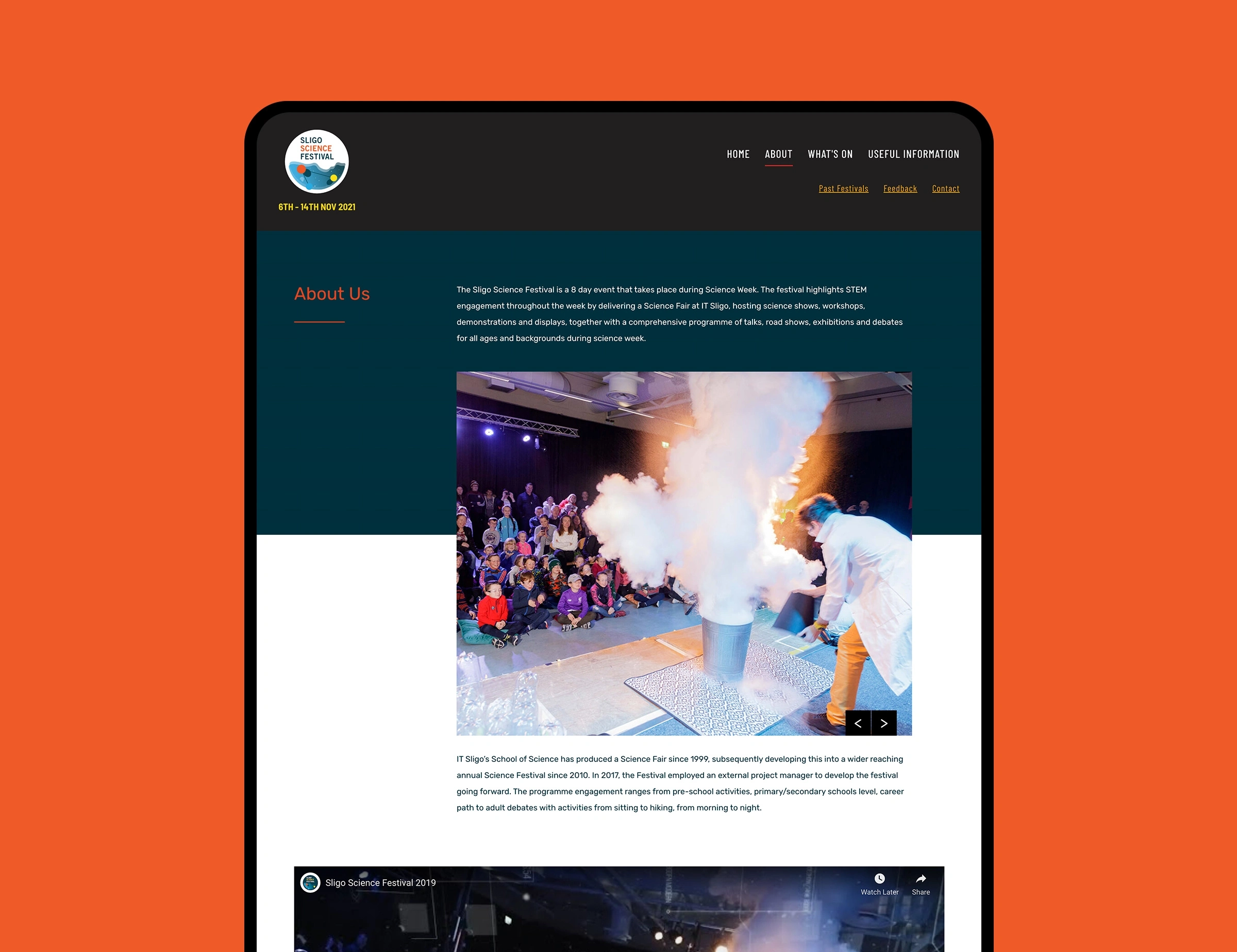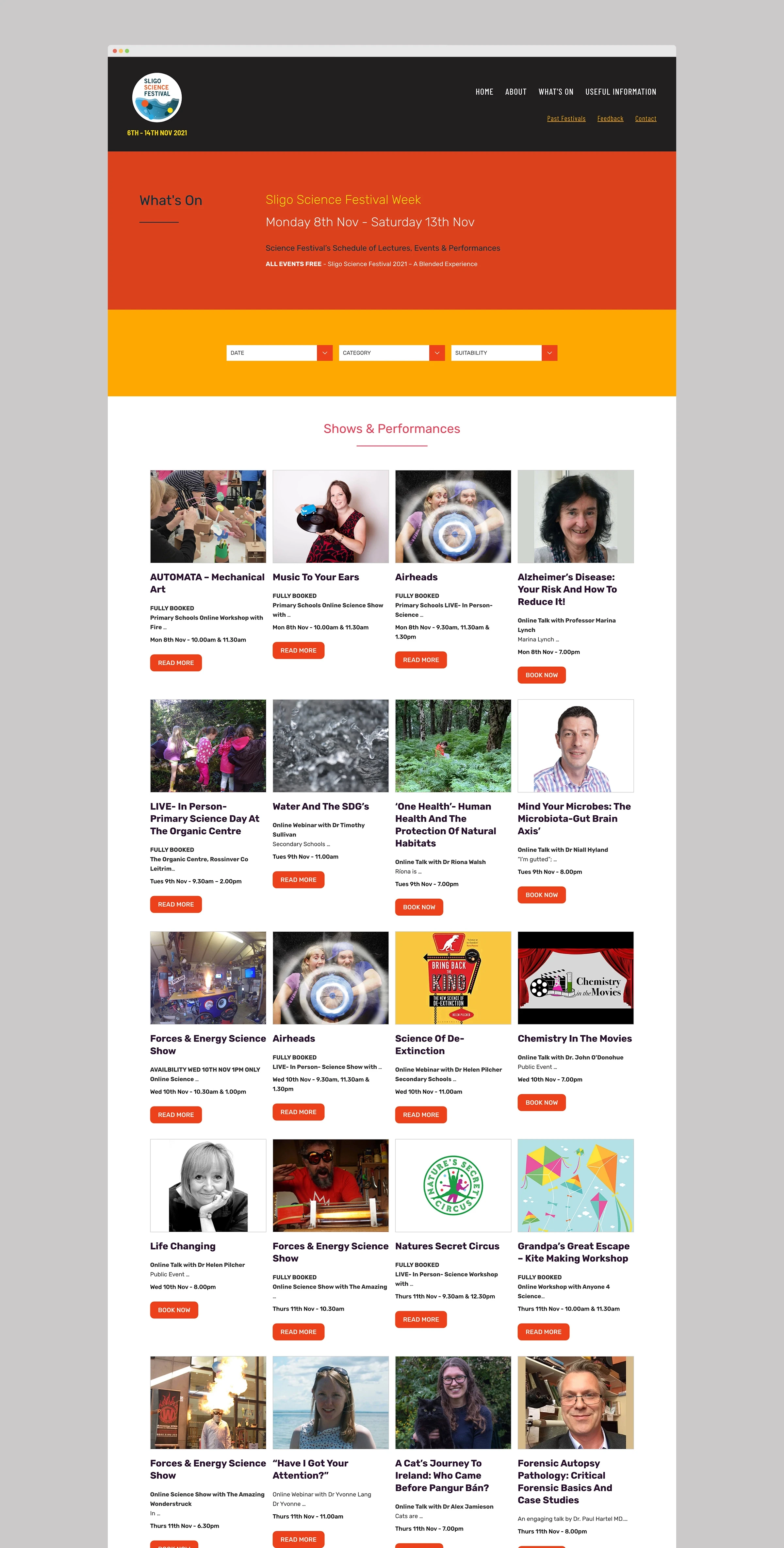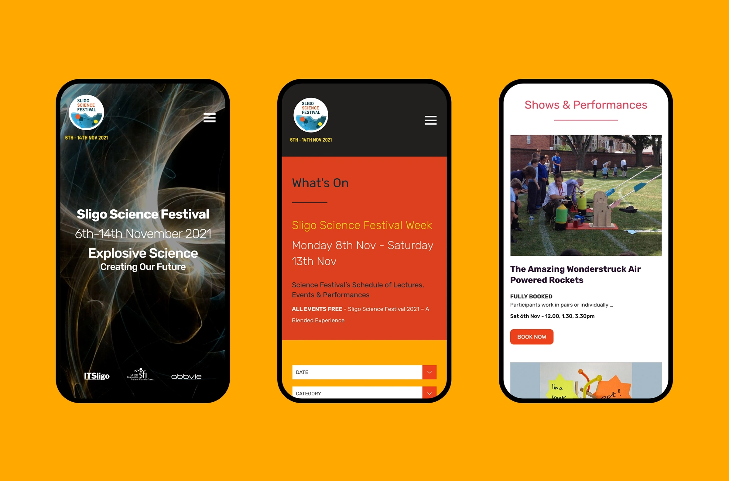 Sligo Science Festival required a website that could both promote and showcase its wide programme of events. I designed and developed a bespoke WordPress site that is lively, intuitive to use, and reflects the energy of the festival. The design combines bold visuals with straightforward navigation to immediately capture visitors’ attention.