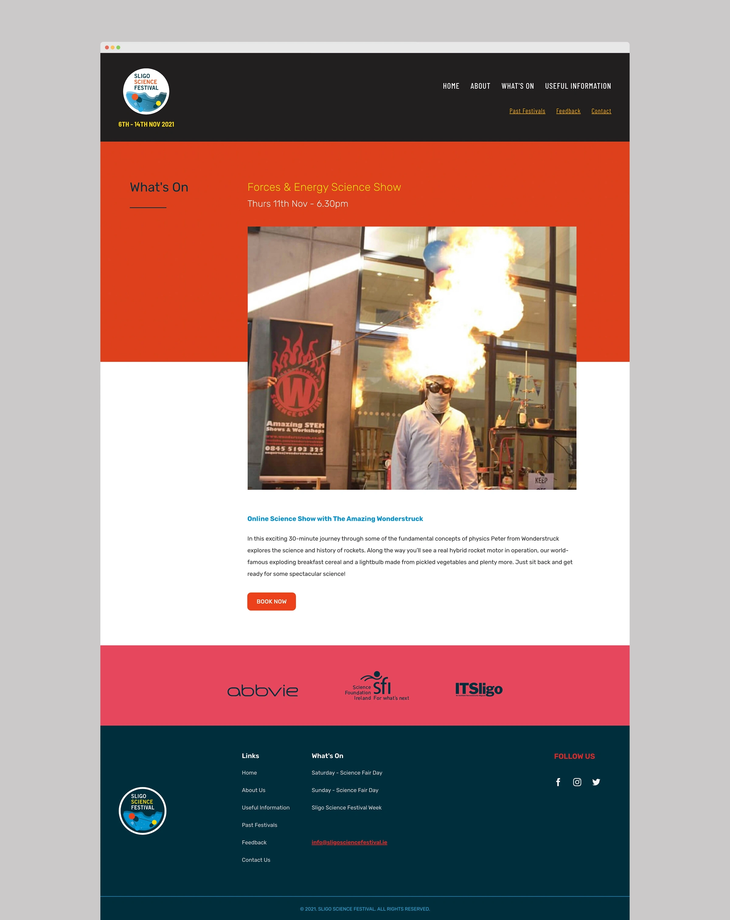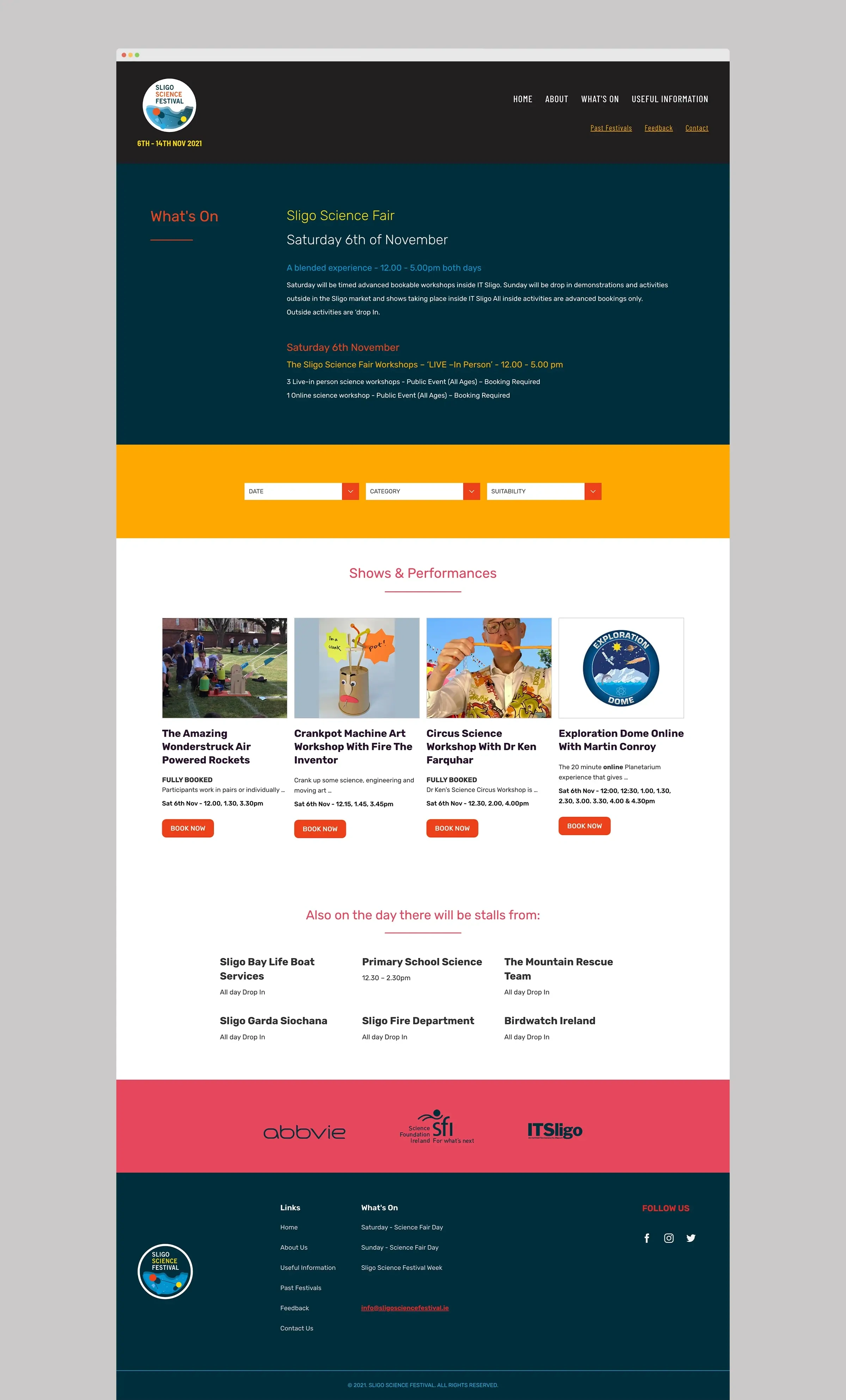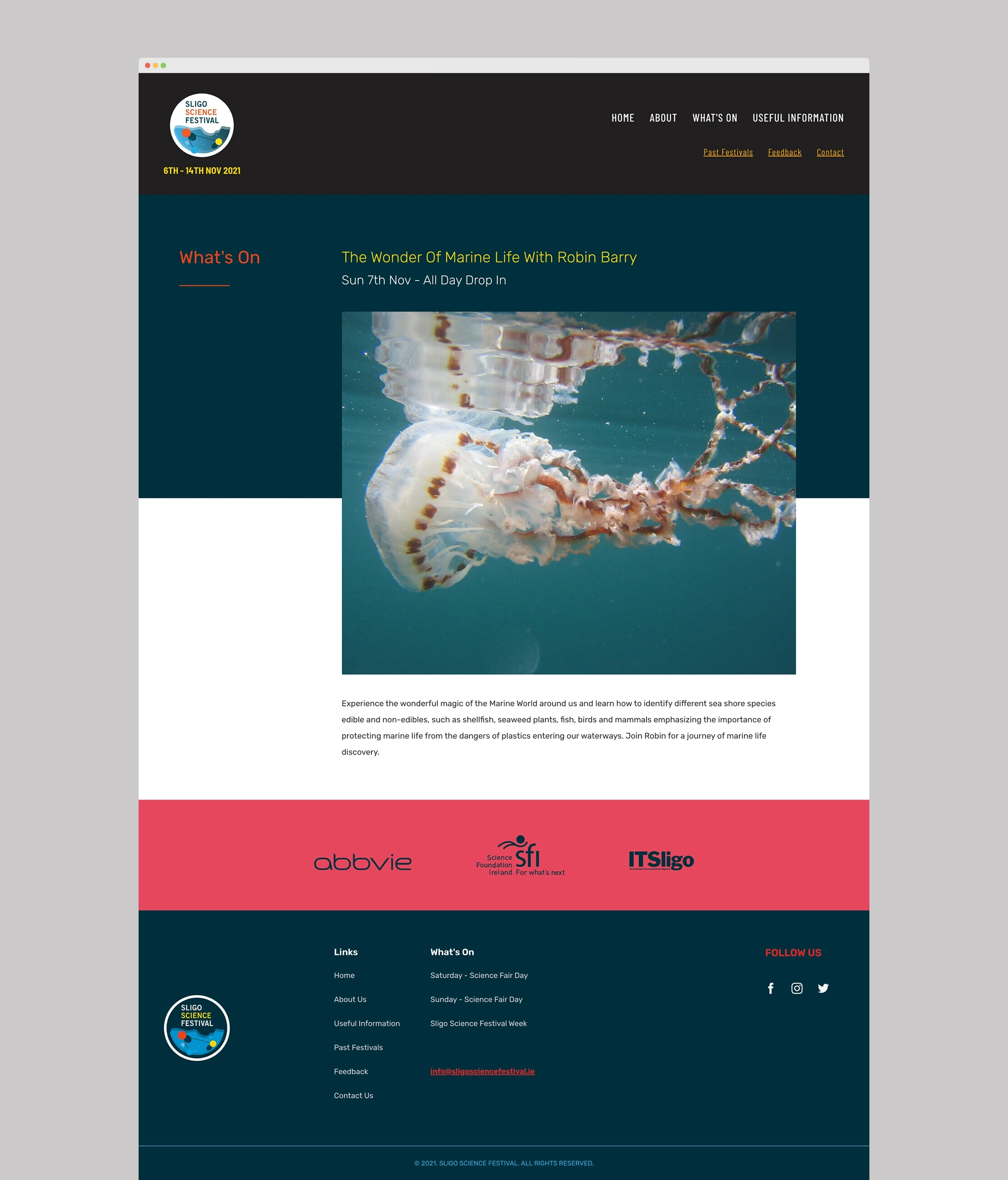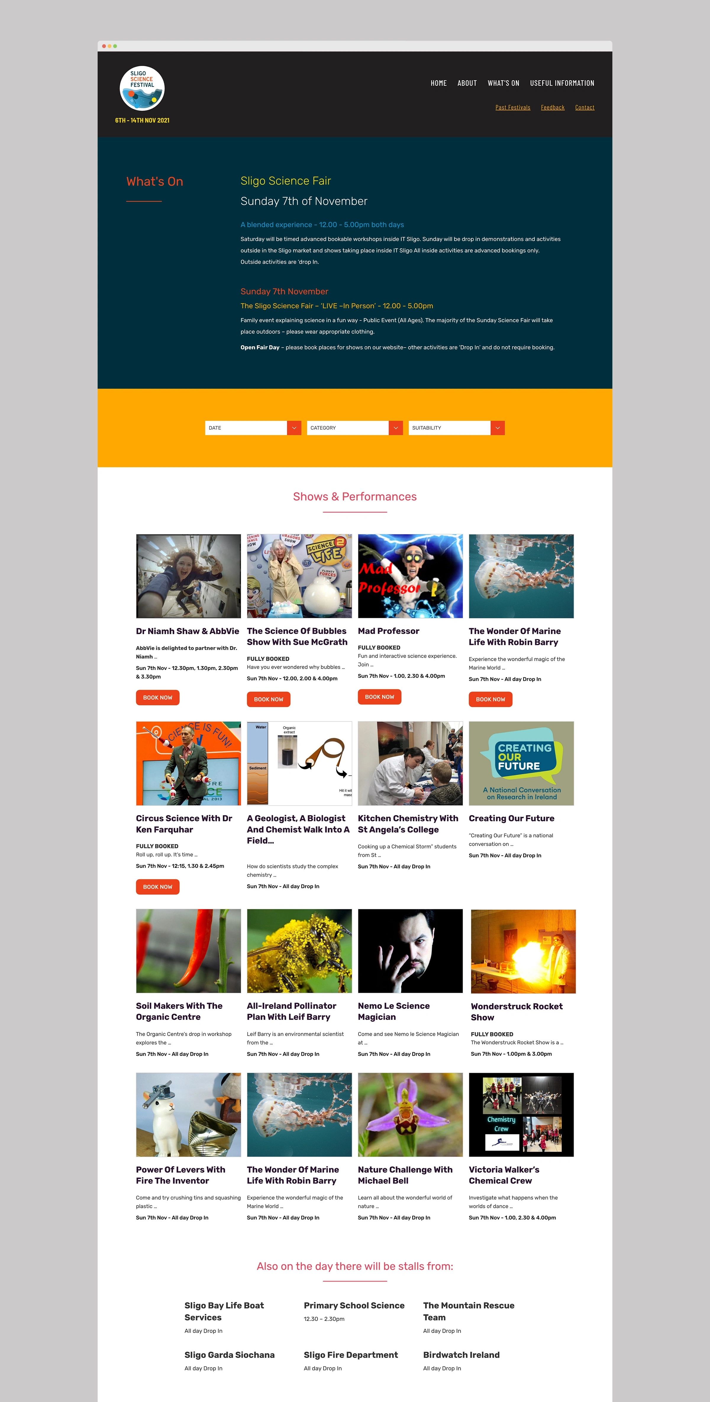 Sligo Science Festival required a website that could both promote and showcase its wide programme of events. I designed and developed a bespoke WordPress site that is lively, intuitive to use, and reflects the energy of the festival. The design combines bold visuals with straightforward navigation to immediately capture visitors’ attention.