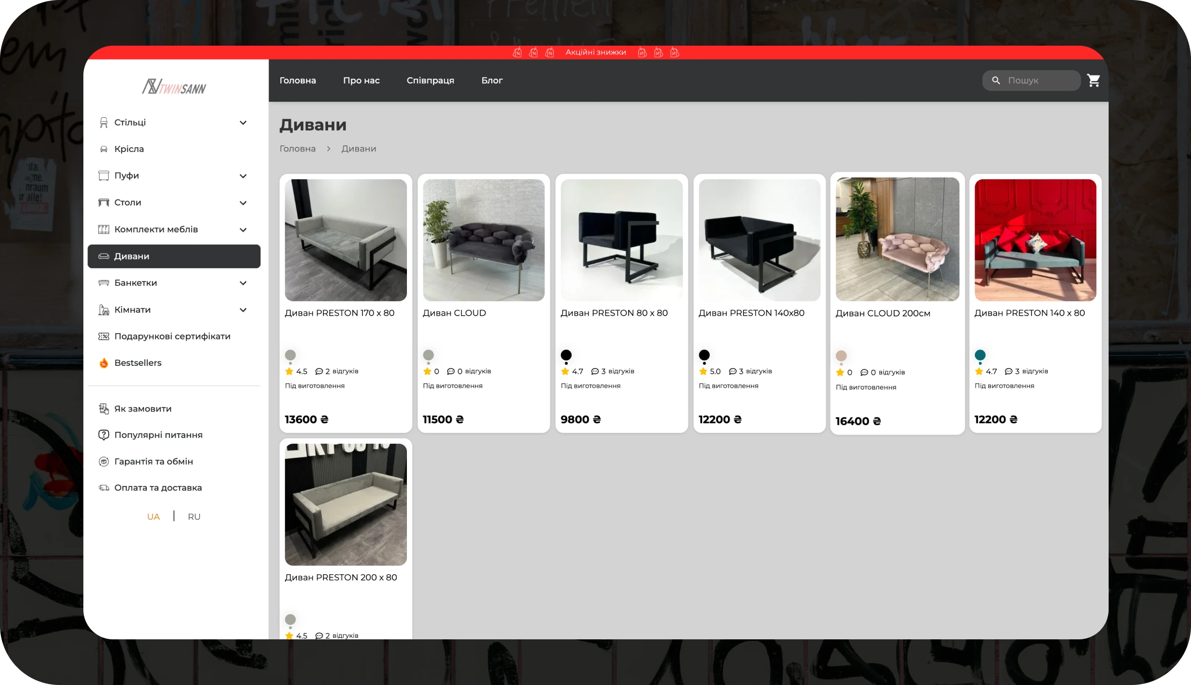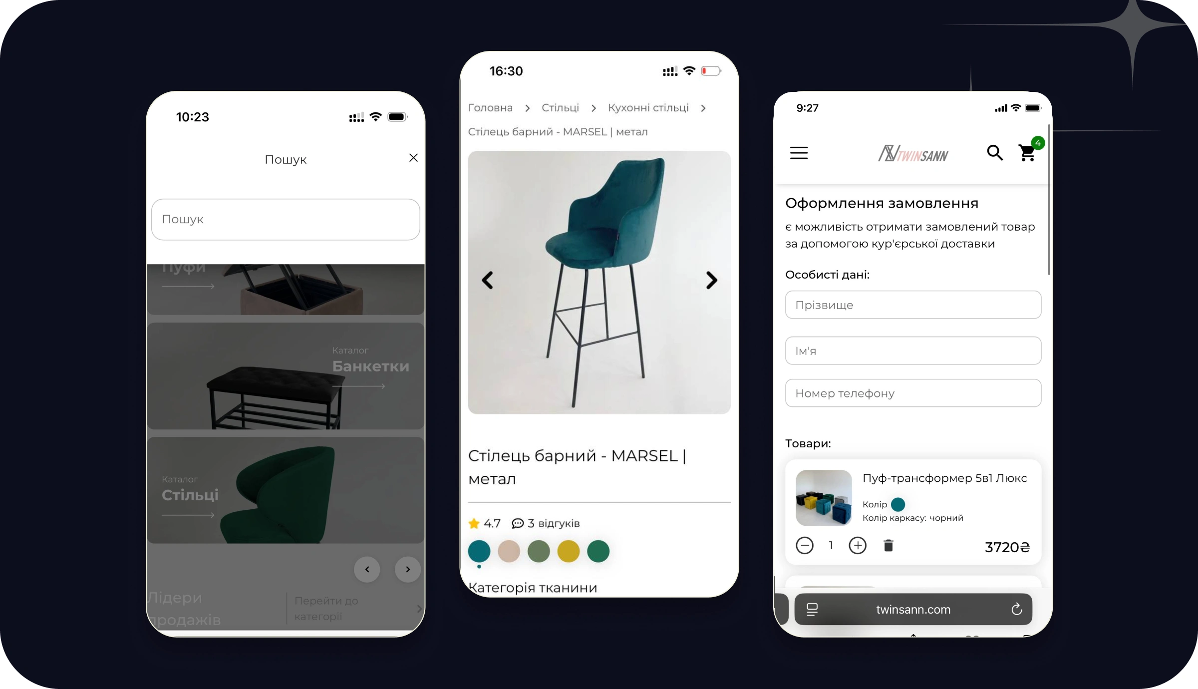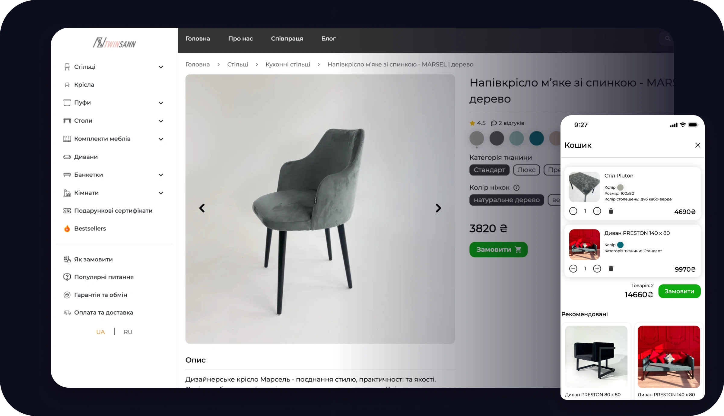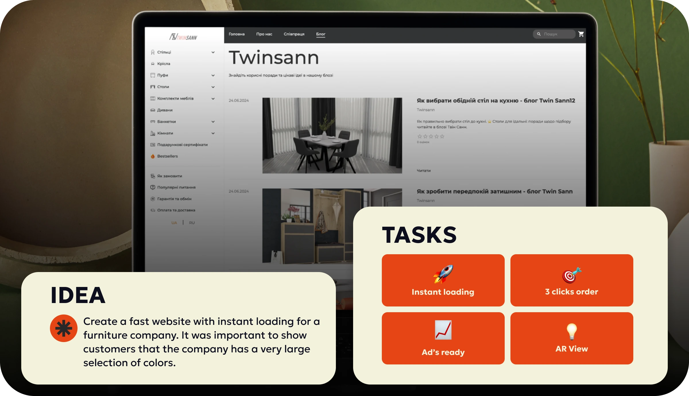 π I developed a high-speed eCommerce website for TwinnSan, a leading furniture manufacturer in Ukraine. The platform features instant page loading, dynamic product customization with multiple colours, and a 3-click mobile and desktop ordering flow, resulting in a 15% increase in purchases and over $390,000 in sales over the past year β‘