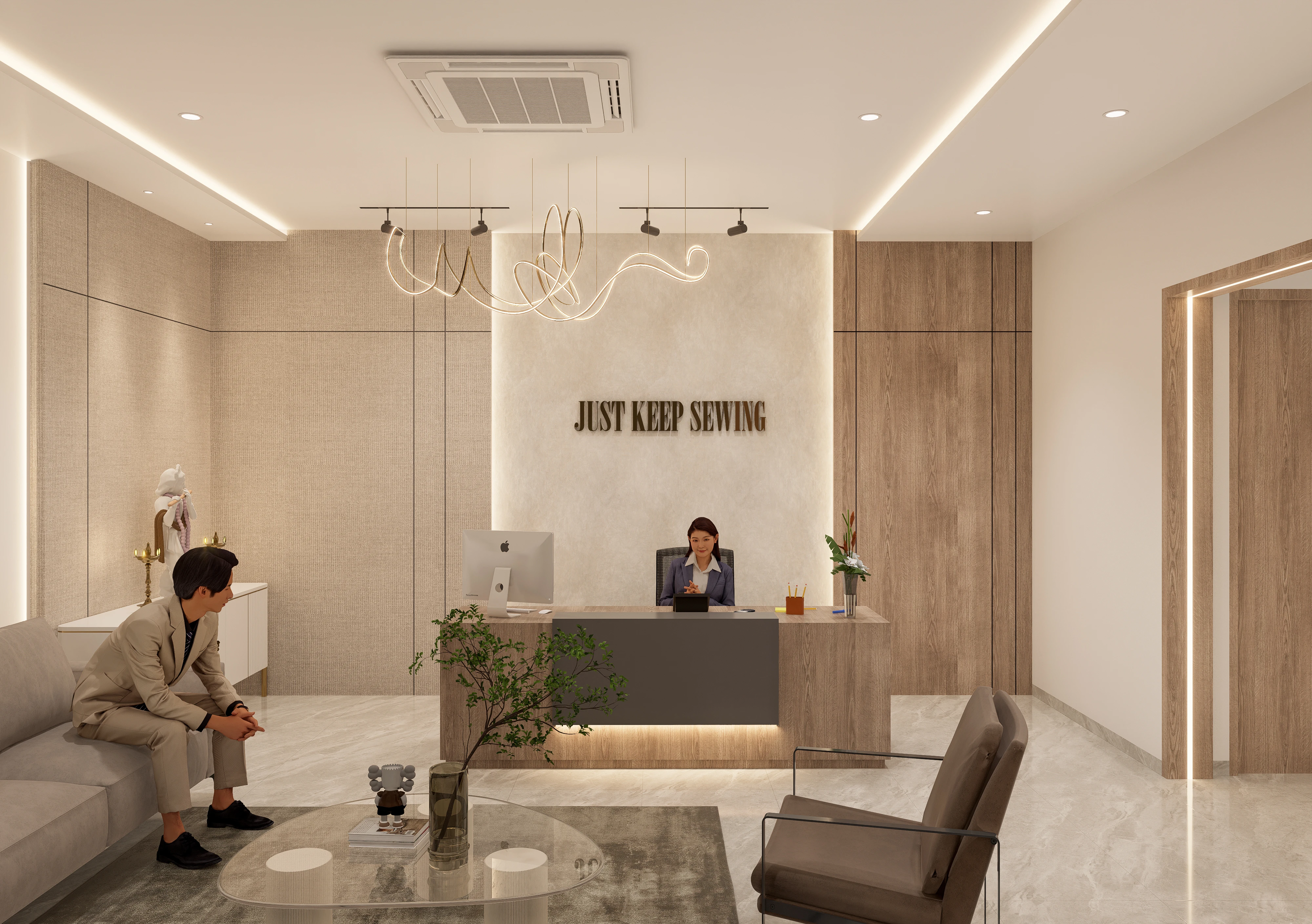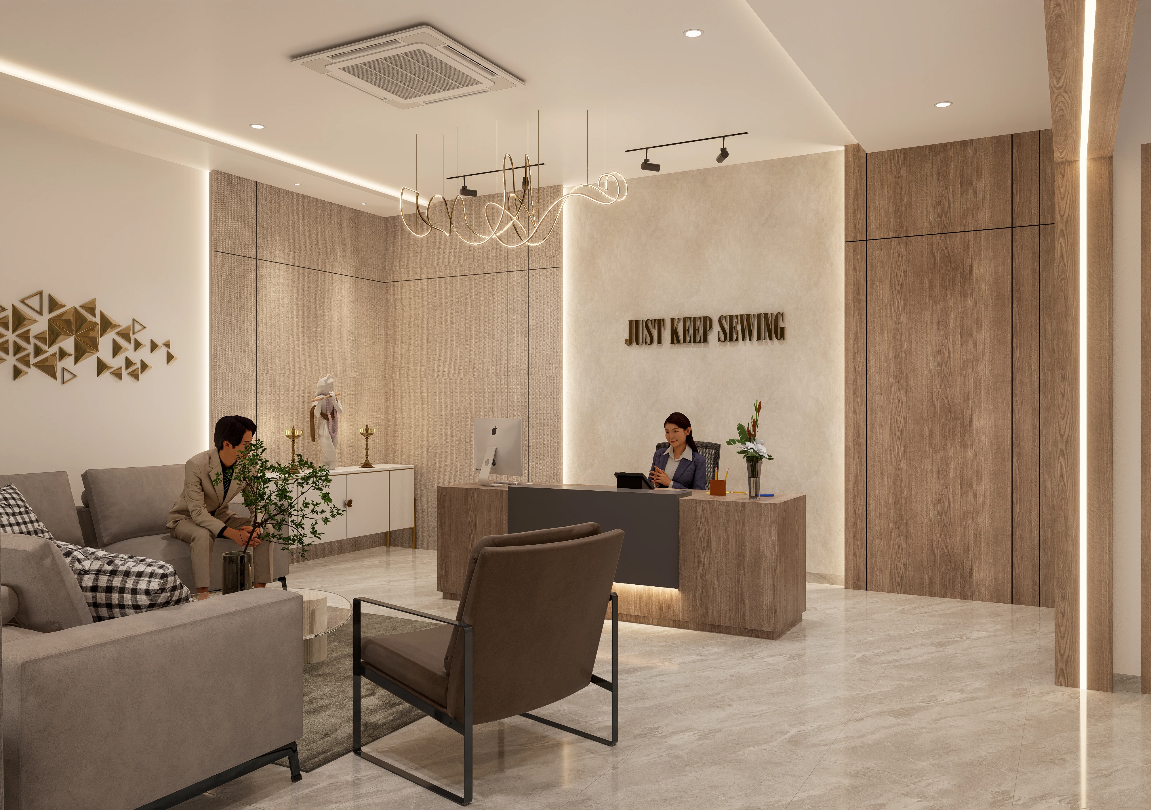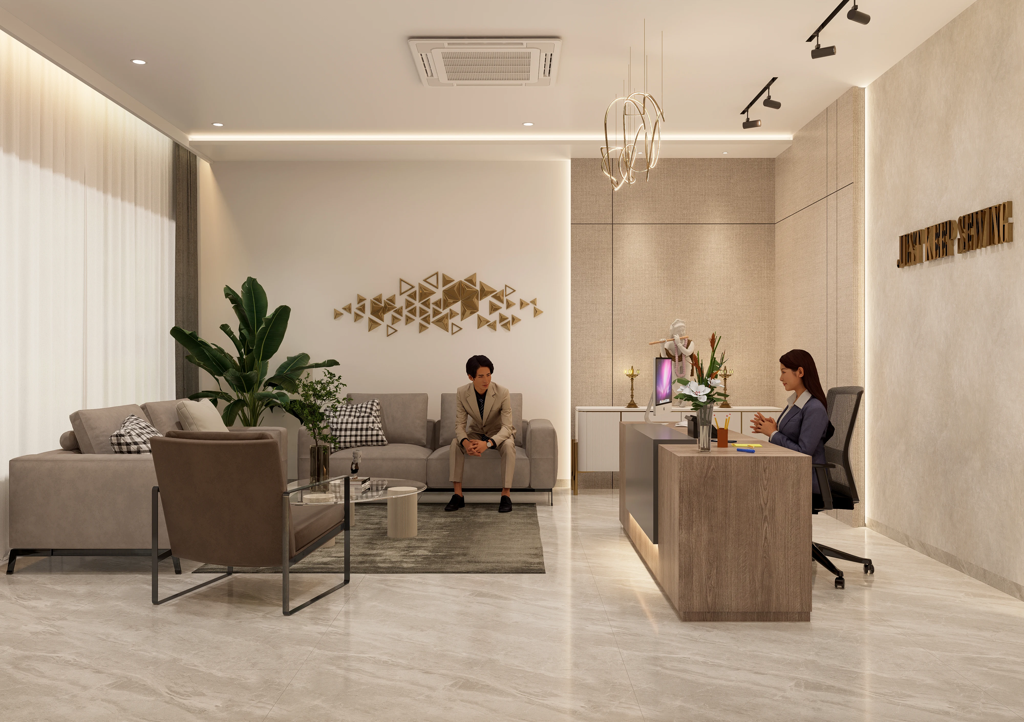 Designed this elegant office reception area with use of wood and wallpaper to give it simple yet luxury look.