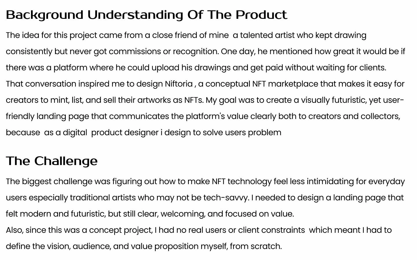 Niftoria is a futuristic NFT marketplace designed to be bold yet beginner-friendly, with a clean, dark-themed landing page. The challenge was balancing strong..
