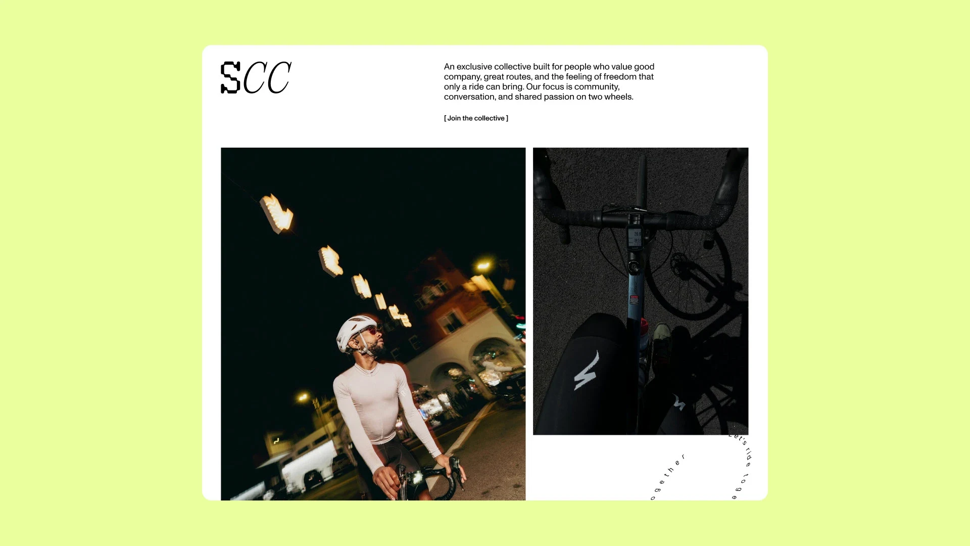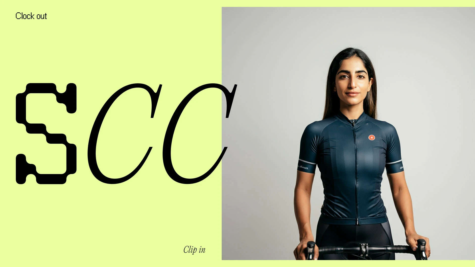 Branding concept for SCC— a collective that brings together those who share a passion for social cycling and connection. The identity pairs a pixel-based typeface with a graceful italic, reflecting the shift from desk to saddle. It reorients the sport as an escape from routine, a space to move, reset, and belong. The result is a brand defined by shared ambition and a modern, elevated aesthetic.