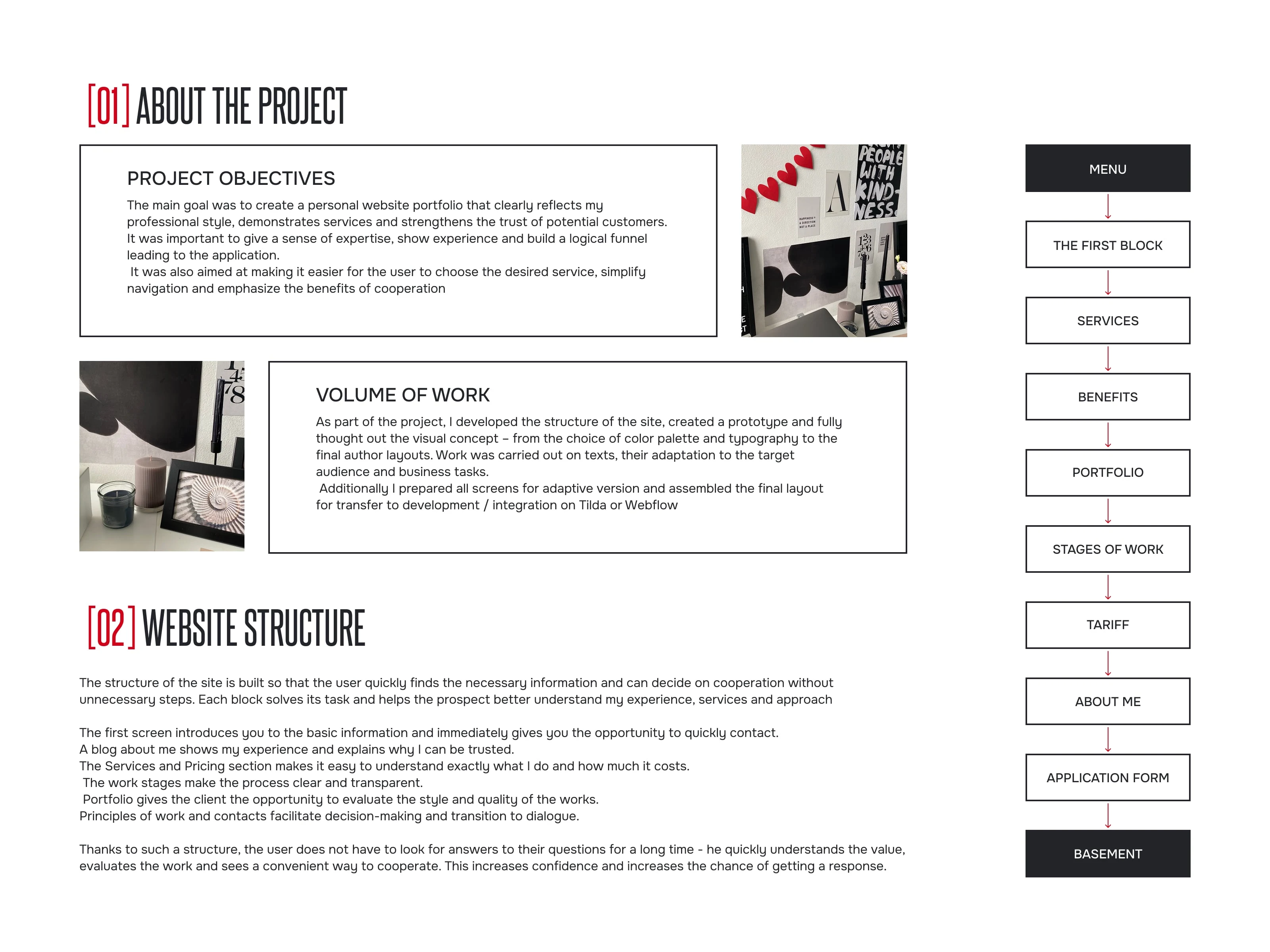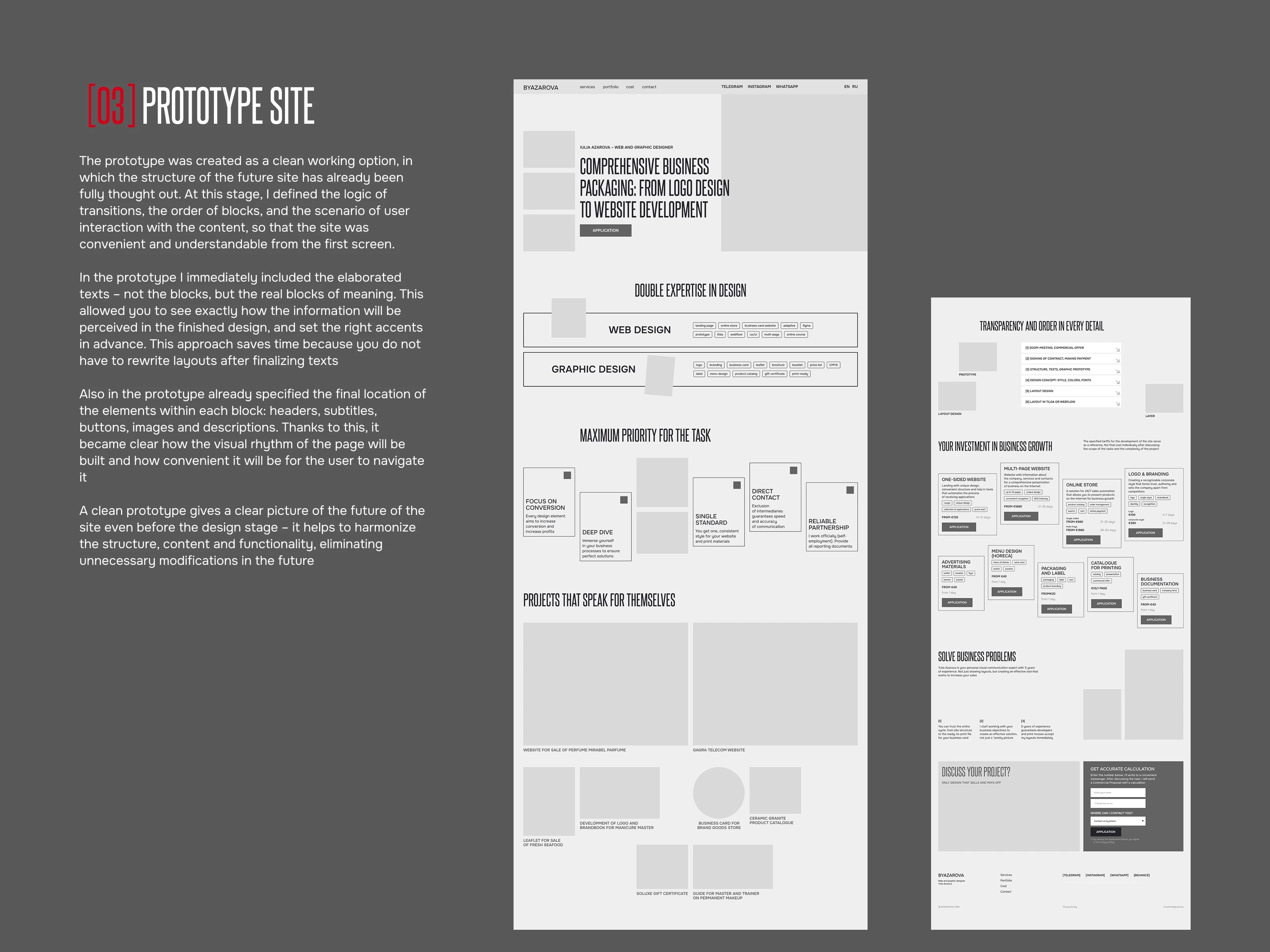 Prototype & Content-First Approach: A high-fidelity prototype was created with final, real content—not placeholder text. This content-first approach ensured that the visual design was perfectly adapted to the specific informational weight of the texts (e.g., case studies, pricing tables), minimizing costly design revisions later. The prototype defined the final logic, navigation, user scenario, and visual rhythm across all screens.