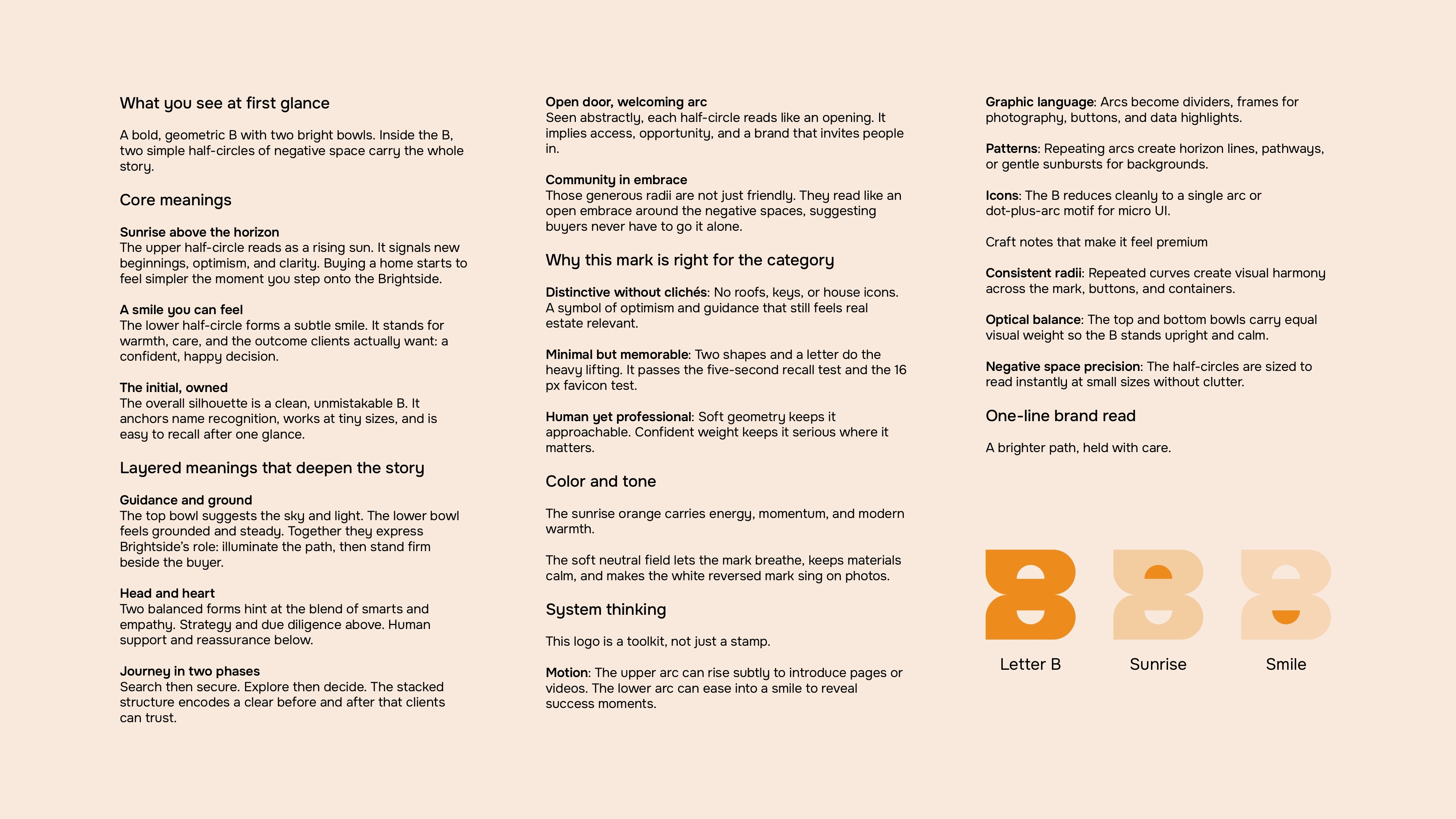 Designed Brightside Buyers’ brand identity with a sunrise-inspired B mark and warm visual system, guiding home buyers with clarity, optimism, and trust.