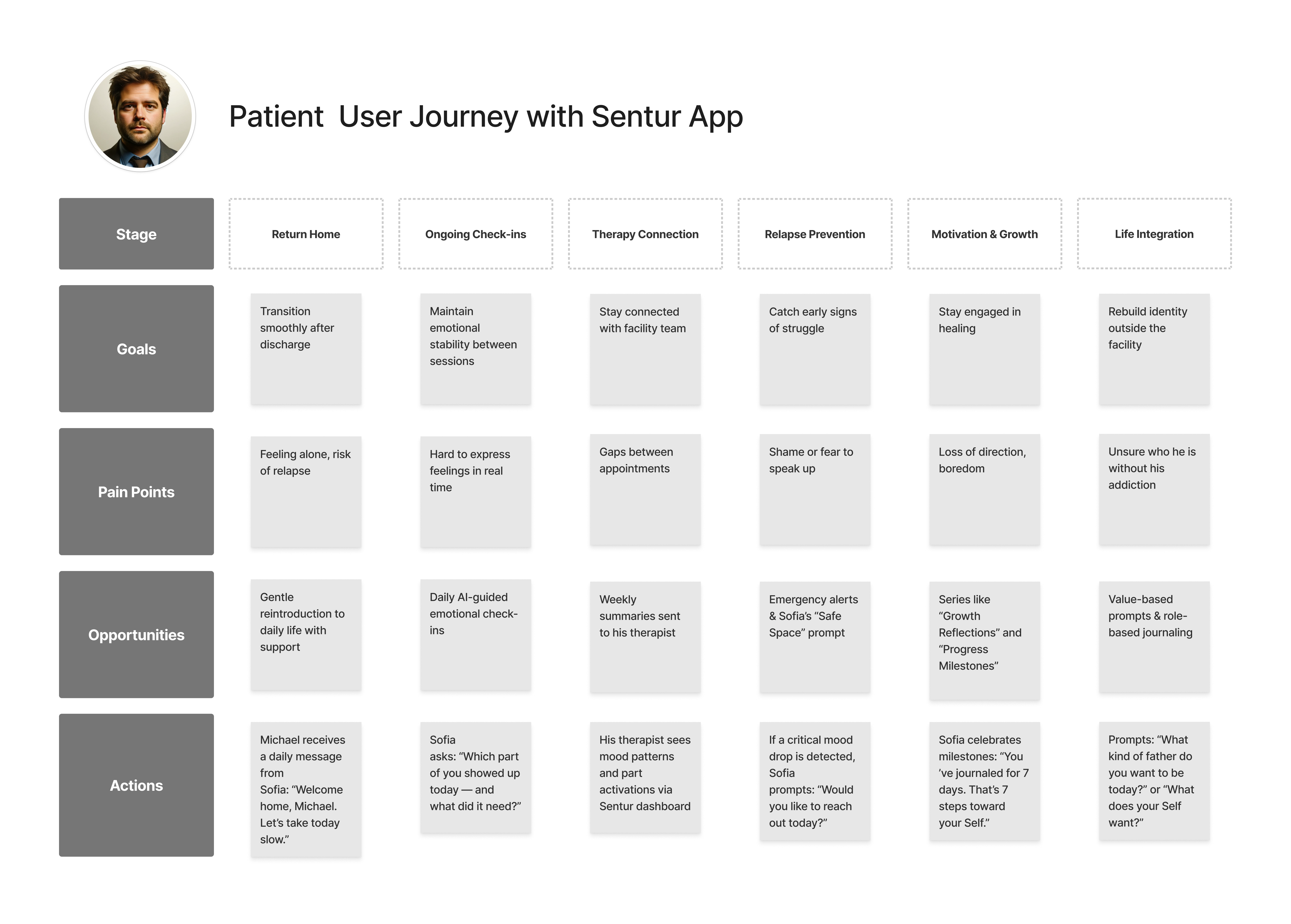 Sentur is a mental health platform designed to enhance communication and care between patients in treatment and their clinicians. The system includes one mobile app for patients and a web-based dashboard for clinicians. It offers a structured and compassionate approach to tracking emotional states, identifying internal parts, and maintaining engagement between sessions.