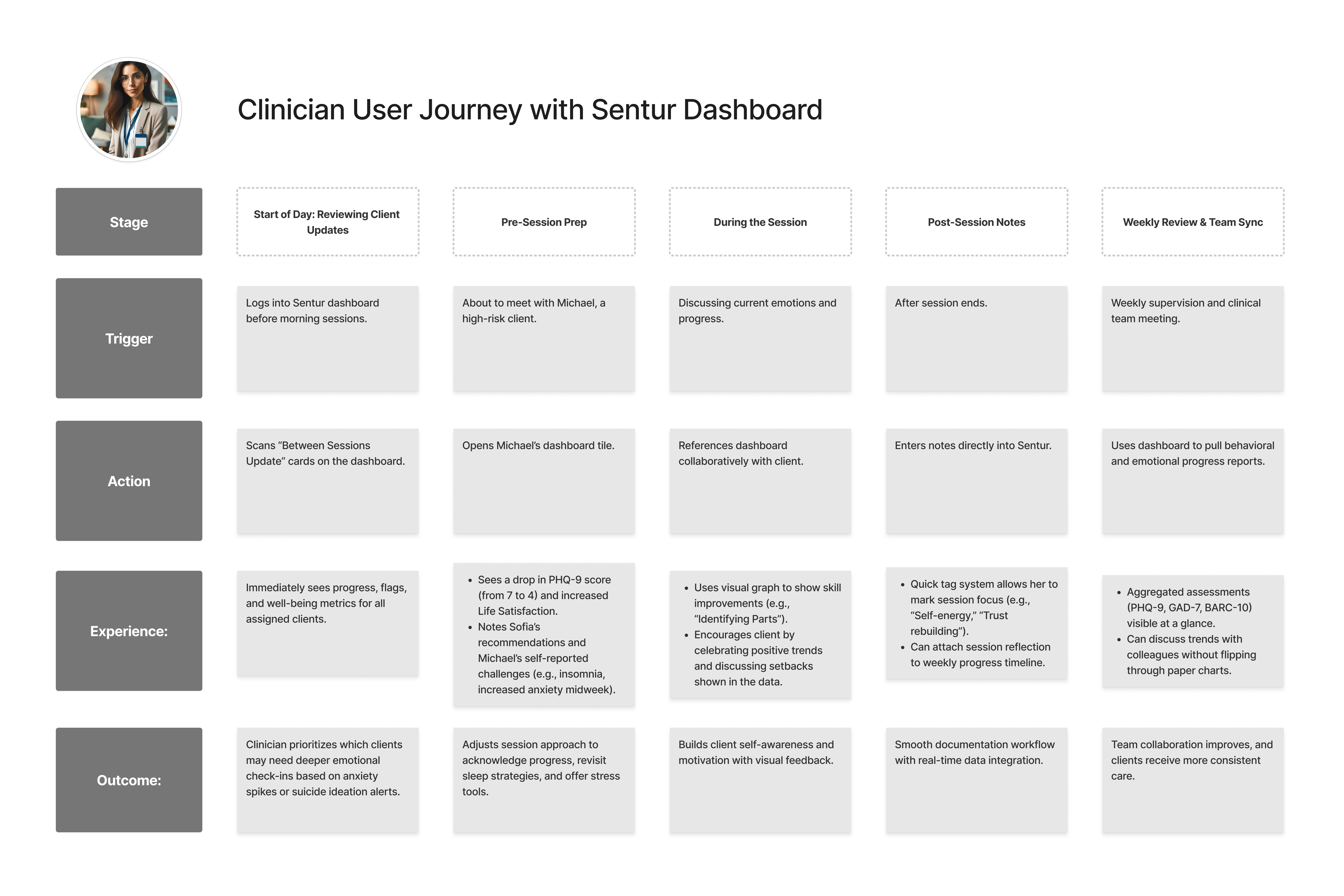 I mapped out detailed journeys for both patients and clinicians to make sure each interaction felt intuitive and meaningful. For clinicians, the flow needed to support quick scanning and prioritization. For patients, I focused on simplicity and emotional safety—helping them feel seen, supported, and empowered in their healing journey.