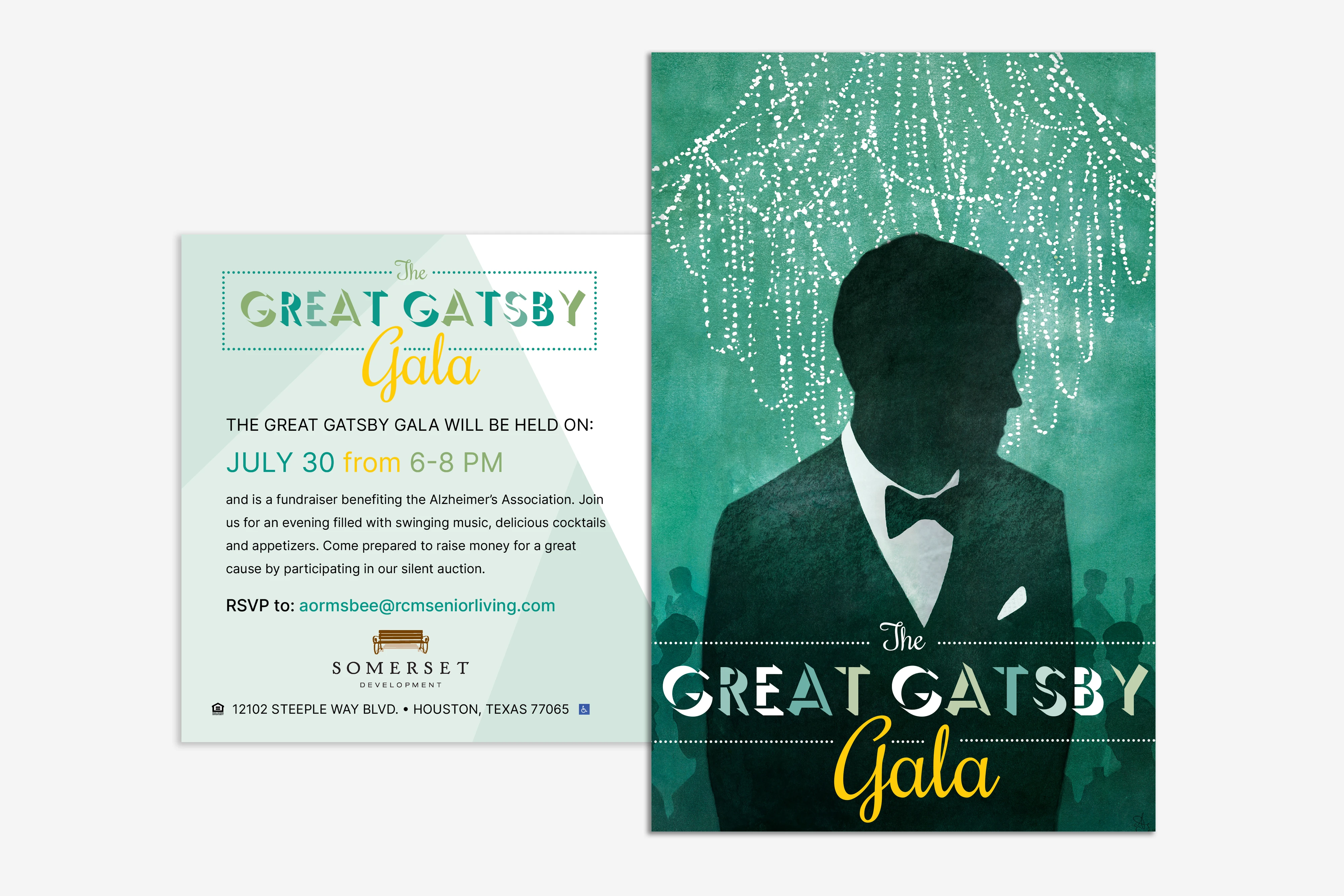 Fundraising event direct mailer for the “Great Gatsby Gala,” created to support the Alzheimer’s Association. The imagery was selected to visually interpret the event’s theme, drawing from the iconic style and symbolism of the classic novel to convey elegance and a sense of occasion.