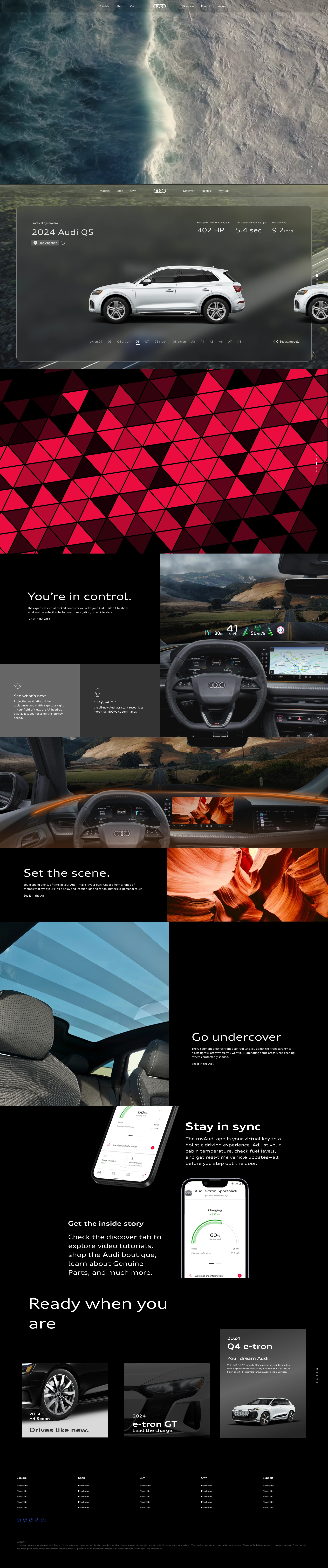 👨💻As a Product Designer, I was given the mission to take multiple previous proposals from the team and, within a tight two-week deadline, craft an entirely new vision—one that broke conventions and redefined Audi’s digital presence. This project focused on transforming Audi's homepage into a modern, visually striking, and interactive experience designed to boost engagement and enhance user interactions. Several proposals were developed, leveraging videos, scroll-based animations, and an intuitive navigation system that emphasized Audi’s core attributes: luxury, technology, and innovation. Throughout the process, my ability to think outside the box, approach challenges creatively, and prioritize the user’s emotions was highly praised and recognized.💡