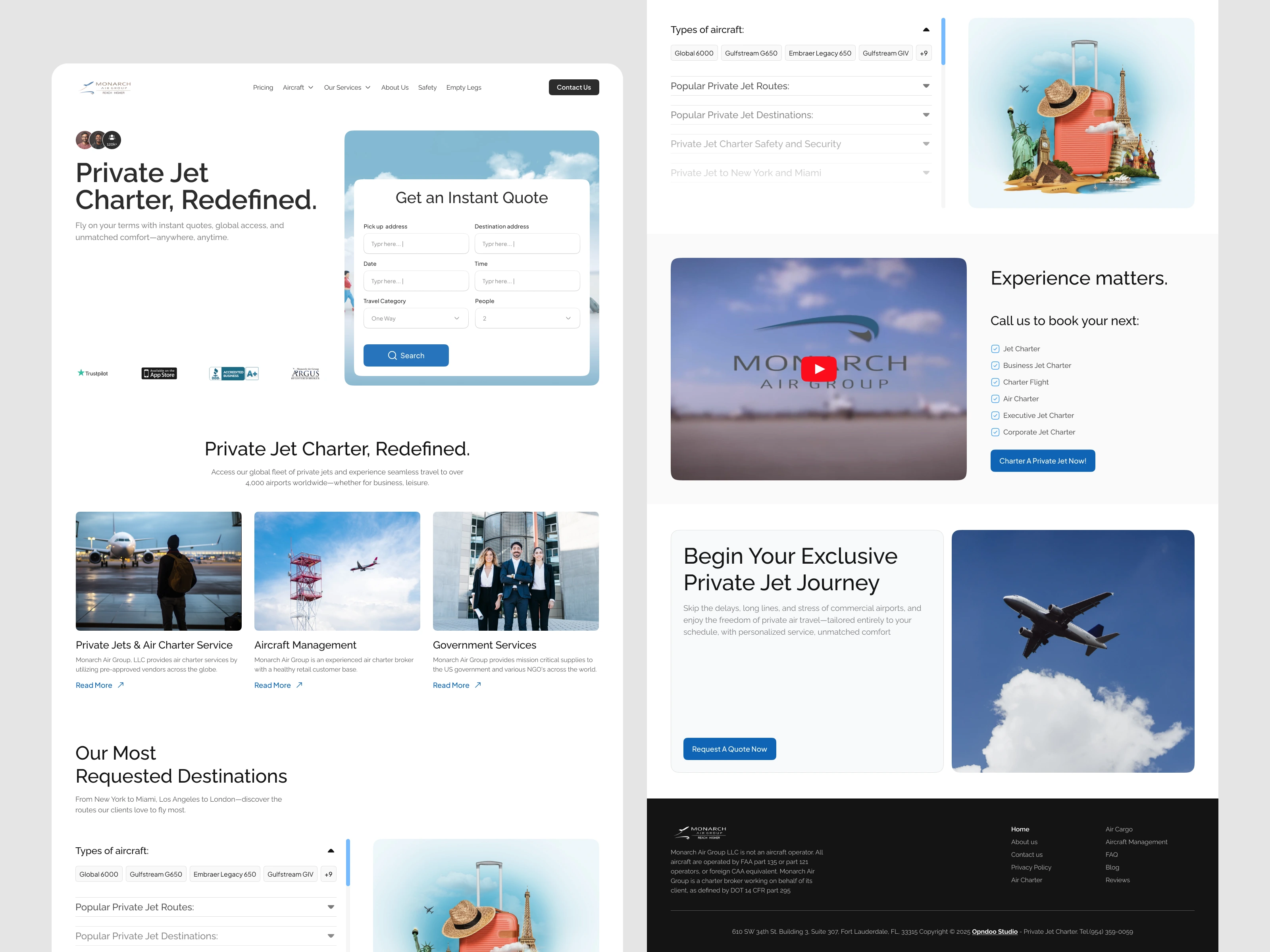 After: The new design introduces a modern, user-focused experience with a clear visual hierarchy, refined typography, and a clean layout. The structure prioritizes conversion through a simplified instant quote form, service highlights presented with engaging visuals, and destinations organized into easy-to-scan sections.