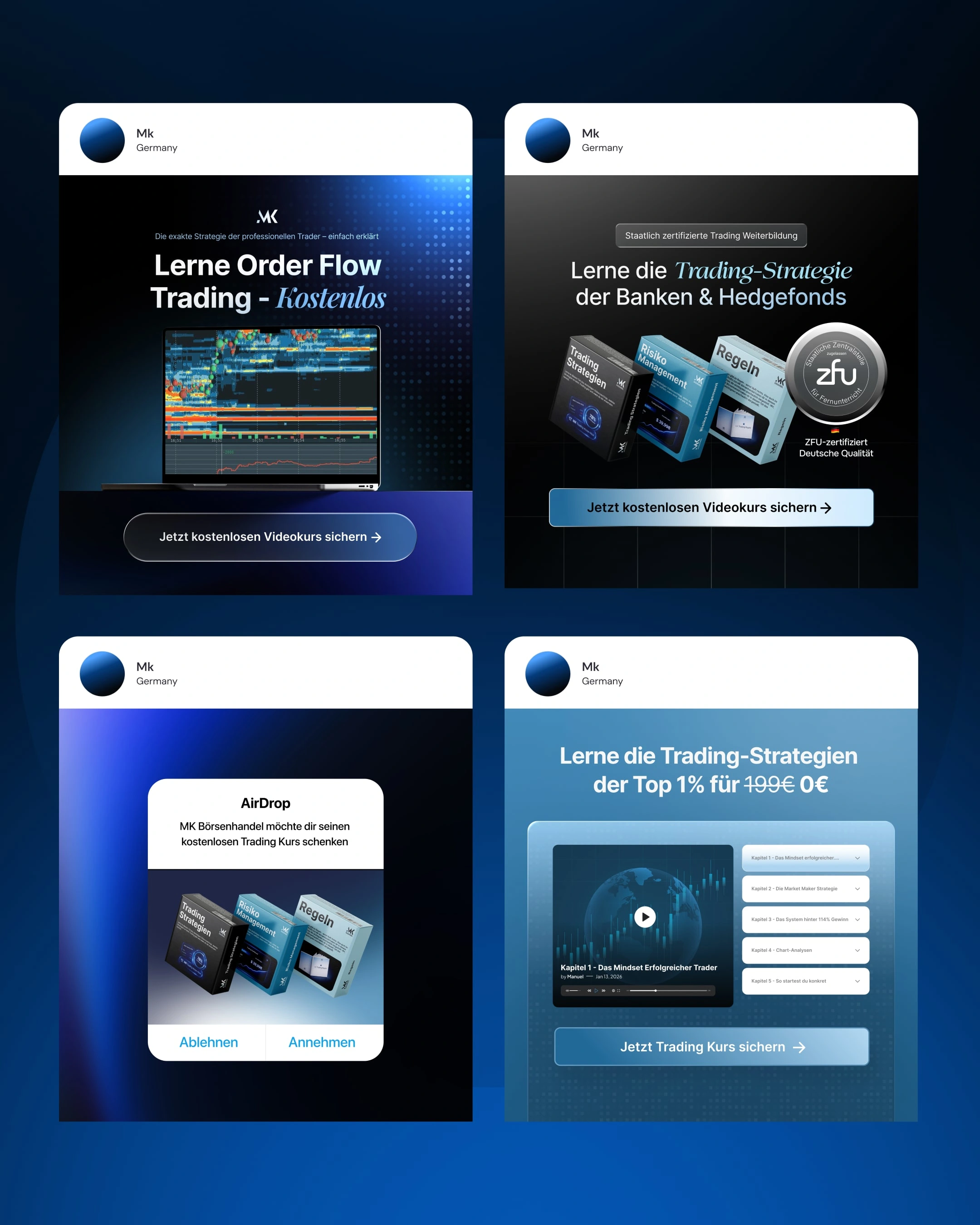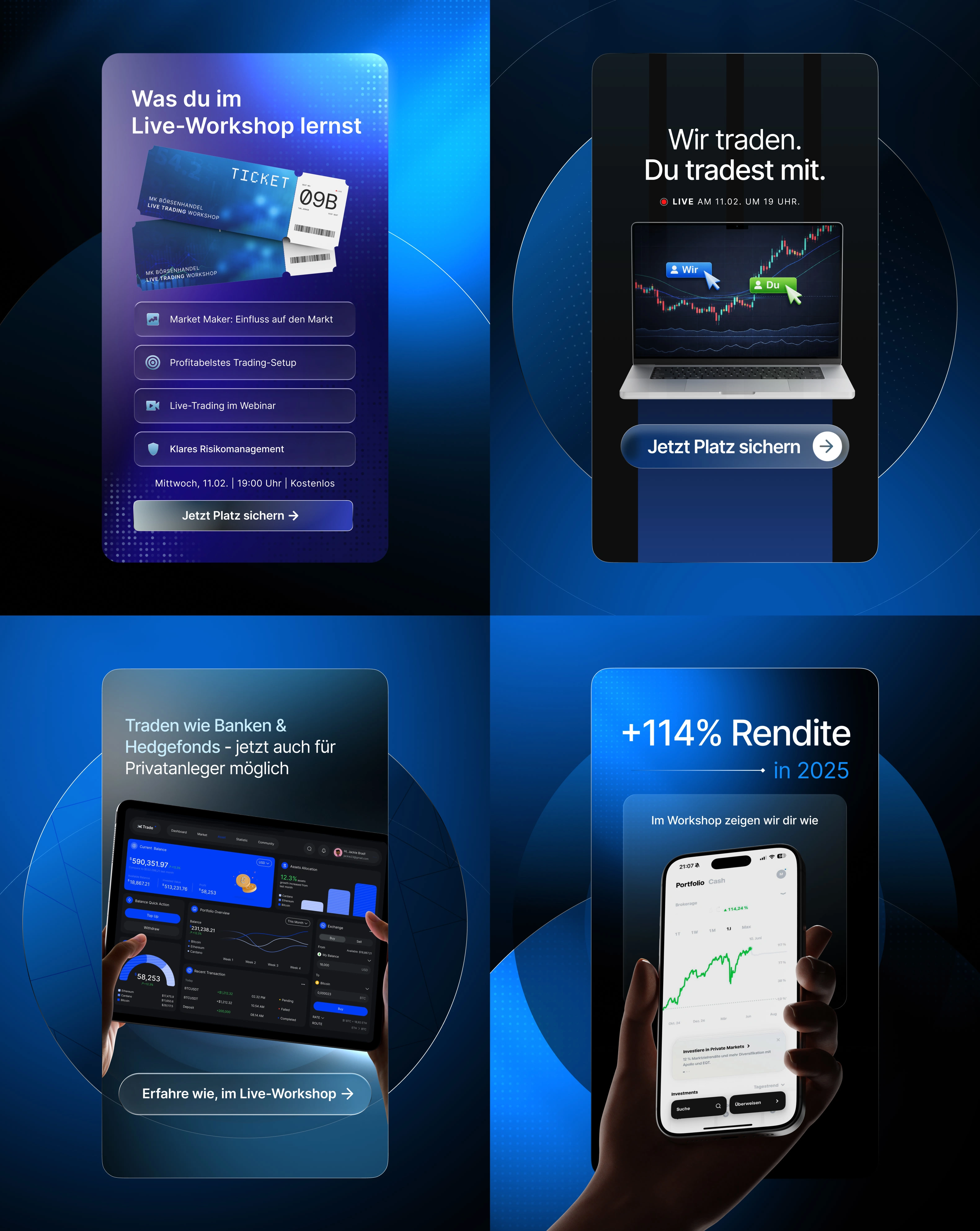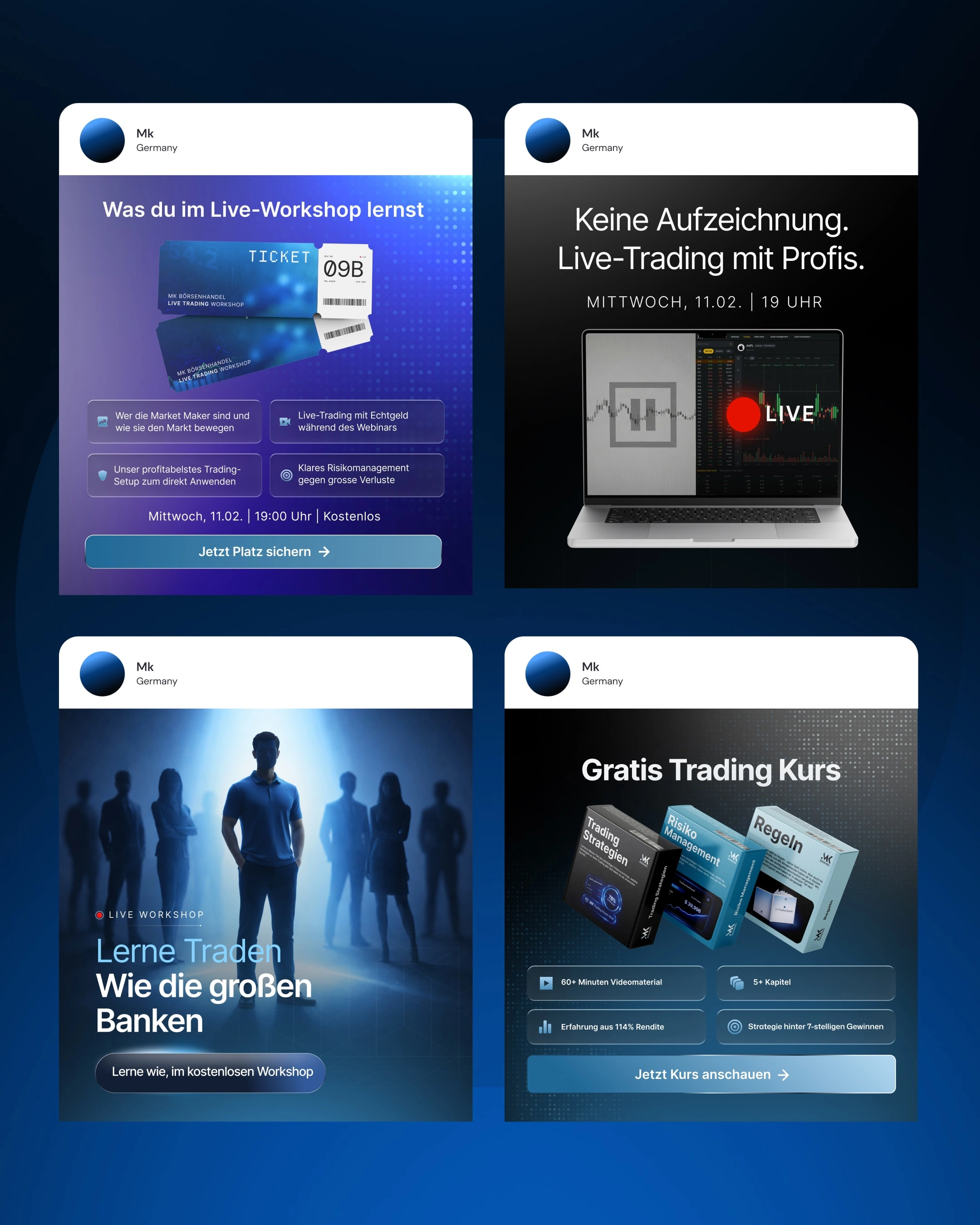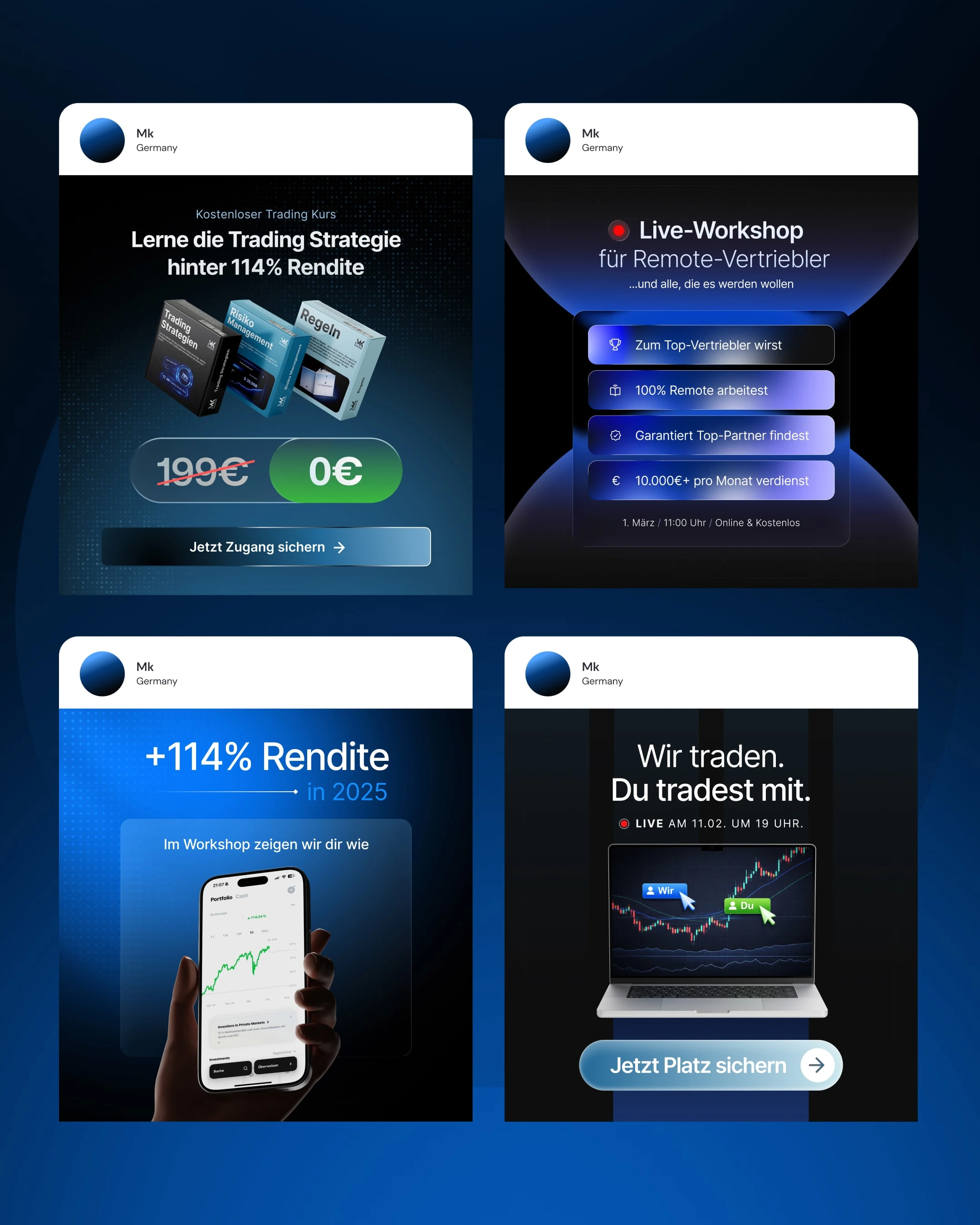 Static ad designs for a premium trading course. Built for Meta (Instagram and Facebook) Stories and Feed with focus on conversion and mobile optimization.