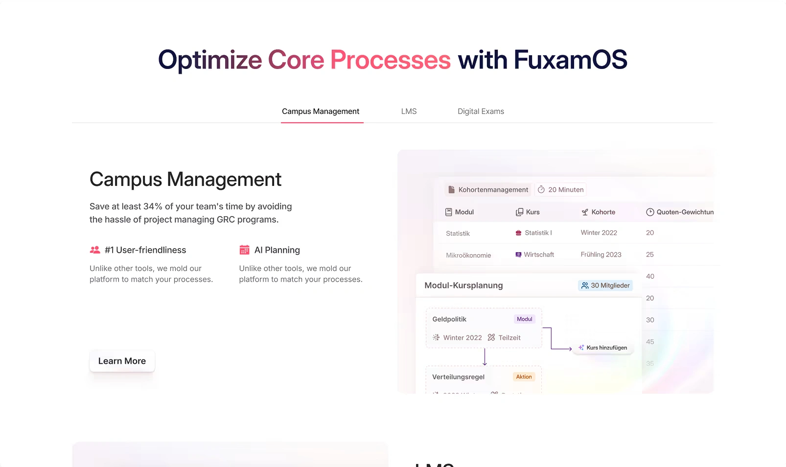 FuxamOne is an all-in-one, AI-powered software platform for education, designed to simplify campus management, learning management, and digital exams. It serves universities, vocational schools, and academies of all sizes, making complex education workflows intuitive and scalable.
