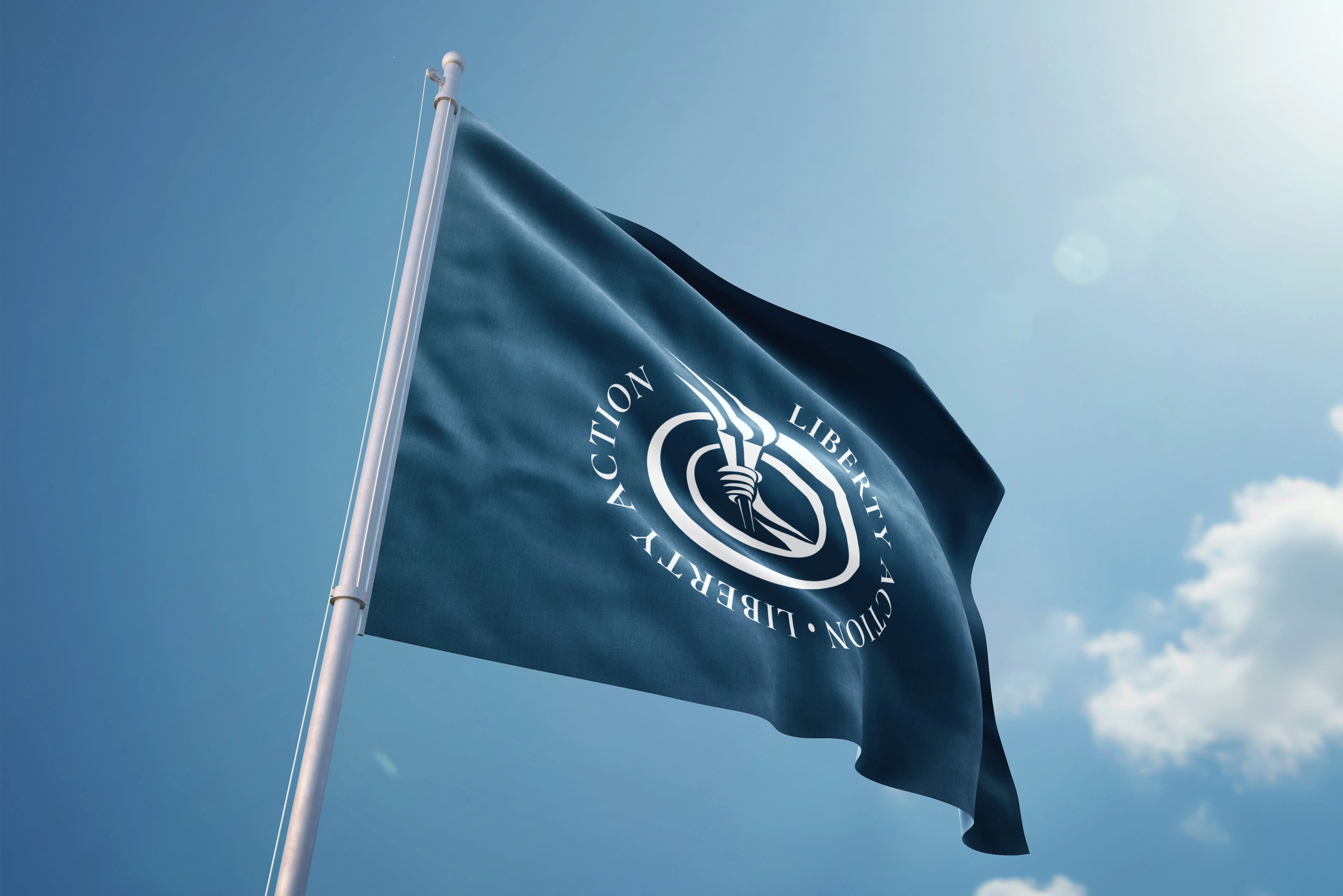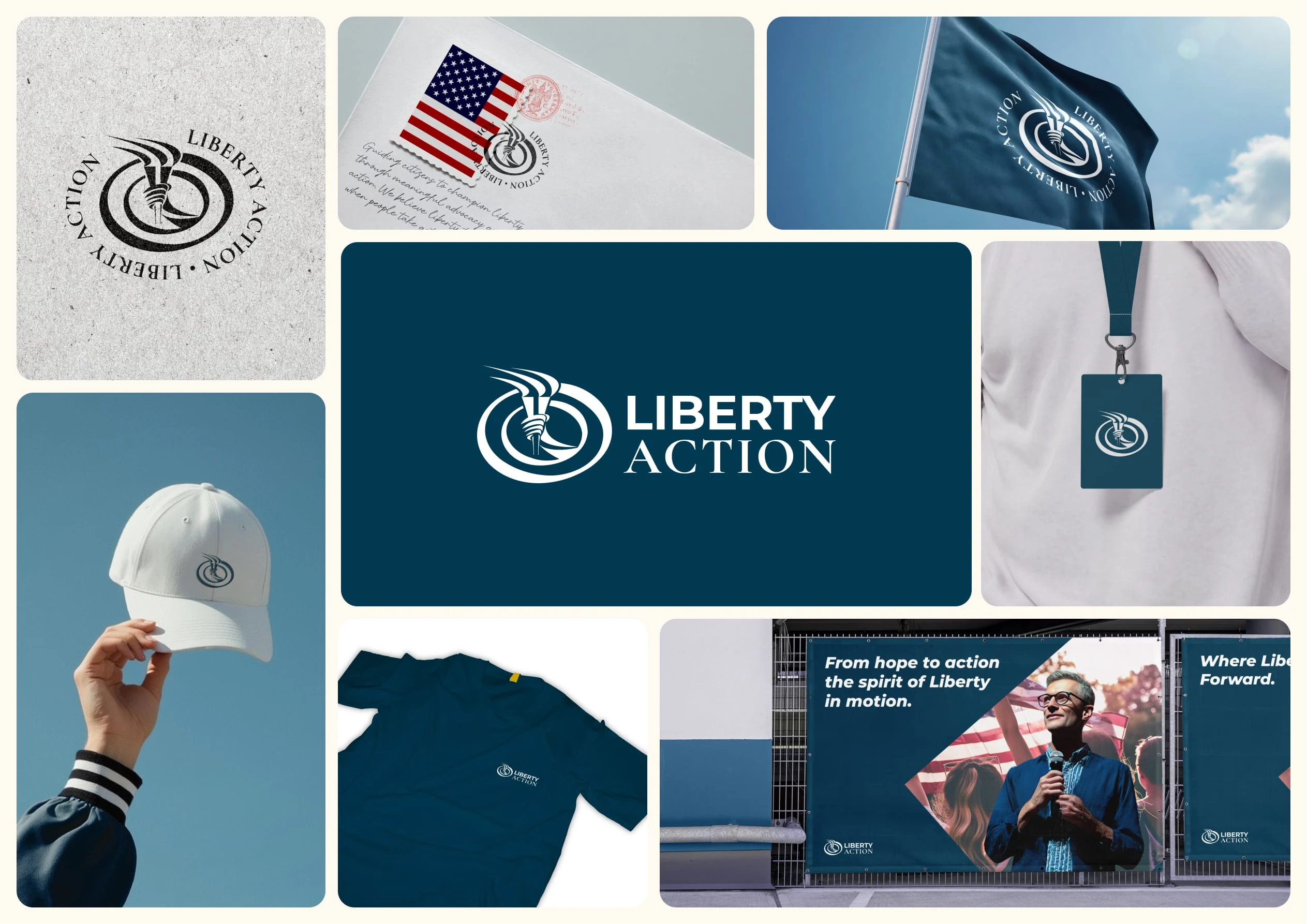 The logo concept is anchored in the universal symbol of the torch, representing hope, courage, and guidance. By integrating human elements such as the hand and flame, the mark conveys not only liberty as an ideal but also the human action required to protect and sustain it. Complementing typography choices—Montserrat Black Italic for energy and momentum, paired with Cormorant Garamond for elegance and timelessness—reflect both activism and heritage.