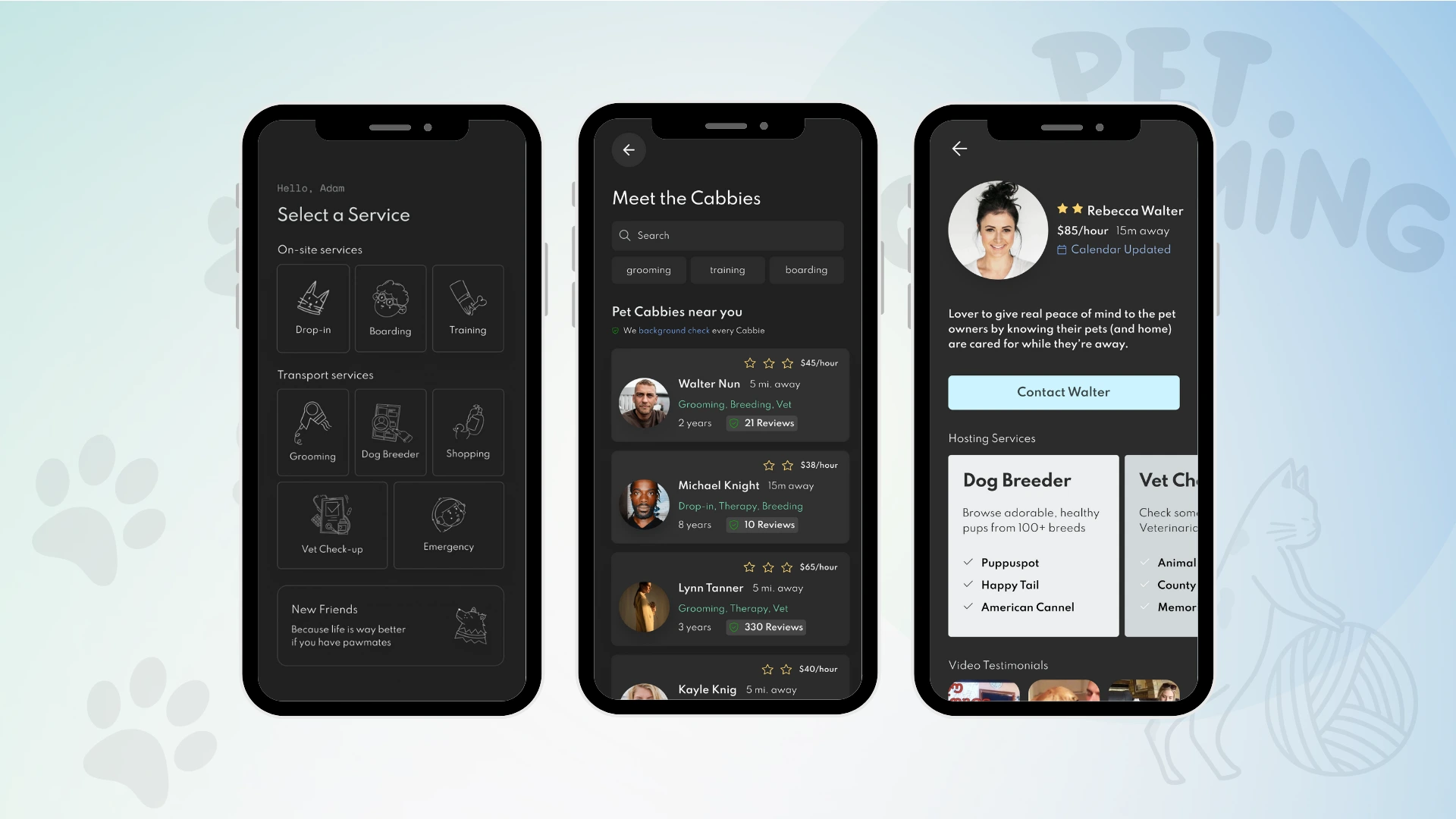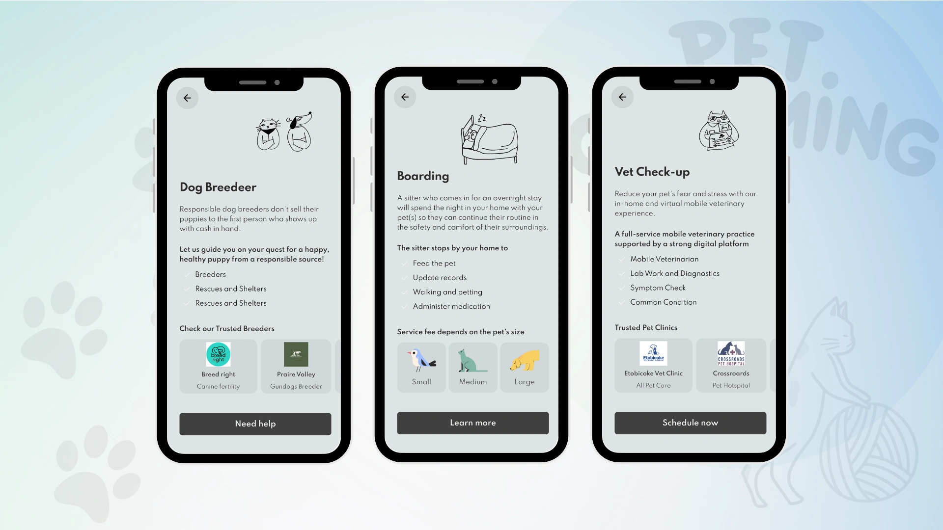 The project began with in-depth user research and persona development, revealing a key insight: pet owners don’t just need convenience — they need confidence. Many users were hesitant to leave their pets with someone new, so the interface had to communicate warmth, reliability, and professionalism from the very first screen.
