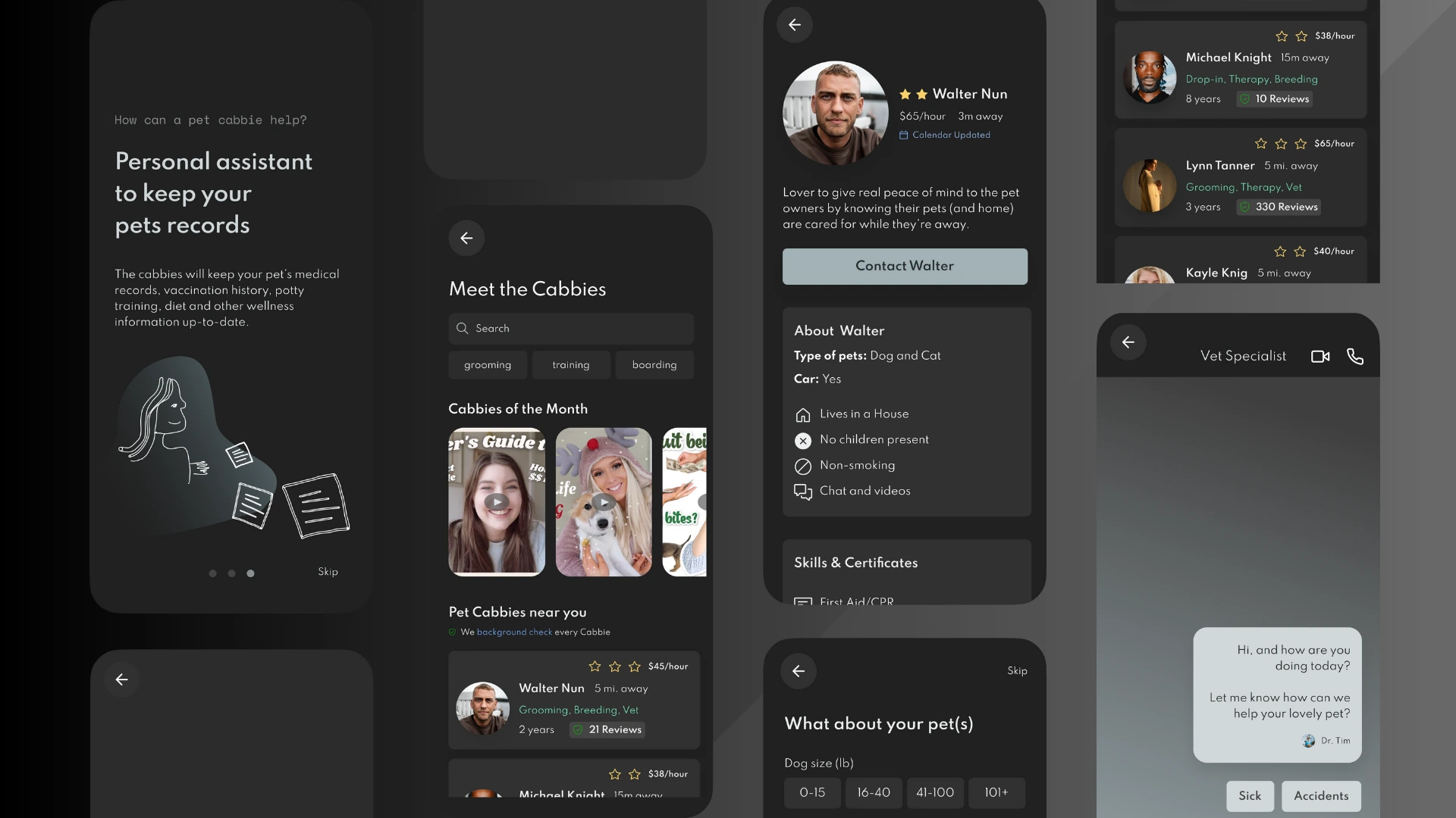 I crafted a trust-centered onboarding flow that introduces the “Cabbie” (caretaker) profile upfront, allowing users to view qualifications, reviews, and messaging options before booking. This interaction design choice significantly improved engagement by creating a sense of safety and authenticity.