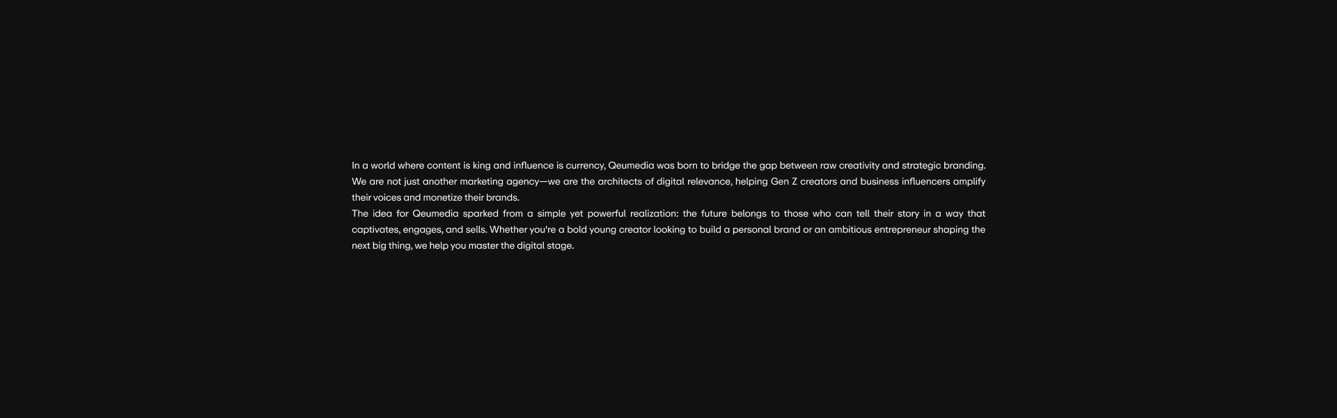 Qeumedia helps Gen Z creators & brands grow, captivate & sell with bold storytelling & digital strategy. We turn raw creativity into real influence.
