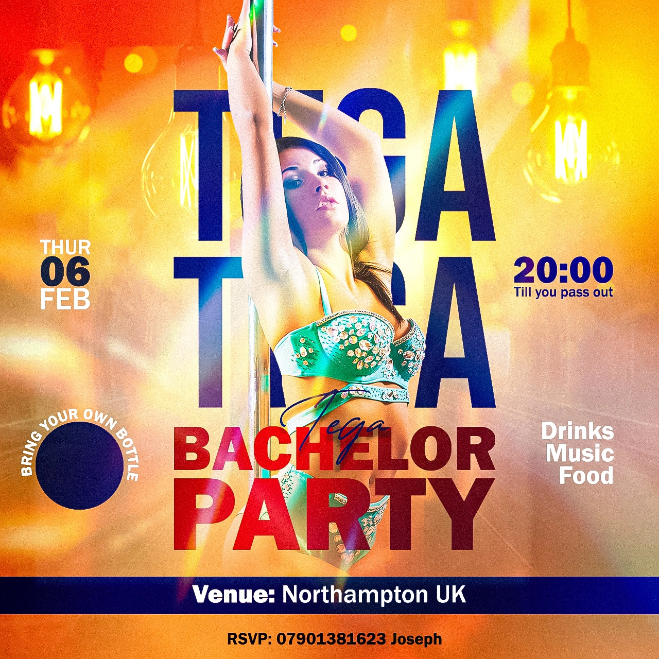 This flyer was created for Tega’s Bachelor Party, a lively and unforgettable event set to take place on February 6th, 2025, in Northampton, UK.