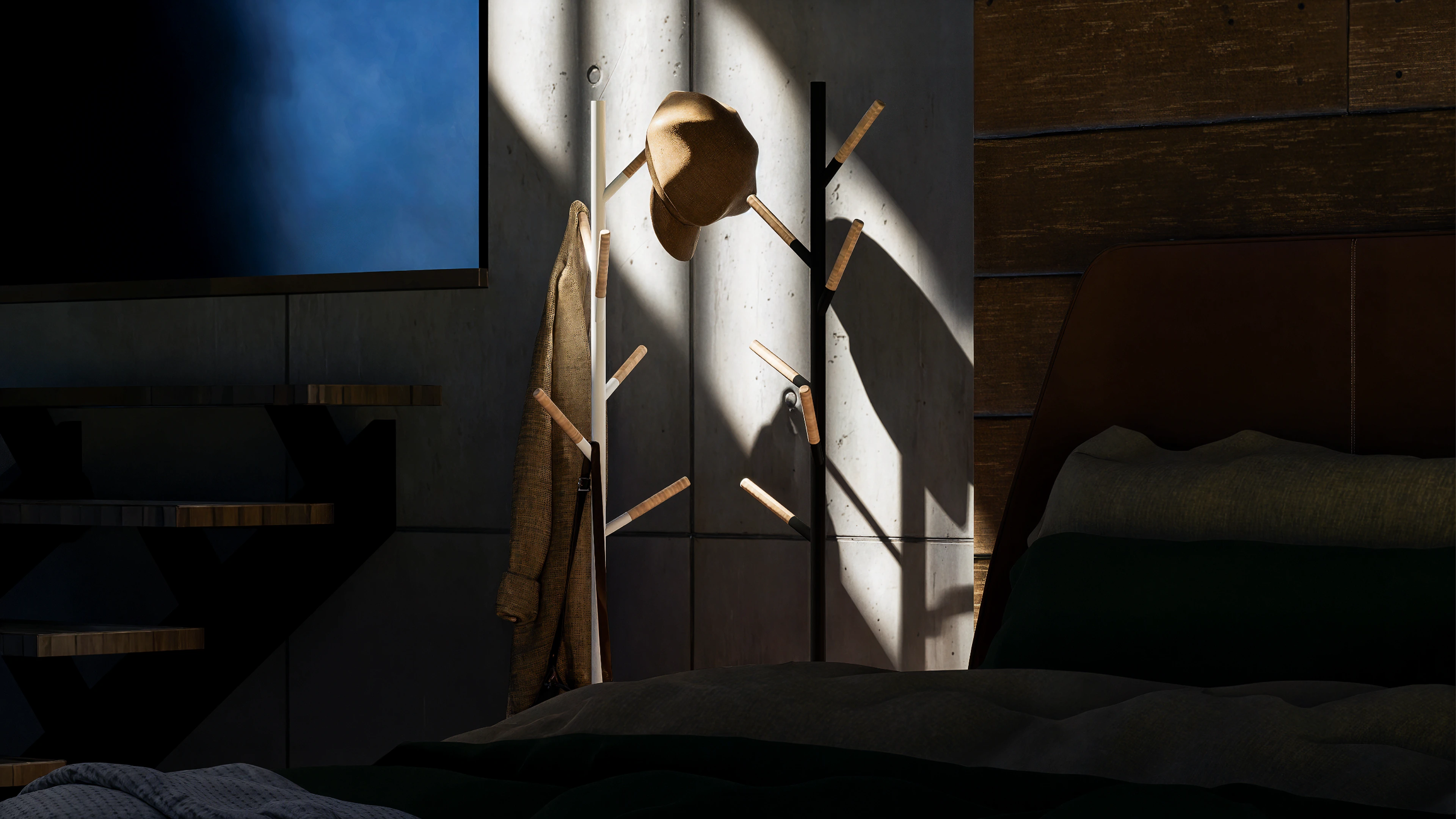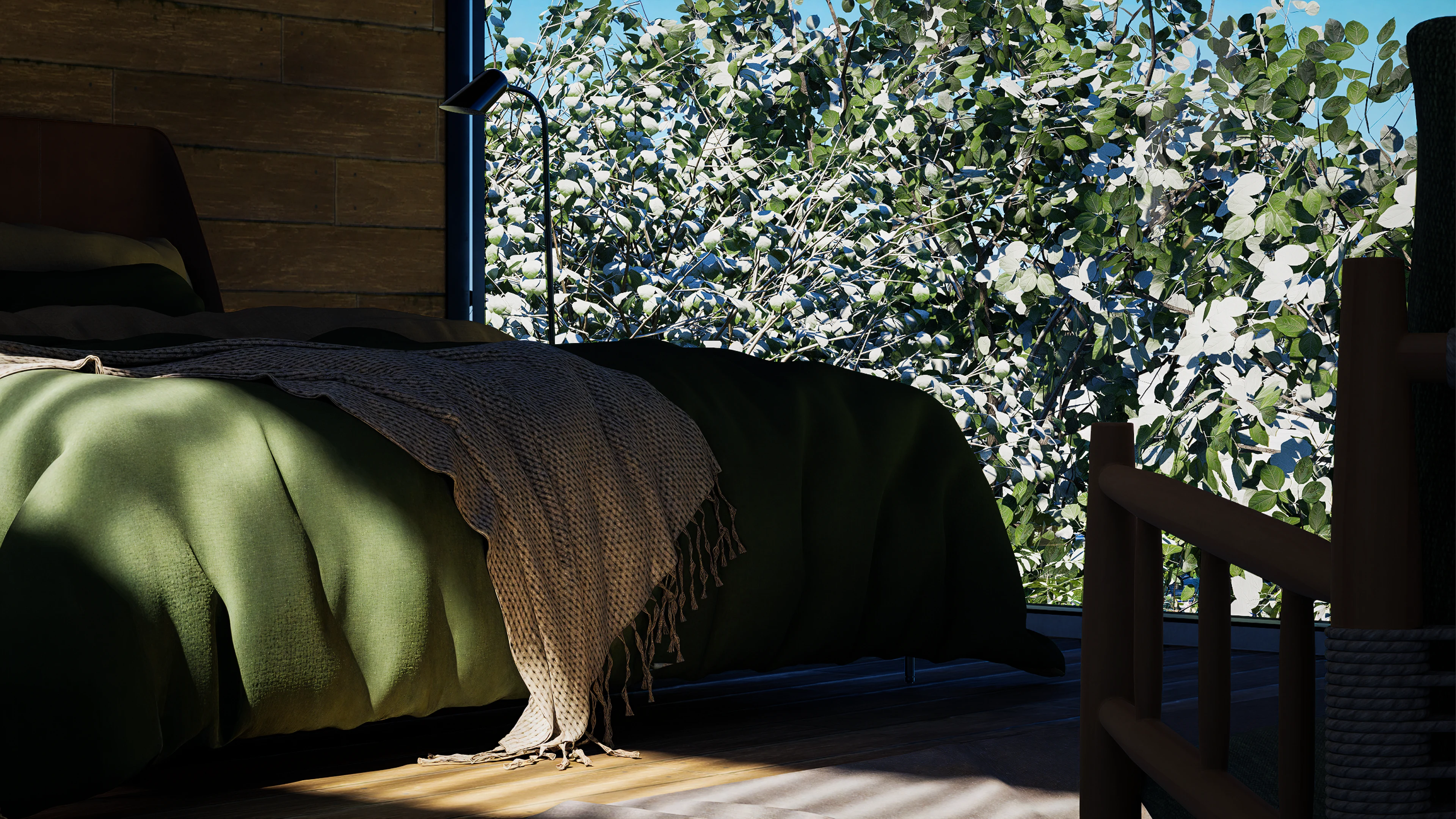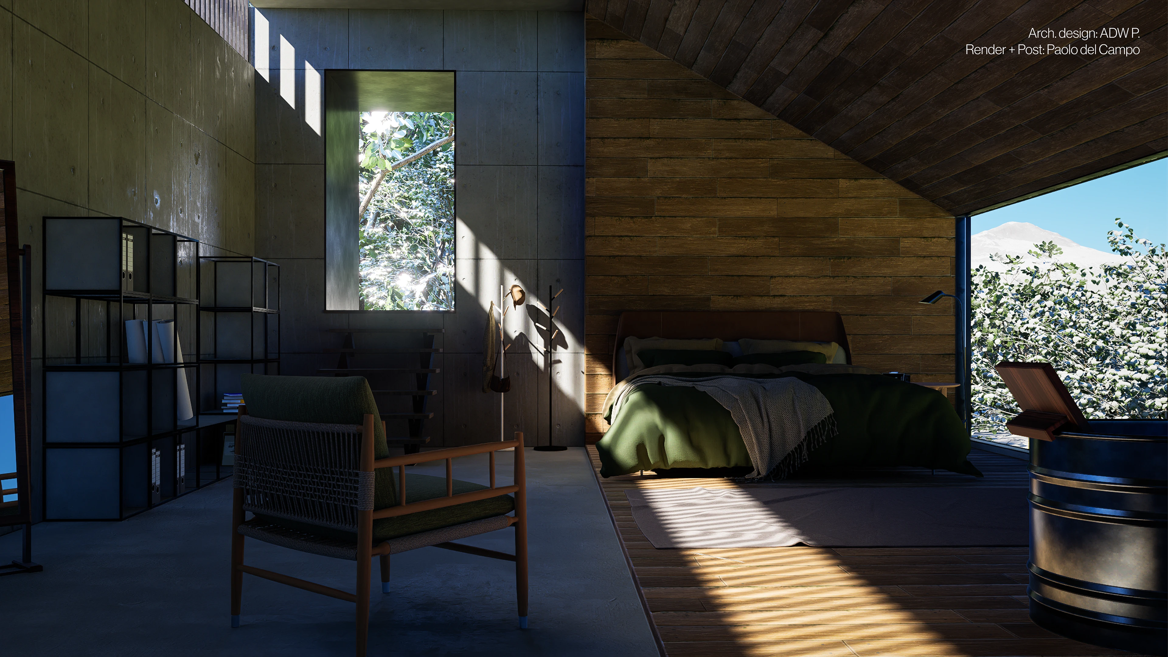 The Beam is a serene bedroom retreat where concrete and wood meet, illuminated by a single ray of light framing the natural view.