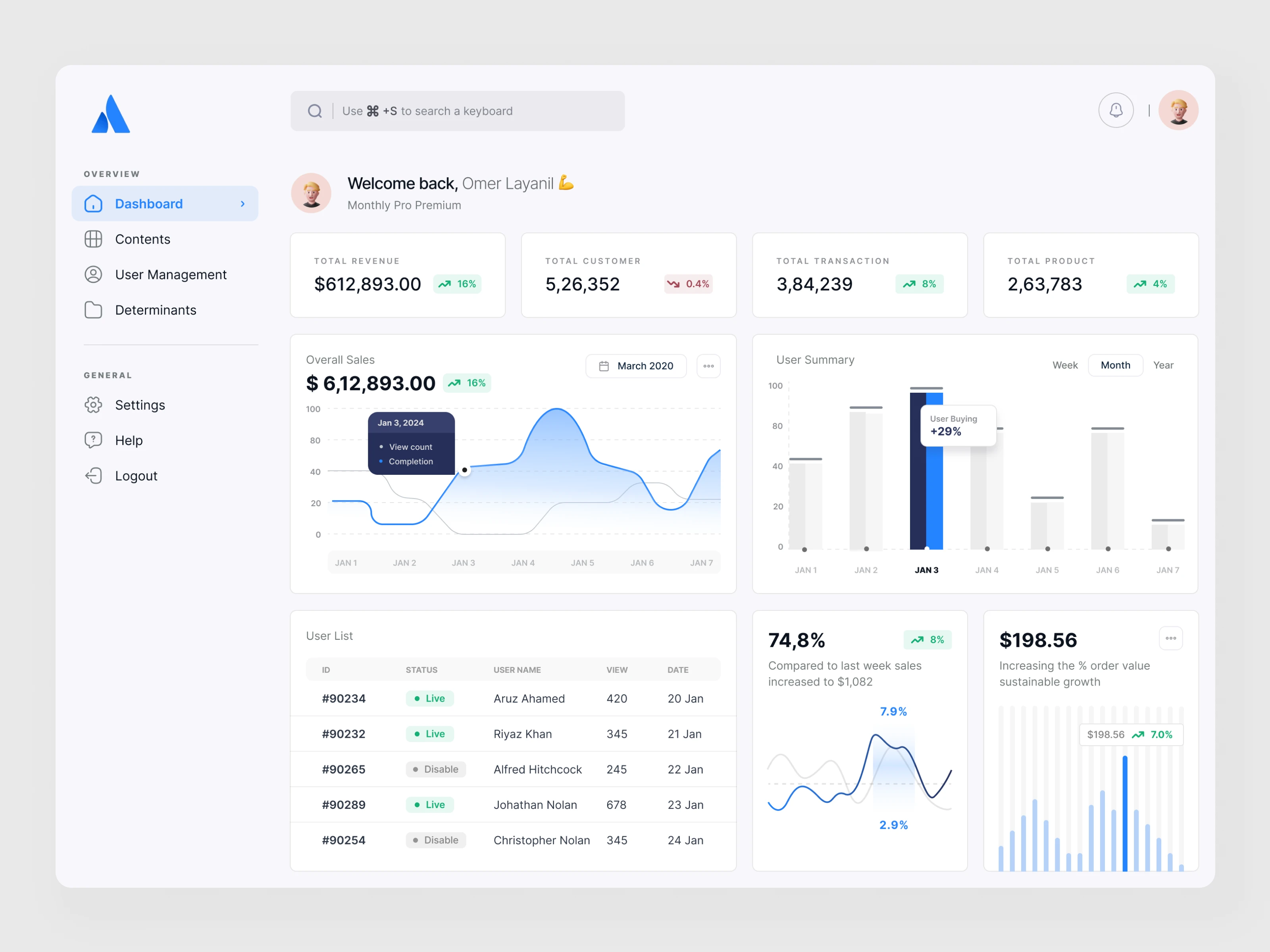 This project is a modern SaaS analytics dashboard designed to help businesses monitor revenue, customers, transactions, and product performance in one centralized interface.