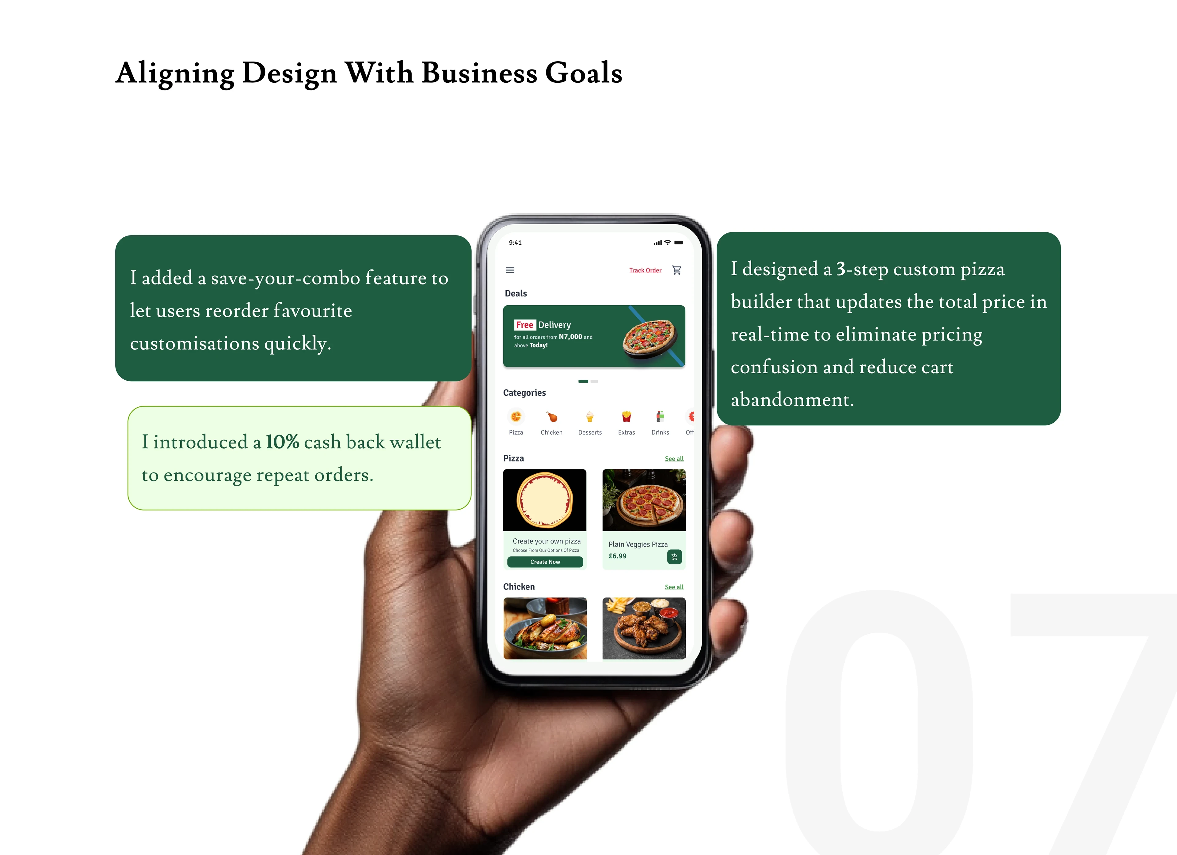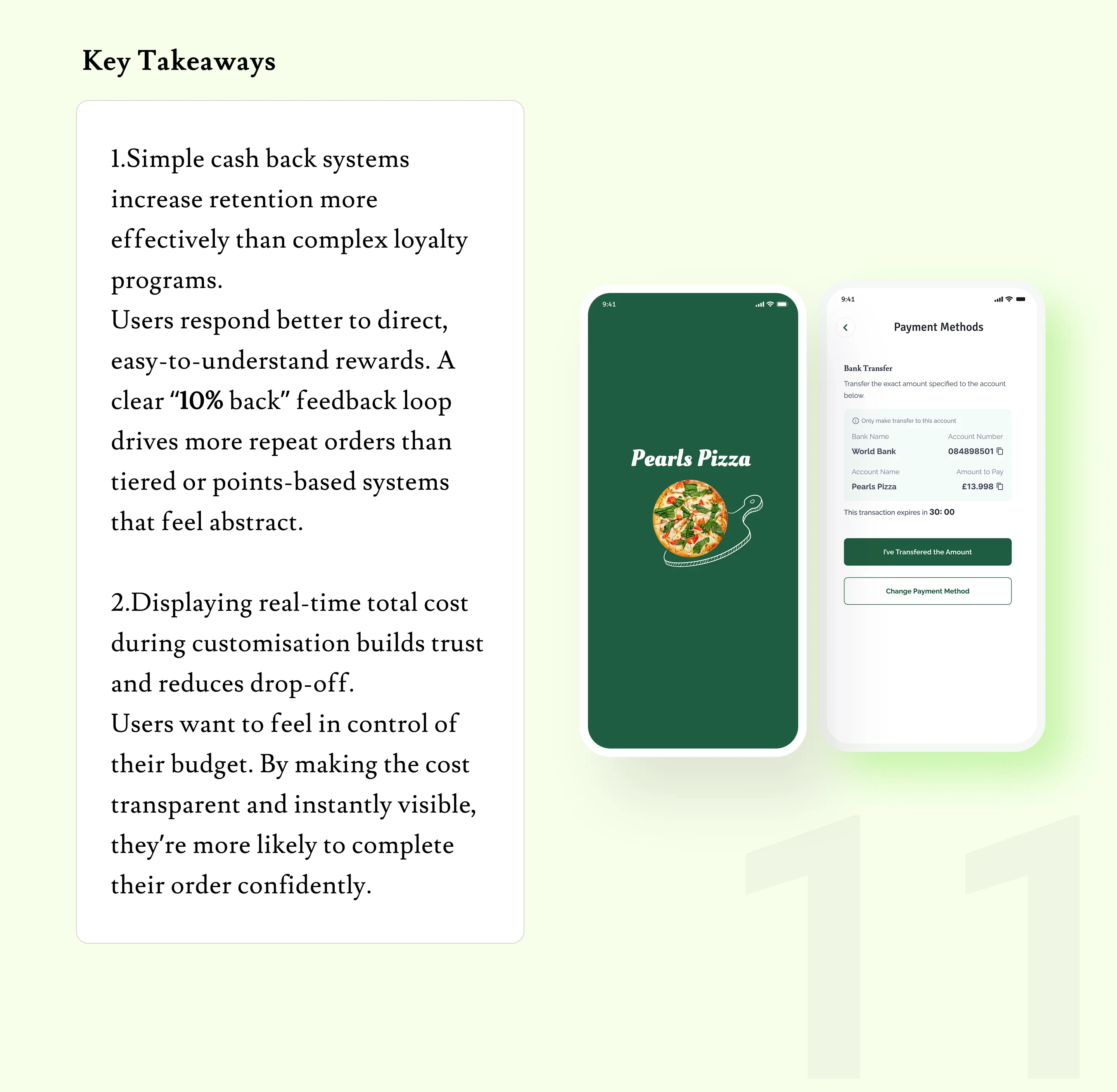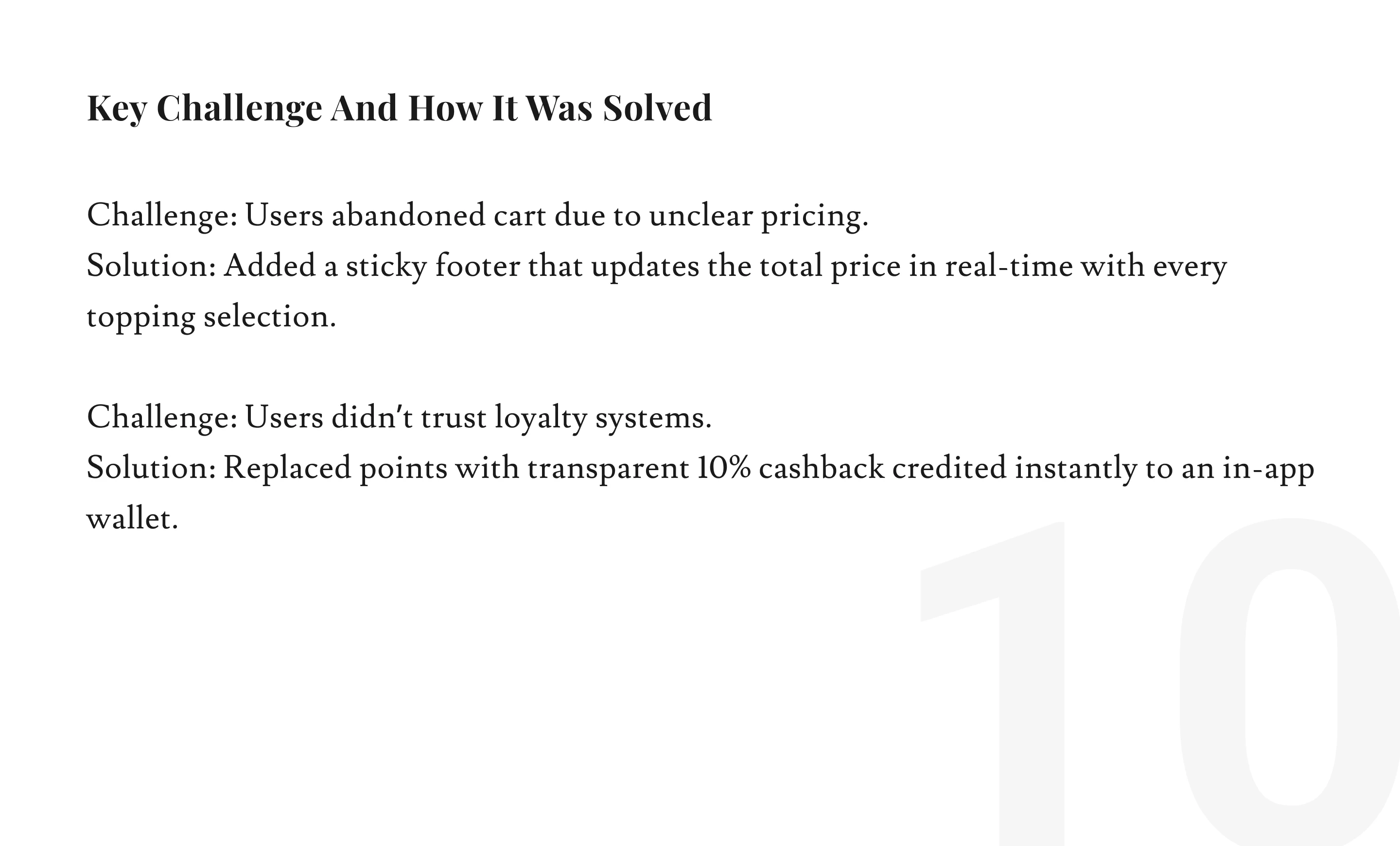 Repeat Orders Increased by 26% Saving favourite combos and adding instant 10% cash back nudged users to come back without needing reminders.