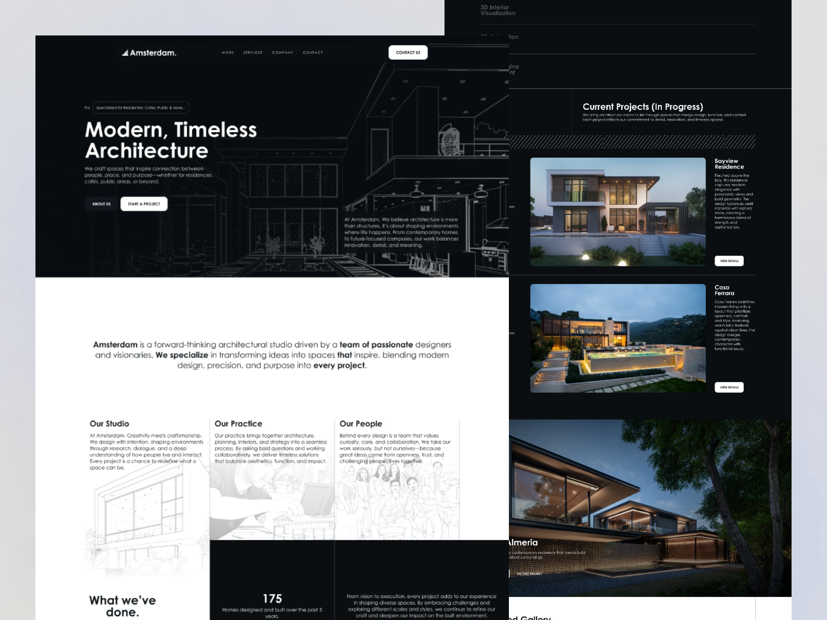 Designed this experimental landing page and branding for Amsterdam Architecture Studio, drawing inspiration from timeless design and award-winning aesthetics. The concept emphasizes clarity, sophistication, and trust—showcasing architecture as more than structures, but as experiences that connect people, place, and purpose. The identity is sleek and minimal, with a strong geometric foundation that communicates stability and vision. Clean typography, balanced layouts, and subtle architectural line art highlight the studio’s modern yet human-centered approach, creating a narrative that is both professional and approachable.
