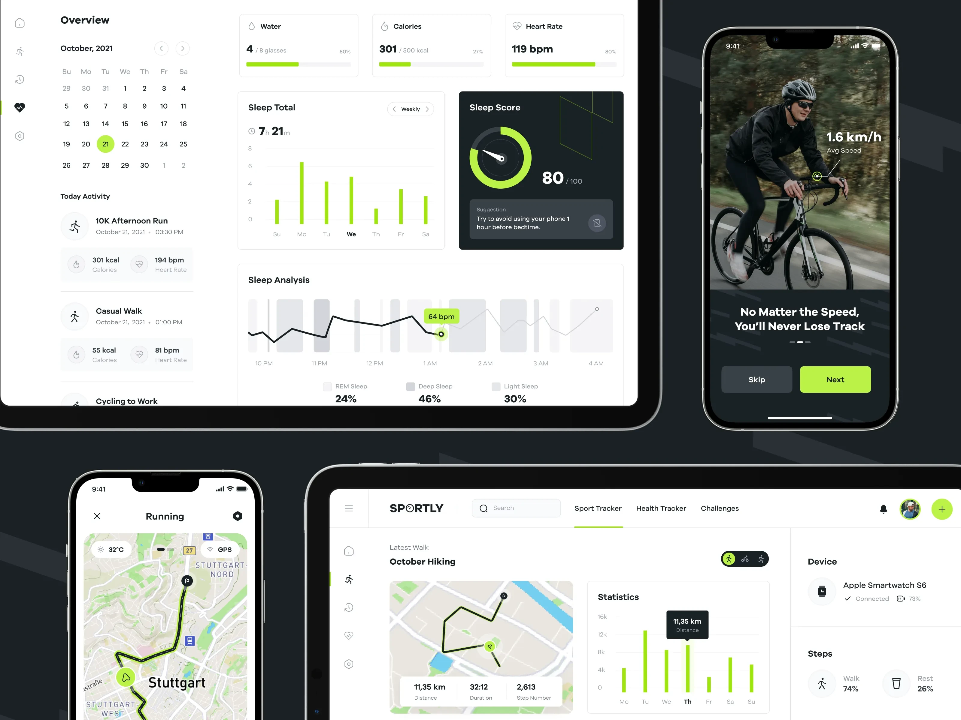 Sportly is a comprehensive health and fitness platform designed for runners, cyclists, and wellness enthusiasts. I led the end-to-end product design, focusing on clean UI, accessibility, and data visualization.