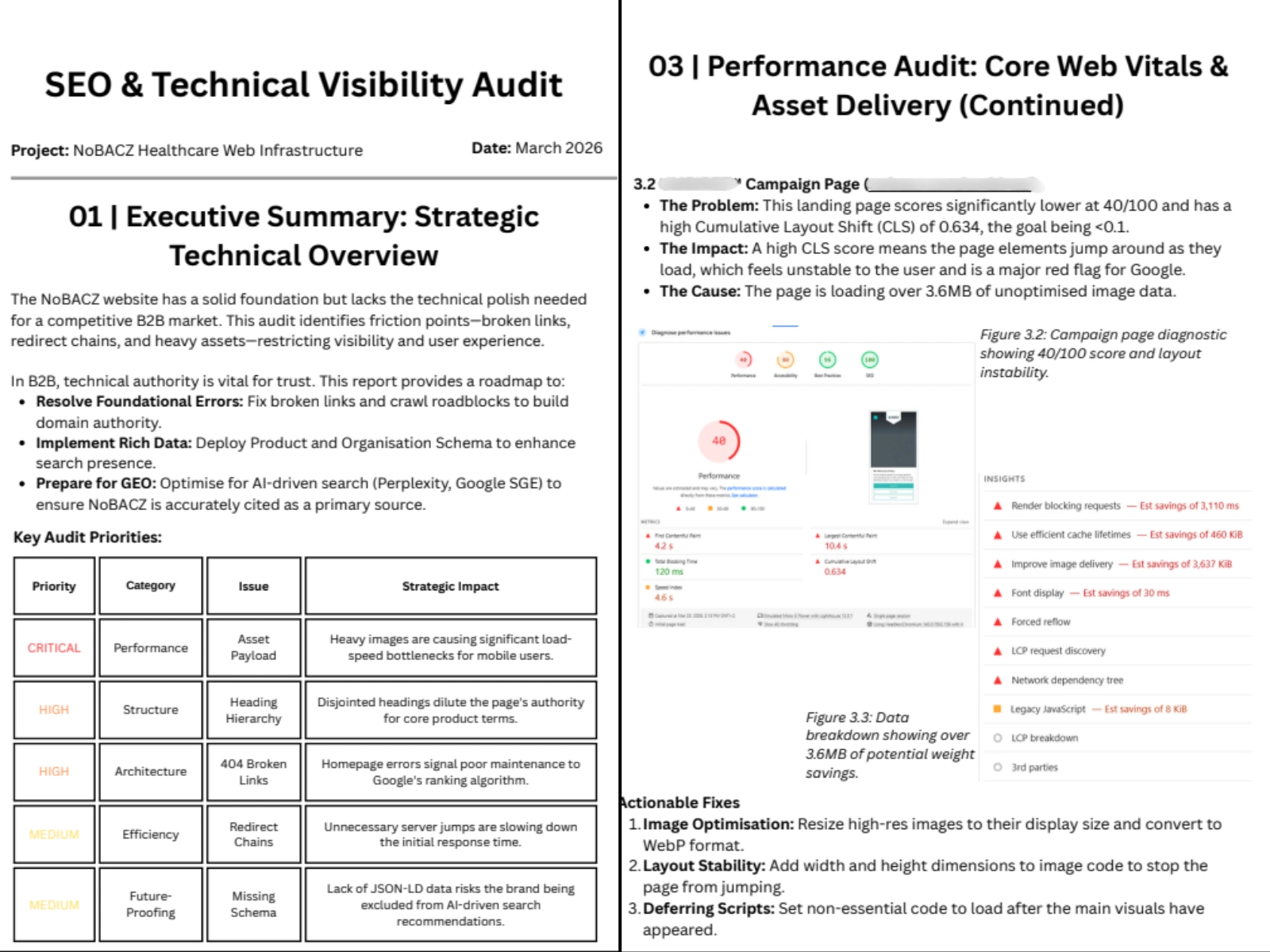 B2B Animal Healthcare: 11-page technical audit identifying infrastructure gaps. Resolved crawl errors, optimised Core Web Vitals and built a 2026 GEO roadmap.