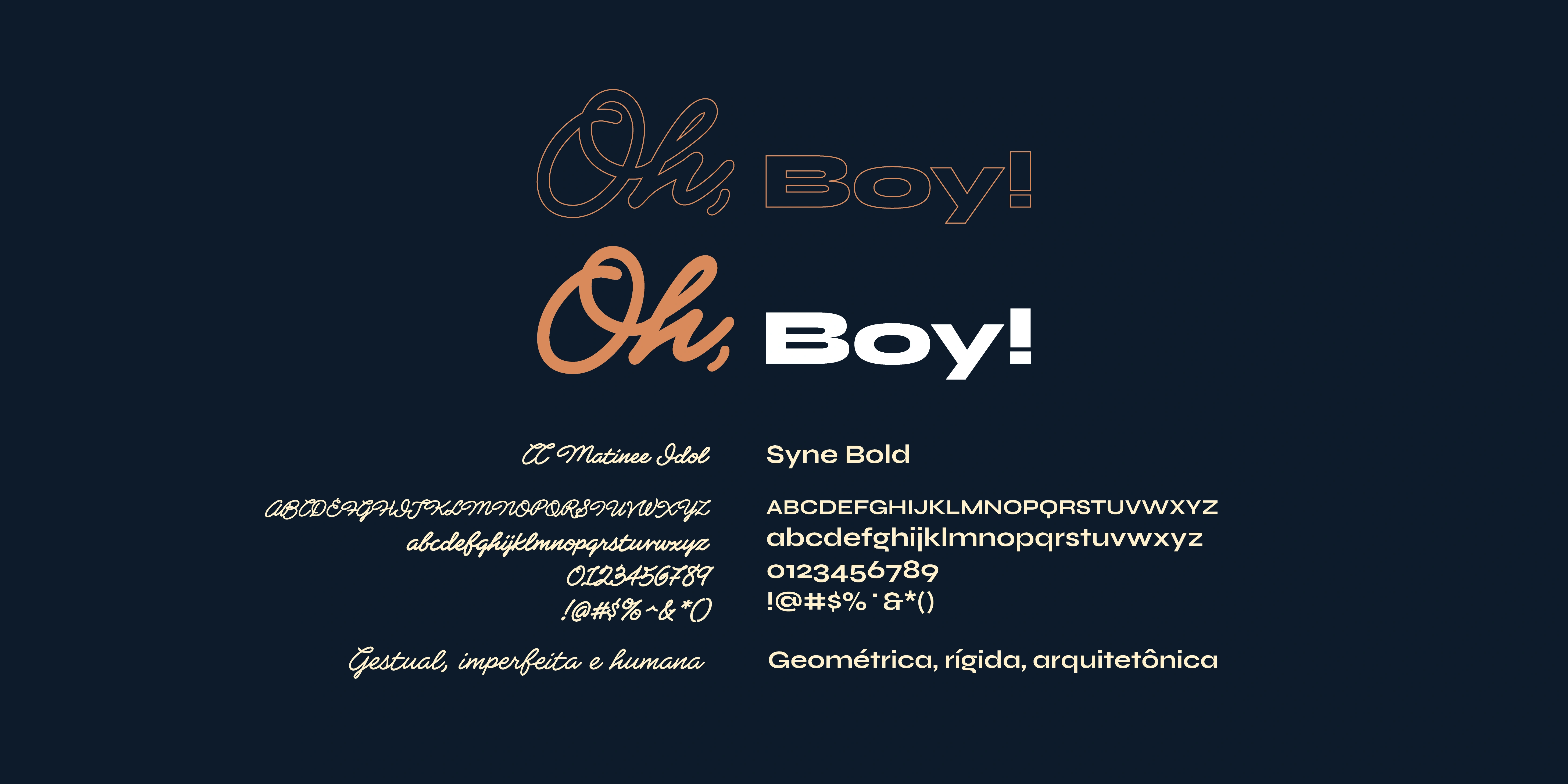 Selected CC Matinee Idol for the "Oh," bringing calligraphic fluidity and a human touch, contrasting sharply with Syne Bold for the "Boy!" which acts as a heavy, geometric urban anchor.