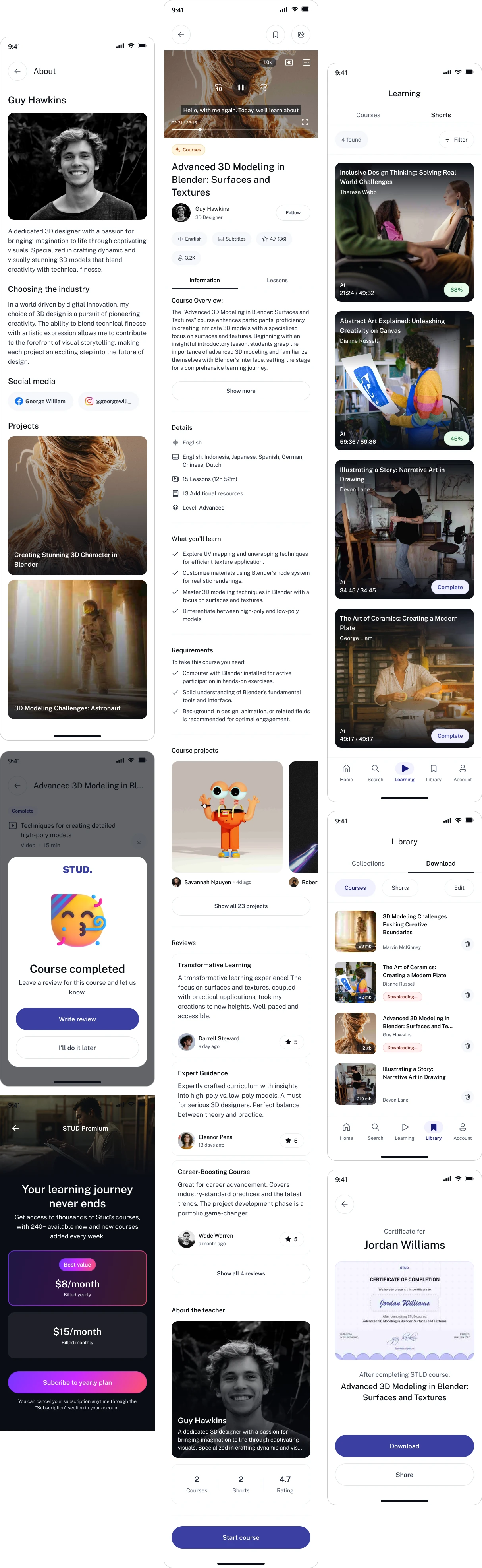 The project included designing the full product — from onboarding to course libraries, instructor profiles, and gamified progress experiences — across mobile and desktop platforms.