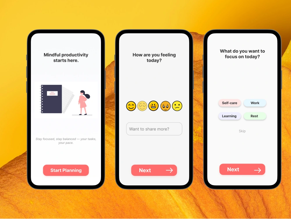 Mind-Task Calm is a conceptual productivity app that combines task management with mindfulness techniques to help users focus, stay calm, and beat overwhelm. This mobile app design was created as a full UX/UI case study, aimed at helping modern professionals manage both tasks and mental well-being in one experience.