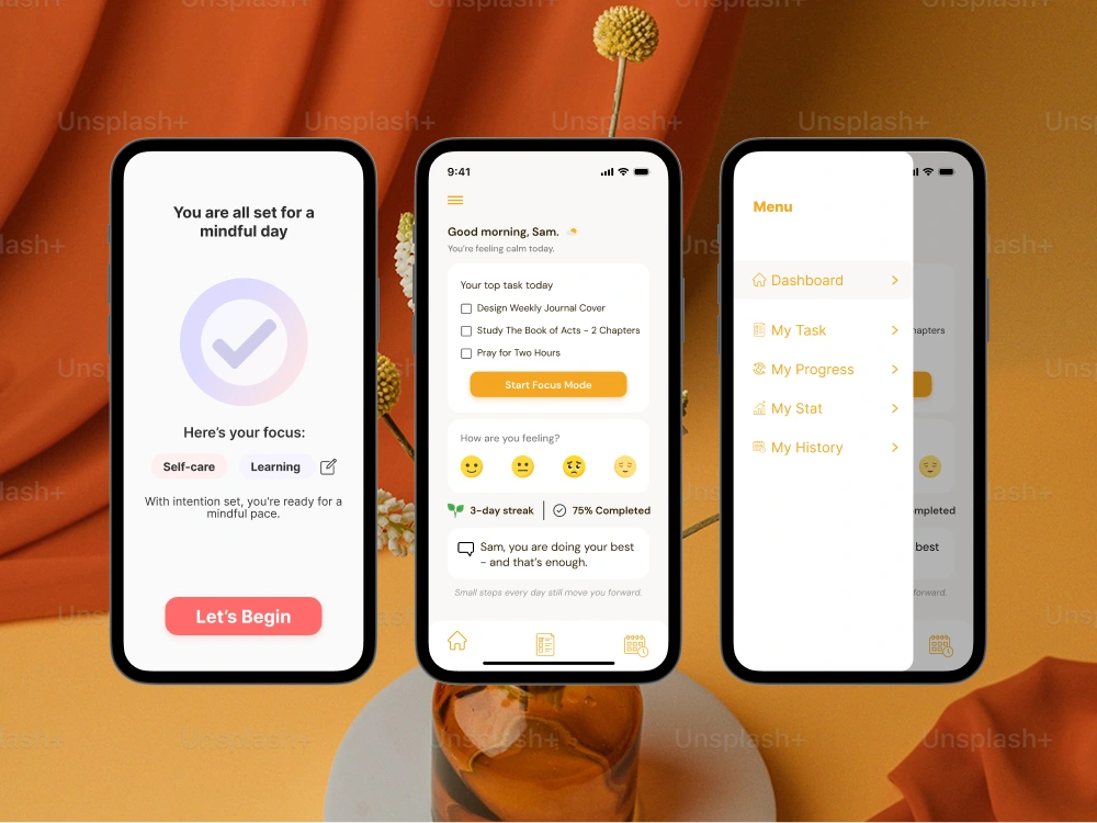 Mind-Task Calm is a conceptual productivity app that combines task management with mindfulness techniques to help users focus, stay calm, and beat overwhelm.