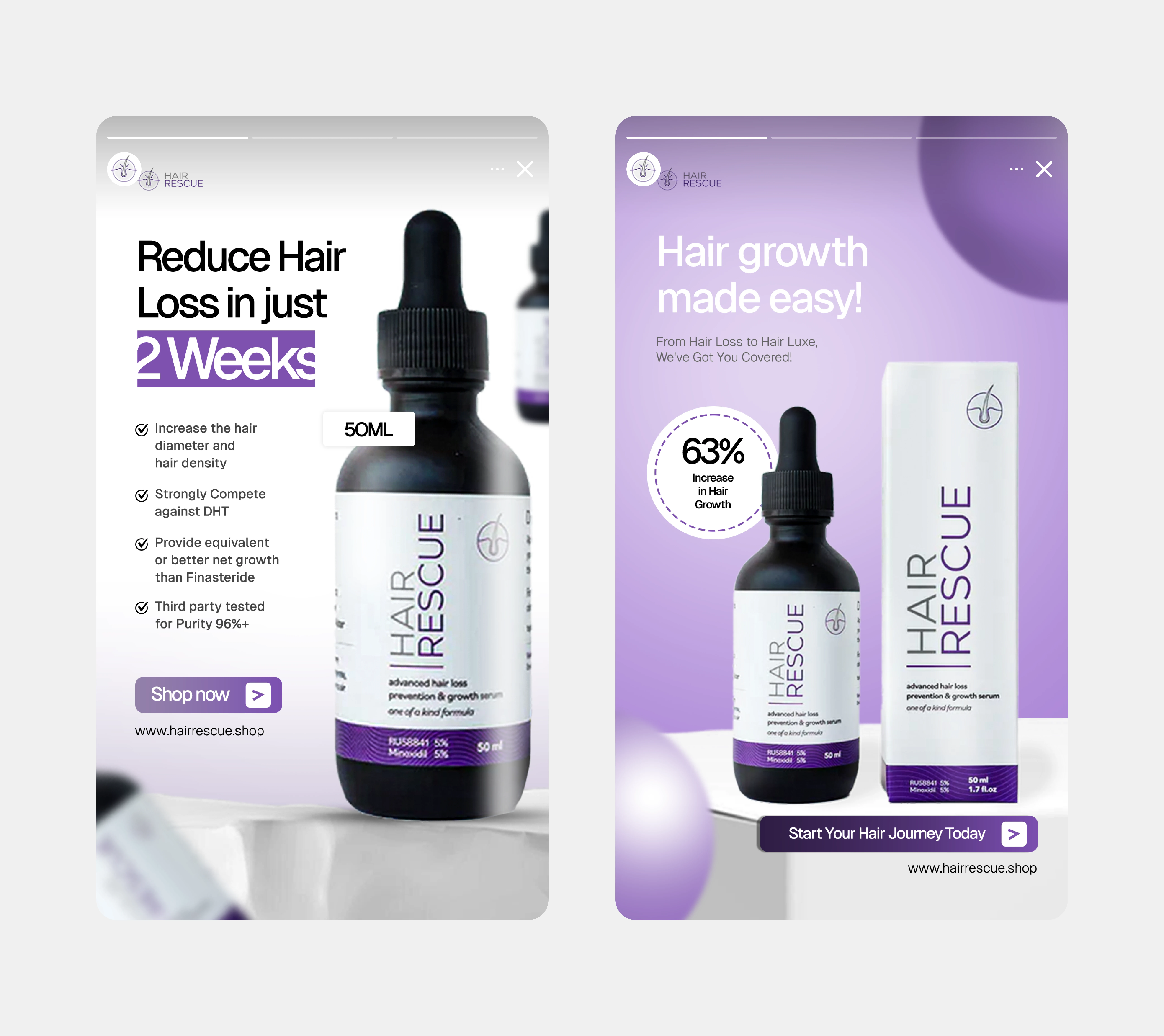 I led the design of static social media ads for Hair Rescue, handling the visual direction, layout composition, and final execution. My role focused on creating consistent, premium-looking creatives optimized for mobile platforms while aligning closely with the brand’s science-driven positioning.