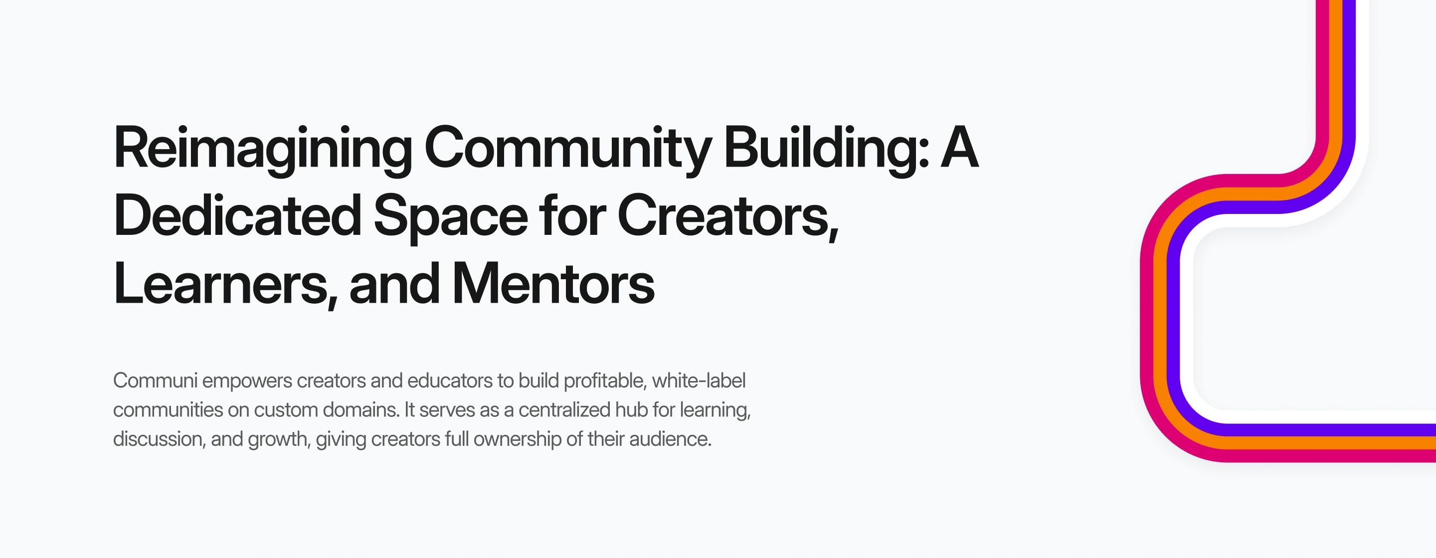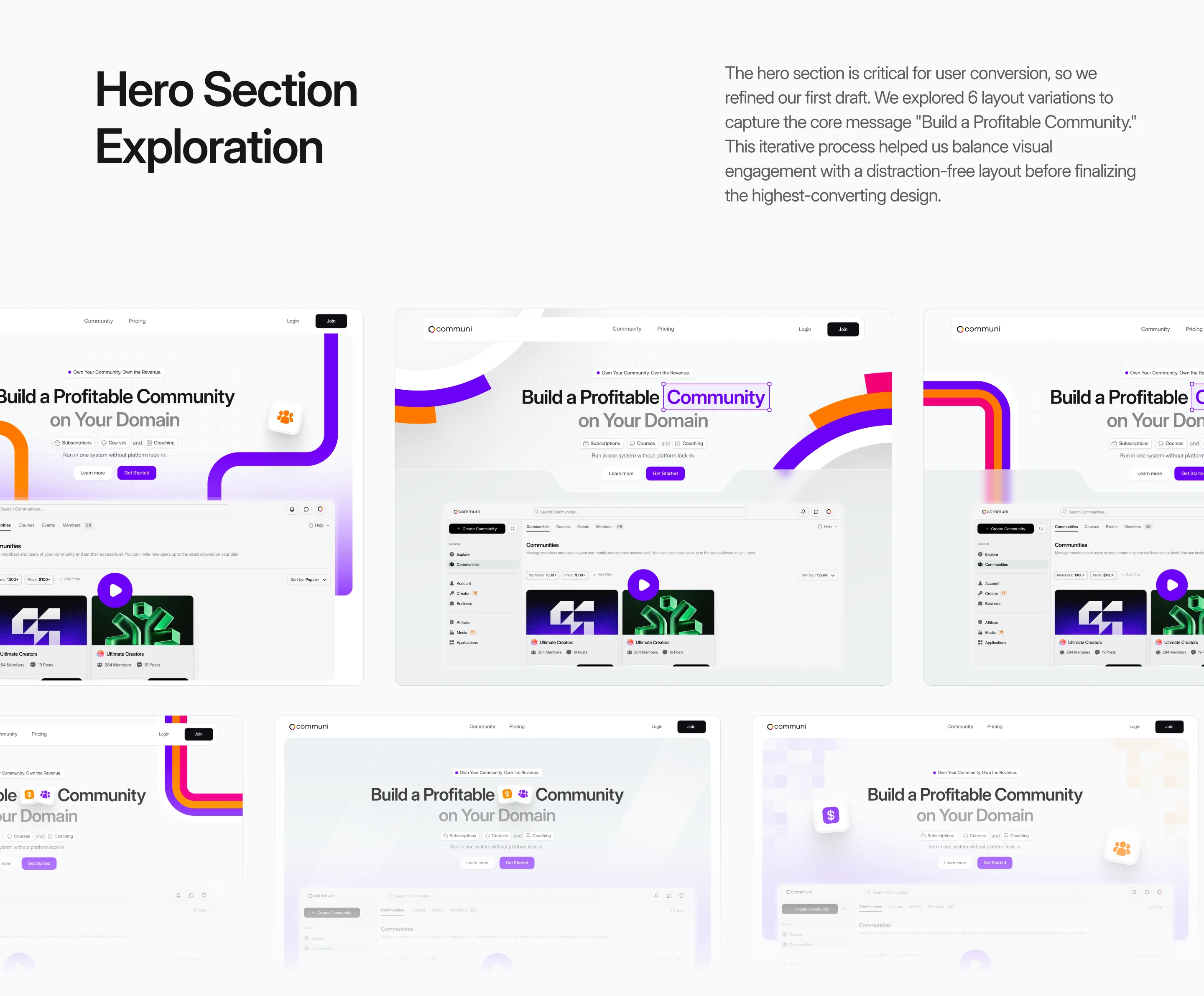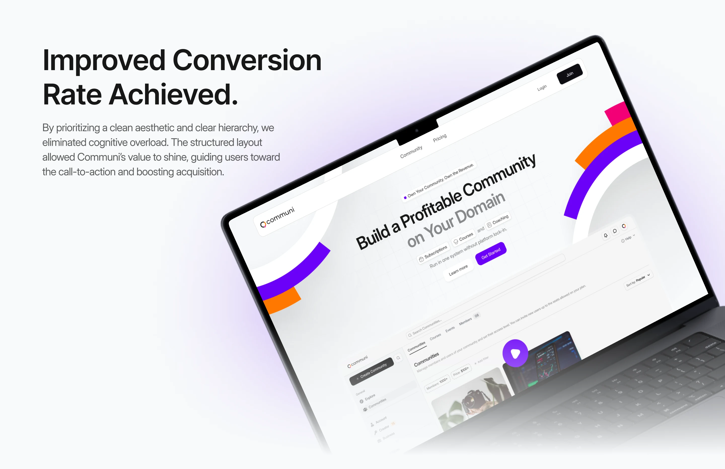 Communi partnered with us to design a high-converting landing page for their community platform — built for creators and educators who want to own their audience, their revenue, and their brand. The challenge was to communicate a product rich enough to support tens of thousands of members, while keeping the experience simple, focused, and built to convert.