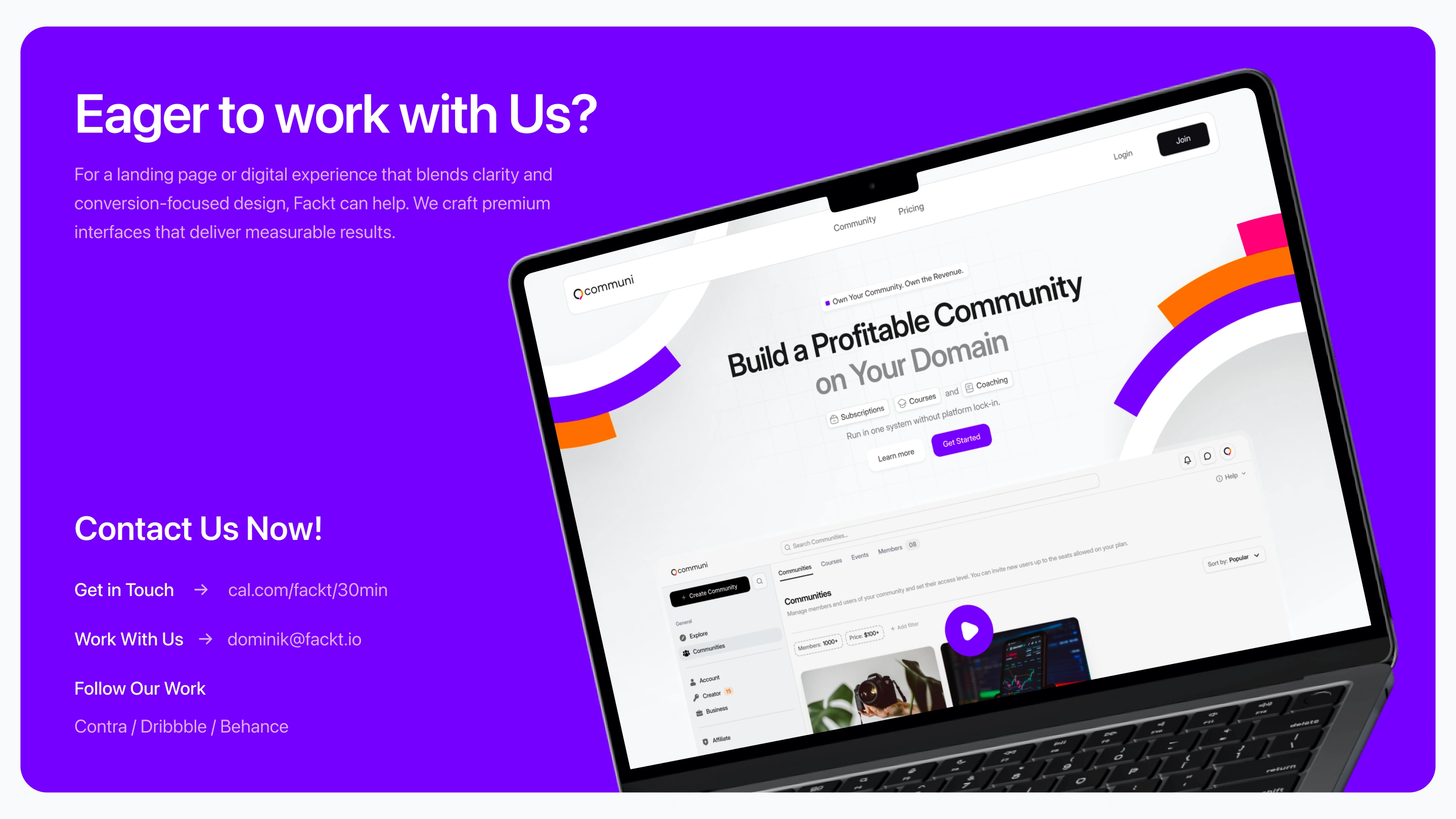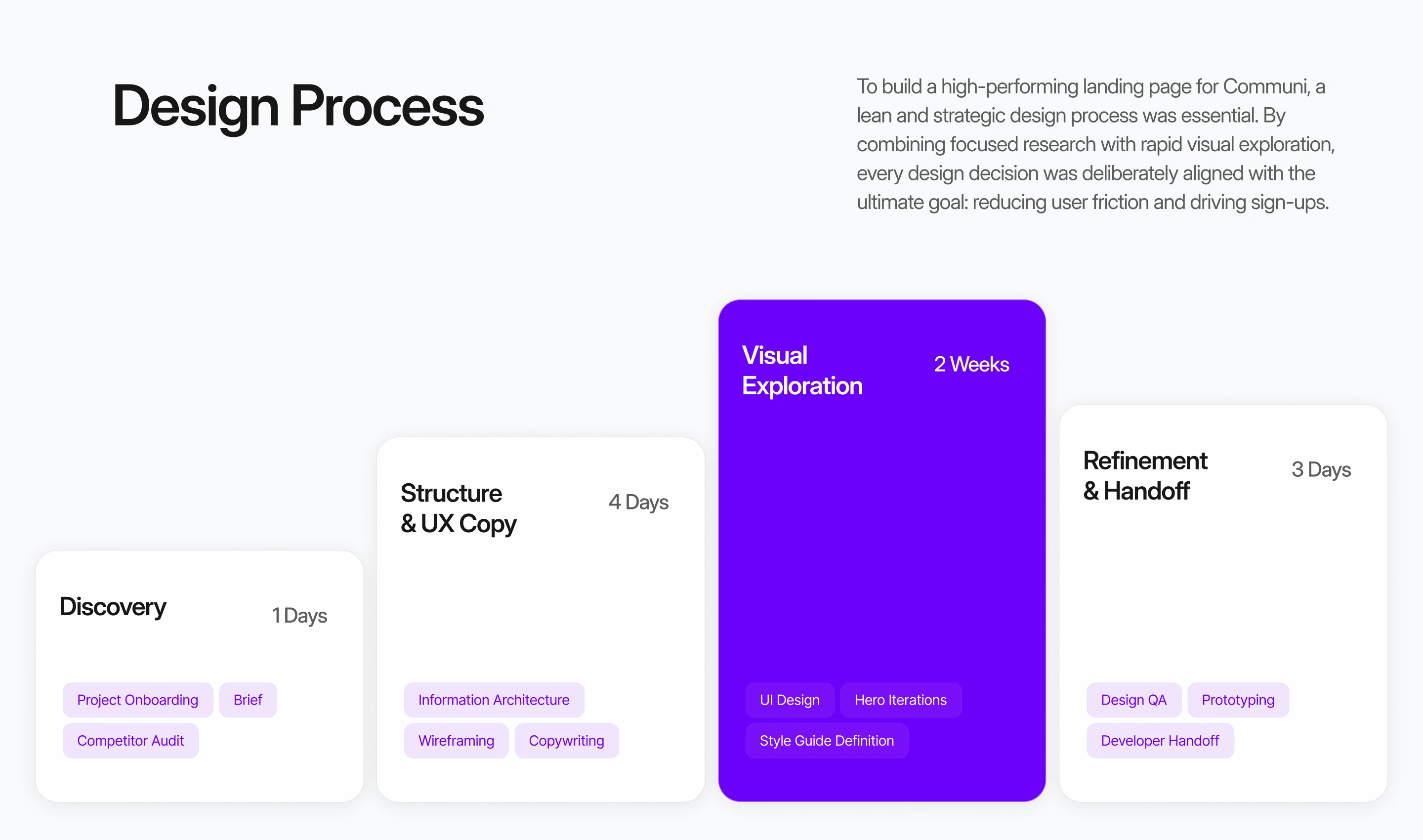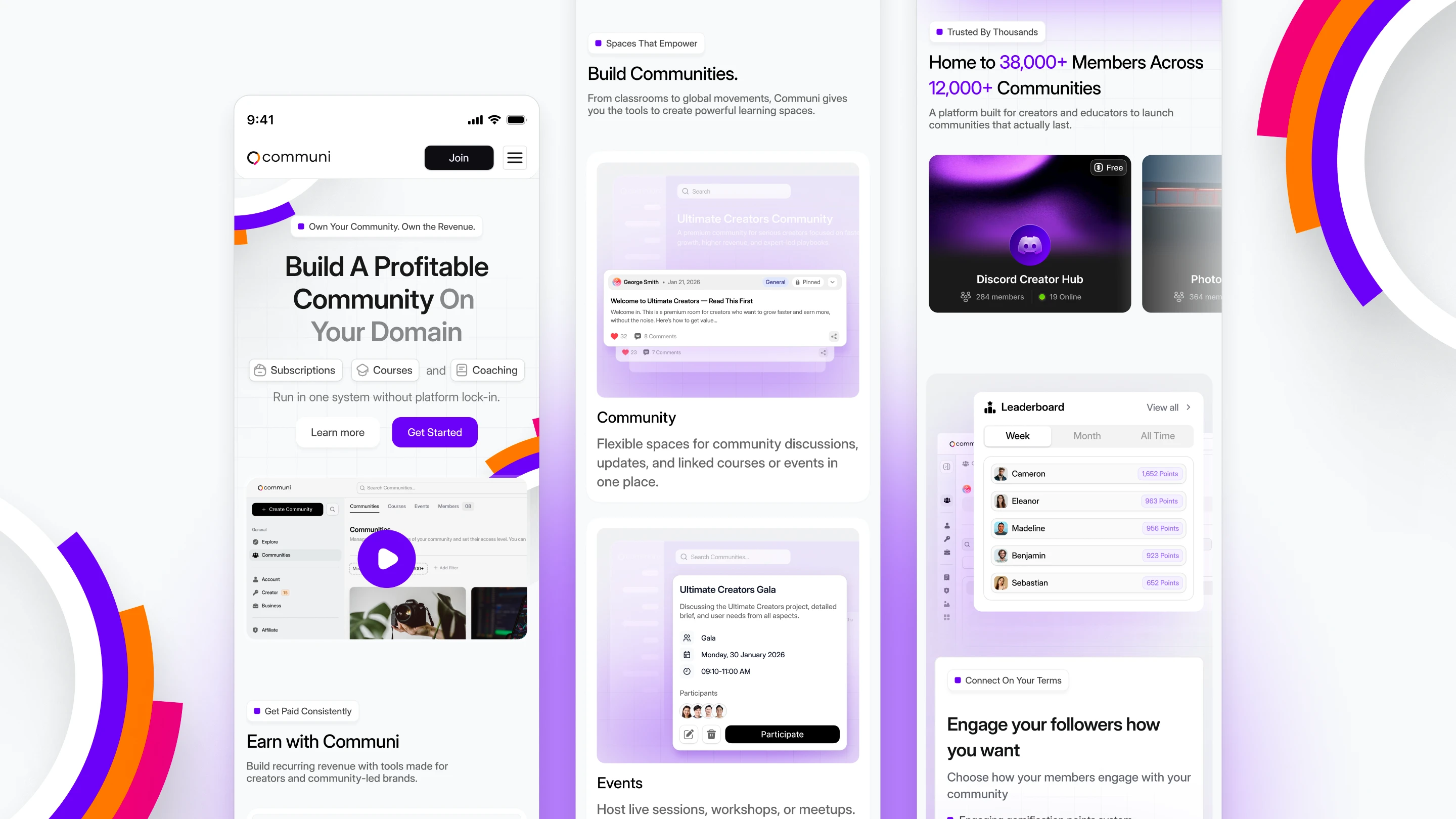 Communi partnered with us to design a high-converting landing page for their community platform — built for creators and educators who want to own their audience, their revenue, and their brand. The challenge was to communicate a product rich enough to support tens of thousands of members, while keeping the experience simple, focused, and built to convert.