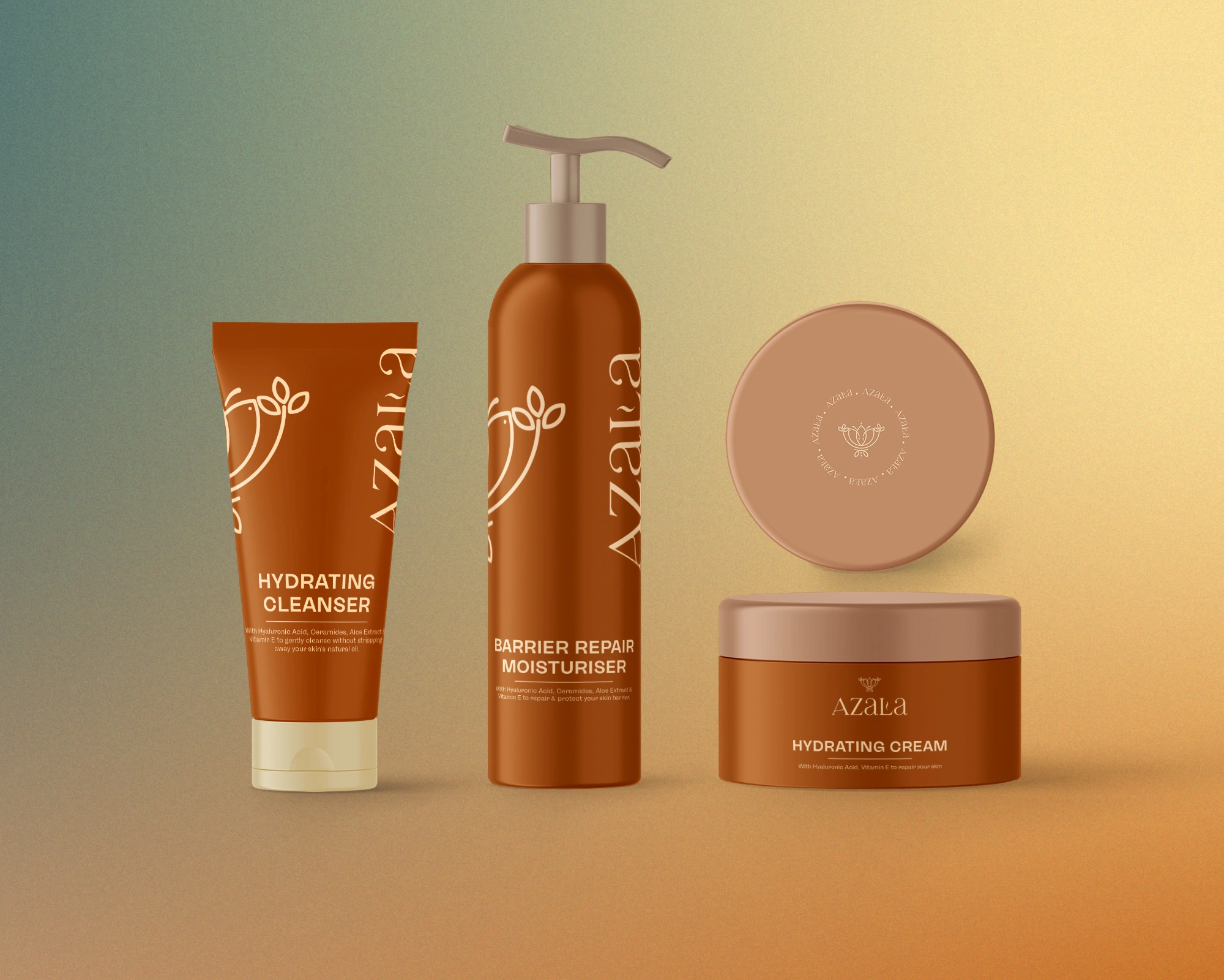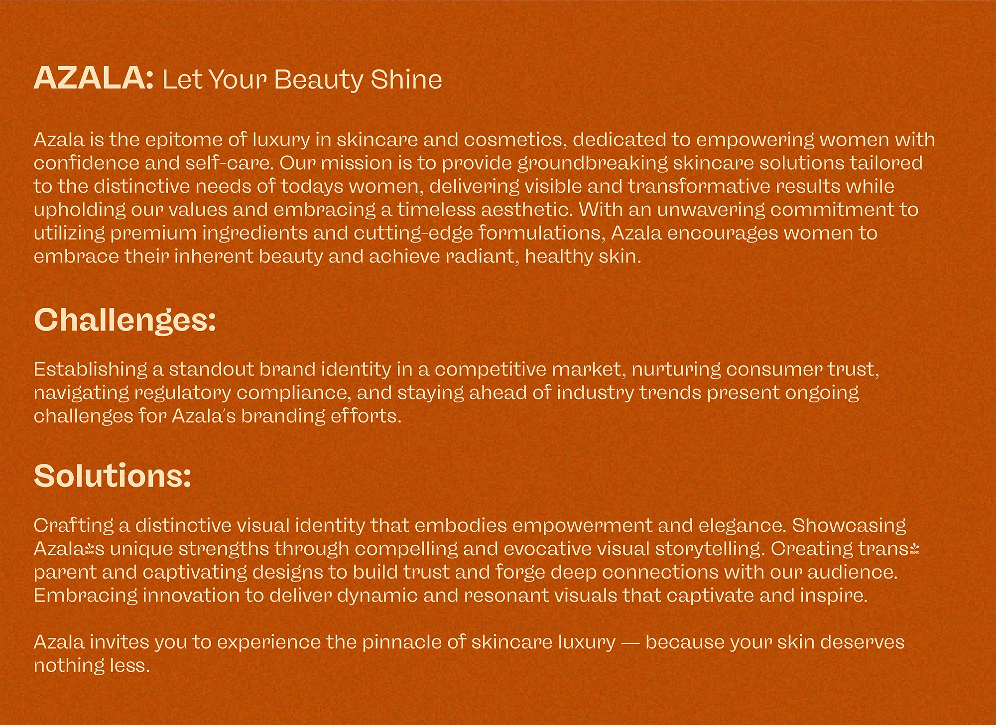 Azala is a luxurious and empowering skincare brand devoted to elevating beauty through premium ingredients, transformative results, and an unwavering commitment to self-care. It embodies elegance and confidence, blending modern sophistication with a timeless aesthetic. The rebranding of Azala’s packaging stems from a desire to create a radiant, aspirational identity that reflects the brand’s essence. Through our collaboration, we have refreshed Azala’s visual presence, capturing its commitment to purity, innovation, and empowering women to let their beauty shine.