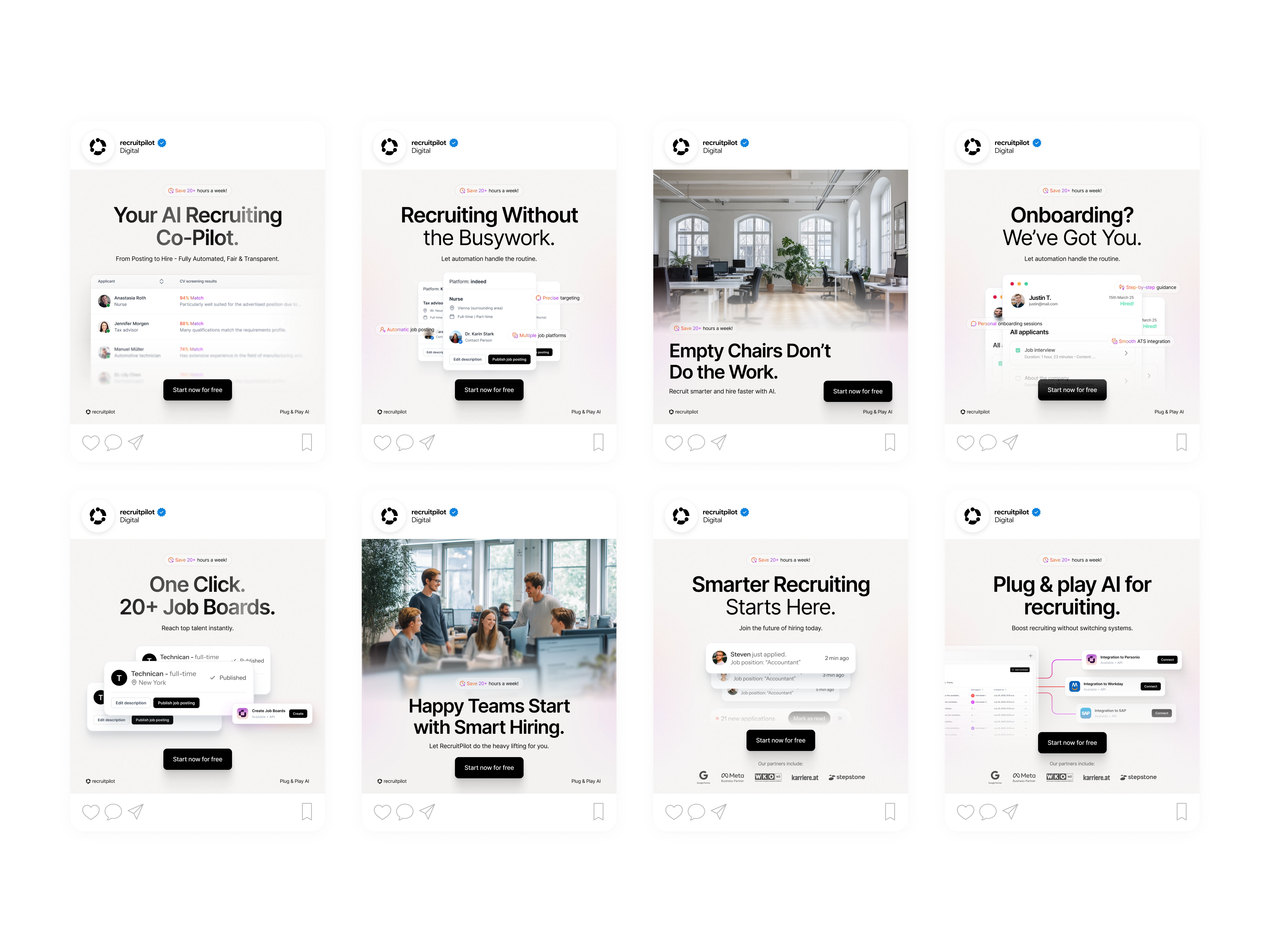 The goal was to boost click-through rates (CTR), click volume, and conversion rates through dynamic motion design and clear, persuasive messaging. The ads were optimized for multiple formats (Meta & LinkedIn) and focused on emotional appeal, bold typography, and modern animation — all designed to build trust and highlight RecruitPilot’s professional image.