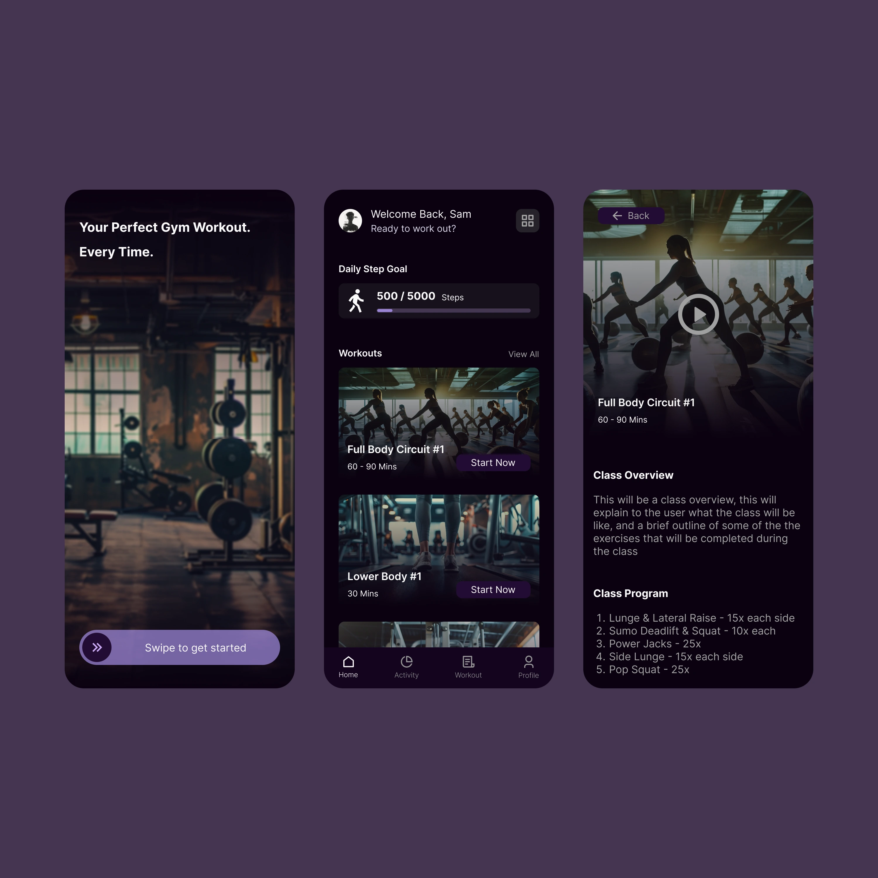 A concept for a health and fitness app that focuses on guiding users through various workouts and tracking their fitness journey that I designed.