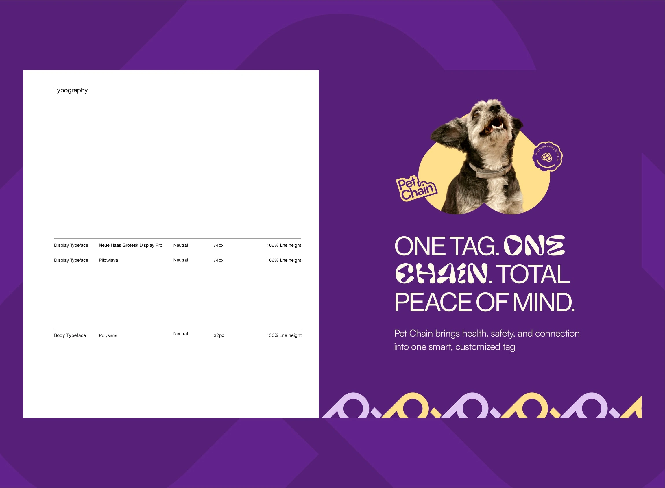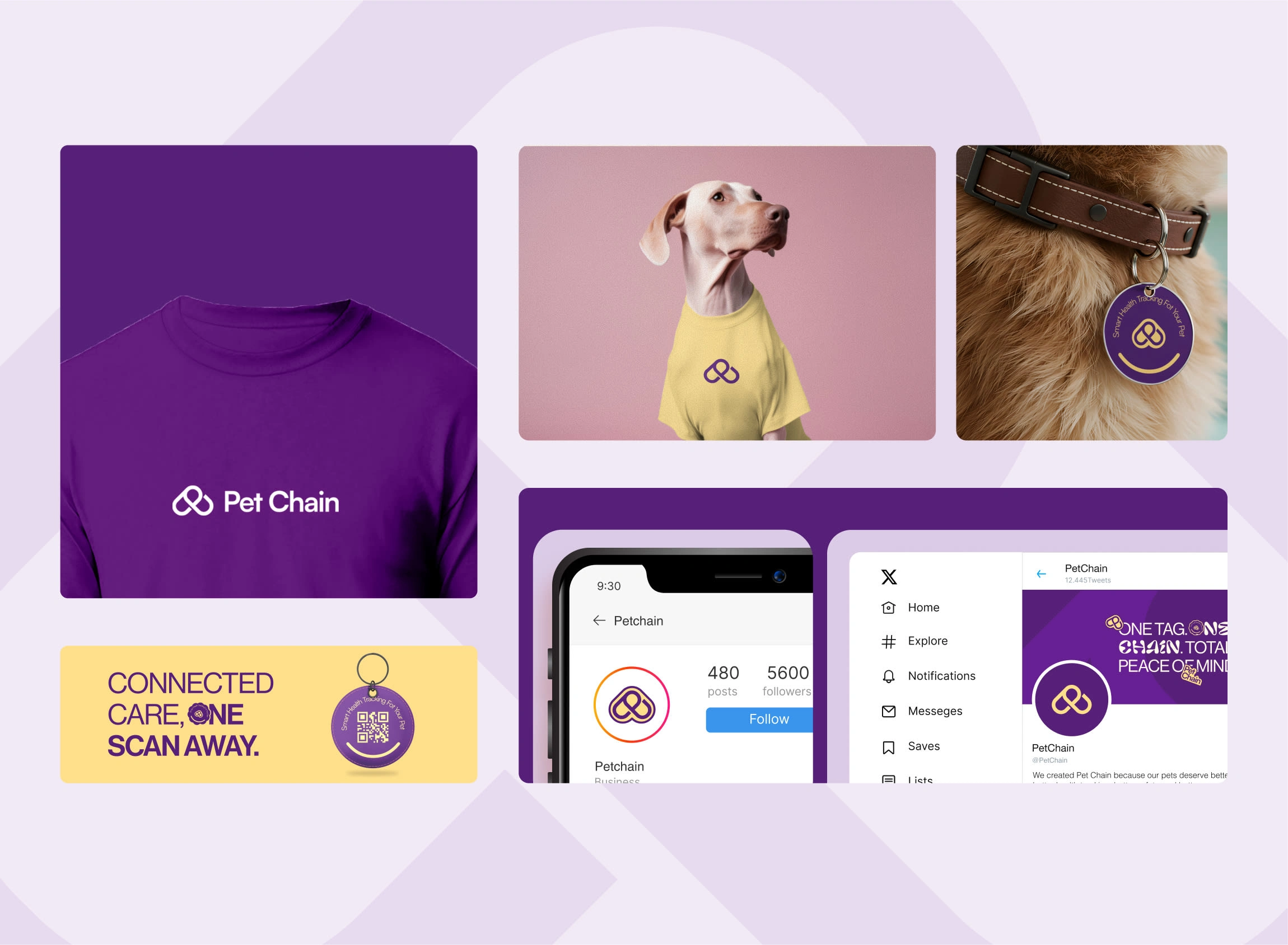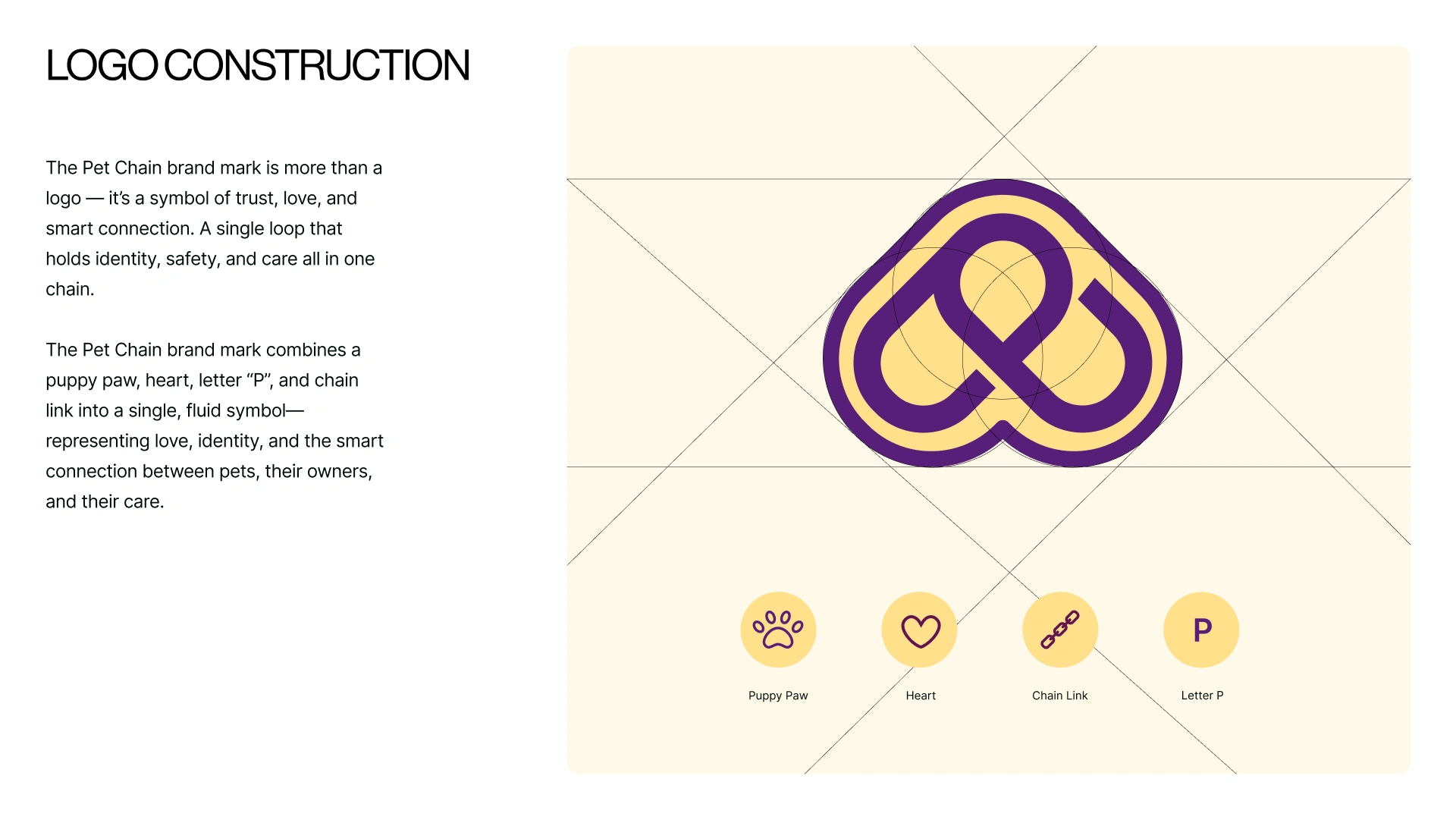 The Pet Chain brand design delivers a modern yet warm identity that balances technology with empathy. The visual system reflects security, connection, and care through clean lines, soft colors, and a symbol that unites a pet’s snout, a heart, the letter P, and a chain link. The result is a brand that feels trustworthy, innovative, and emotionally engaging, one that clearly communicates Pet Chain’s promise of keeping pets healthy, safe, and always connected.