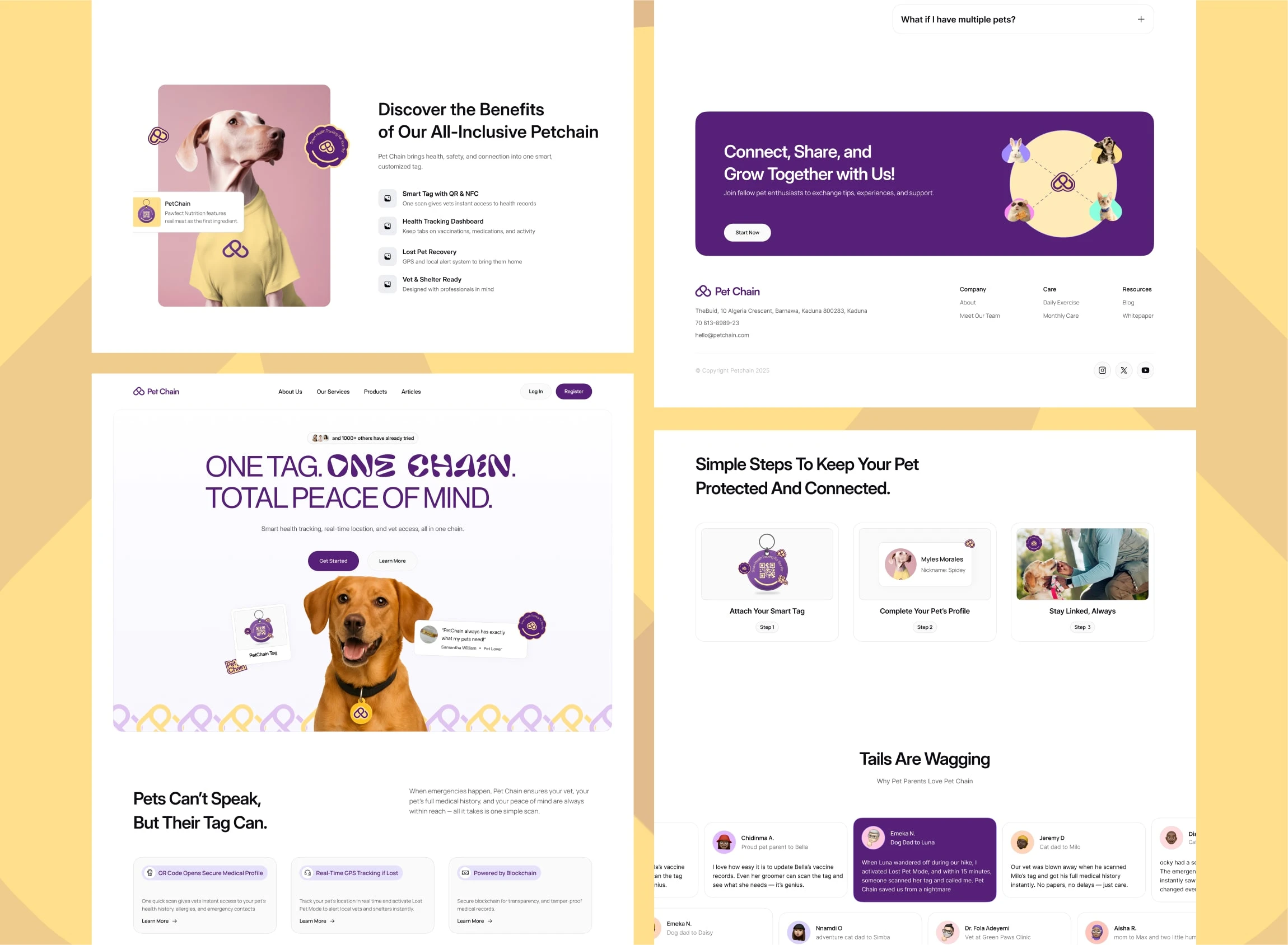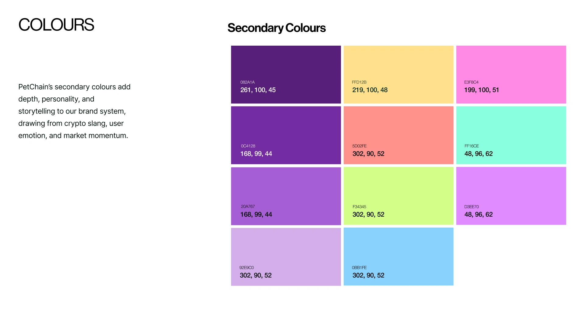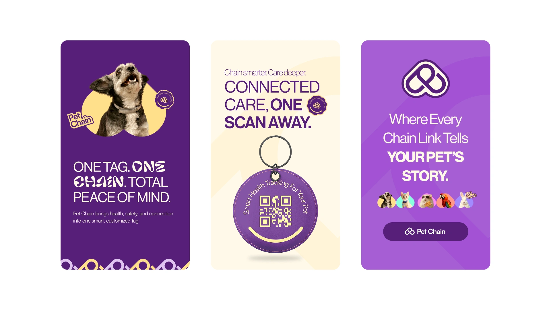 The Pet Chain brand design delivers a modern yet warm identity that balances technology with empathy. The visual system reflects security, connection, and care through clean lines, soft colors, and a symbol that unites a pet’s snout, a heart, the letter P, and a chain link. The result is a brand that feels trustworthy, innovative, and emotionally engaging, one that clearly communicates Pet Chain’s promise of keeping pets healthy, safe, and always connected.