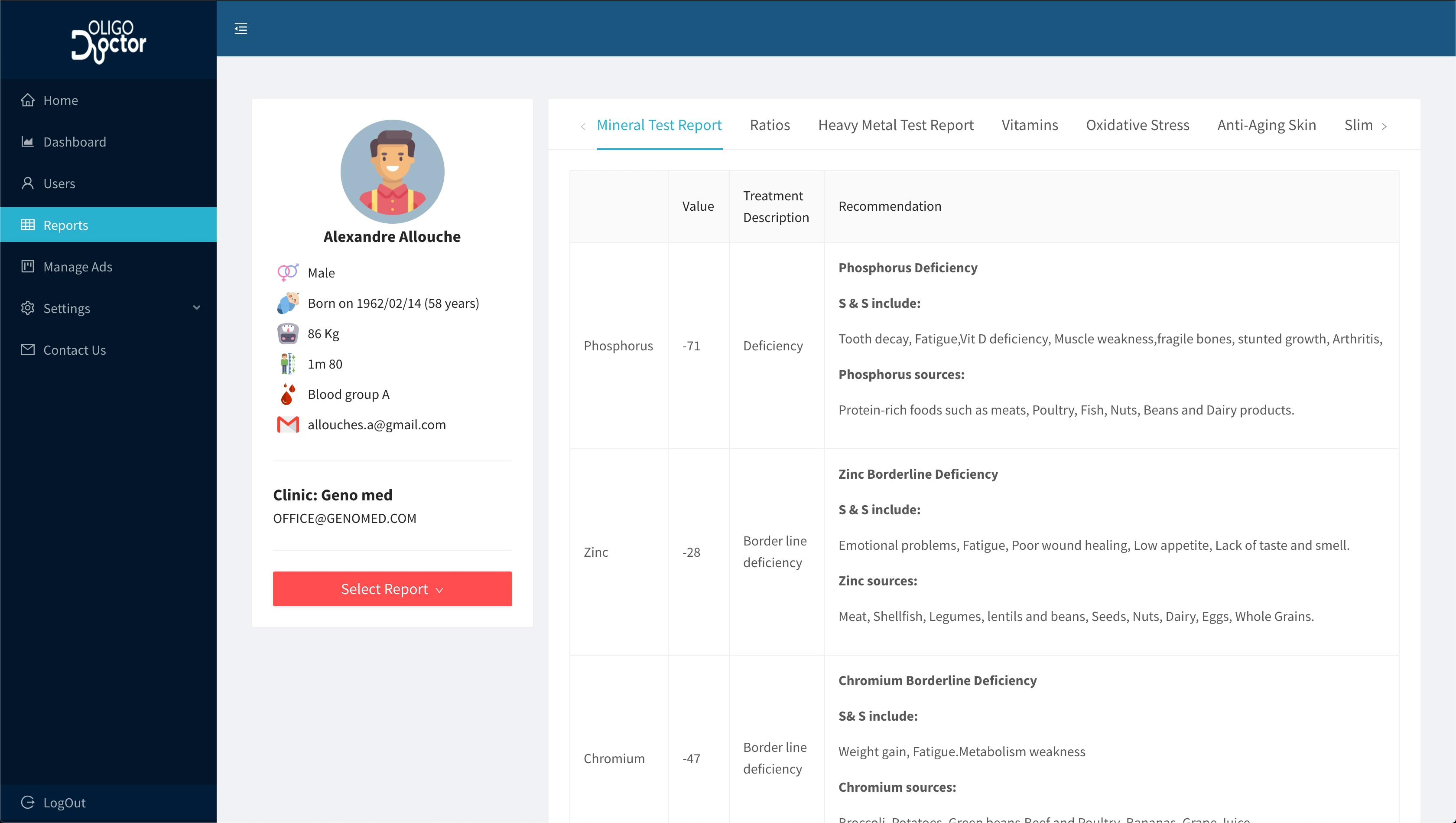 Oligo Doctor Is an analytical platform that is designed to help doctors analyses the results of Oligo-Check reports easily and instantly with minimum effort. This will free the Doctors to the more important tasks of educating their patients on how to improve their health based on the results of the Oligo-Check test and their other clinical assessments.